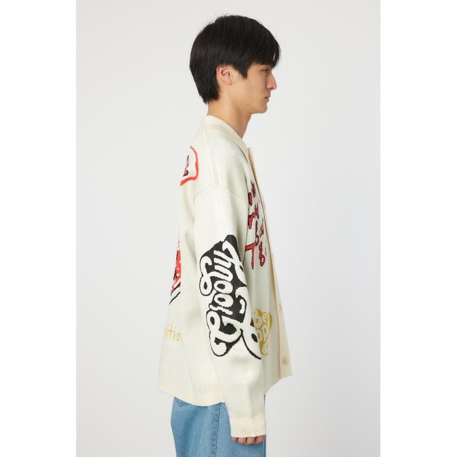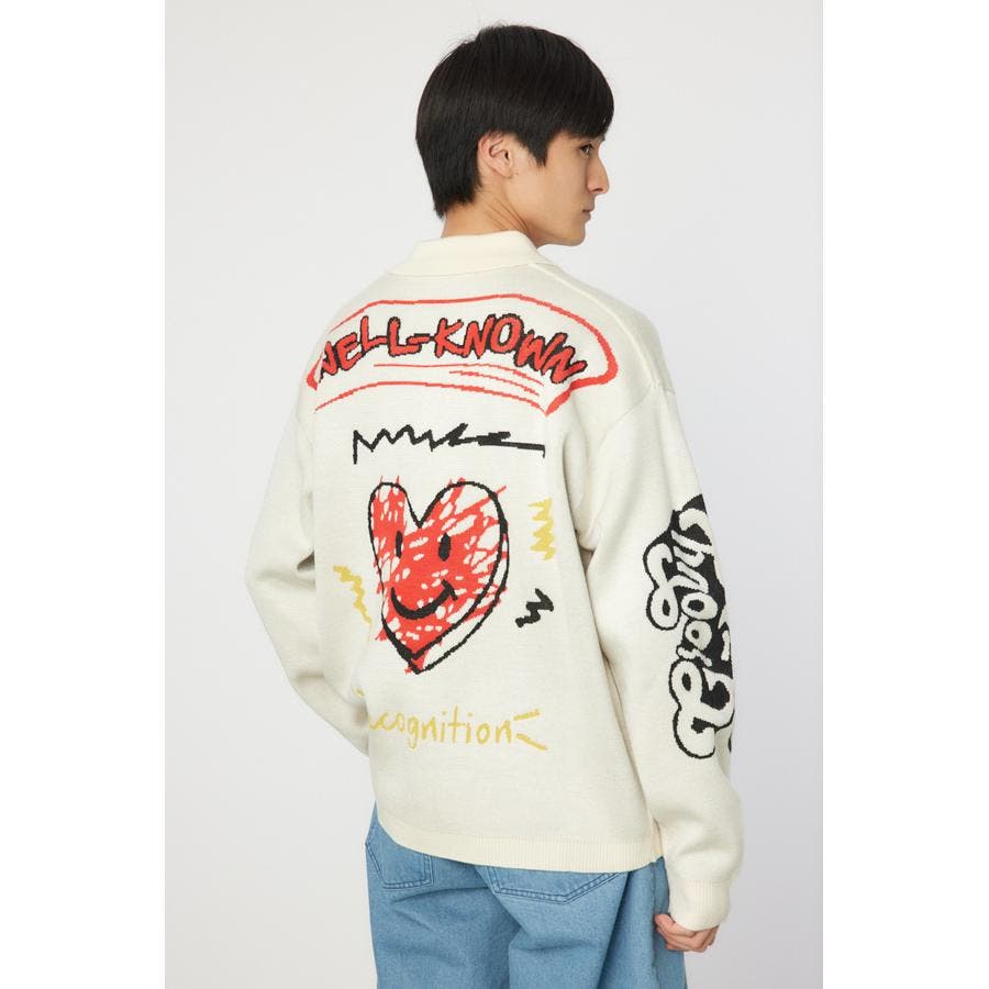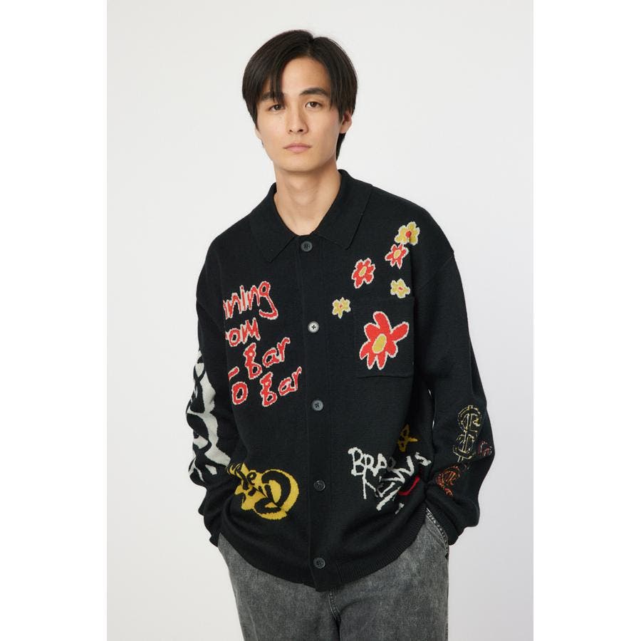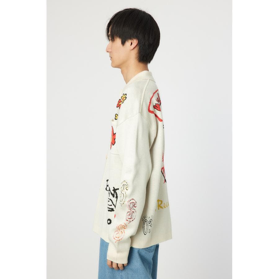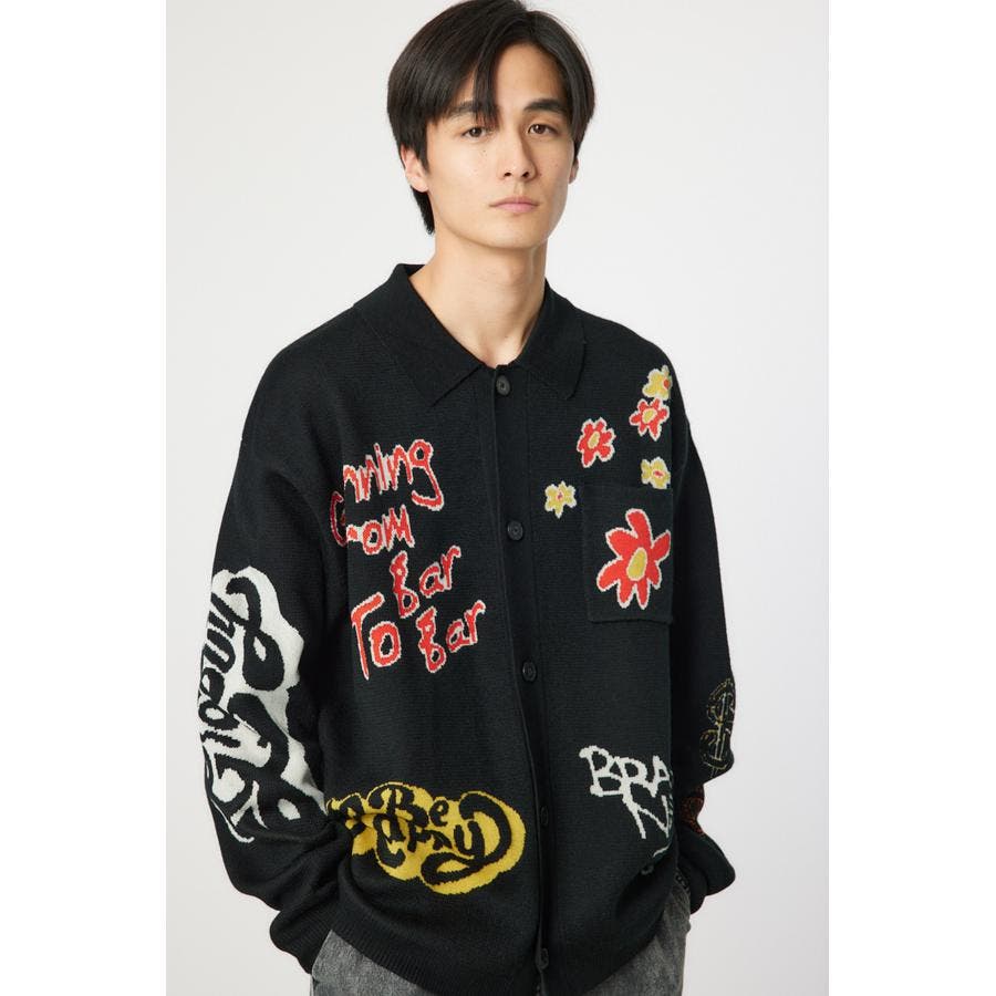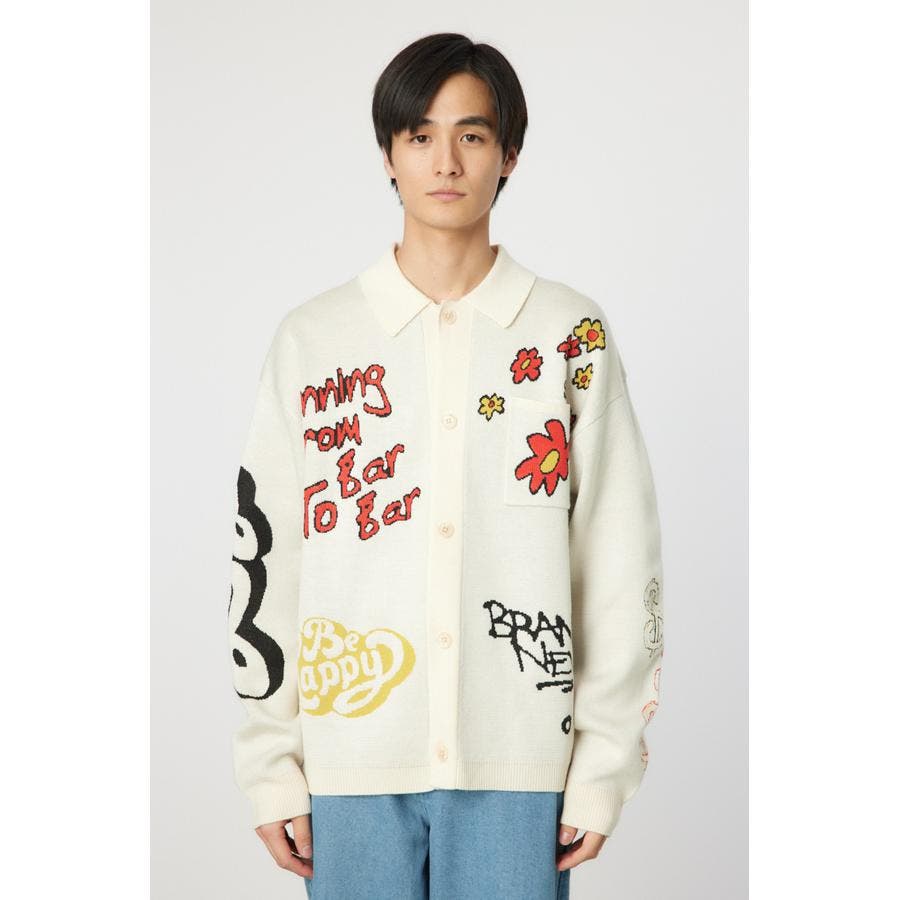 ボディ全面に施された大胆な手描き風デザインが目を引くニットカーディガン。