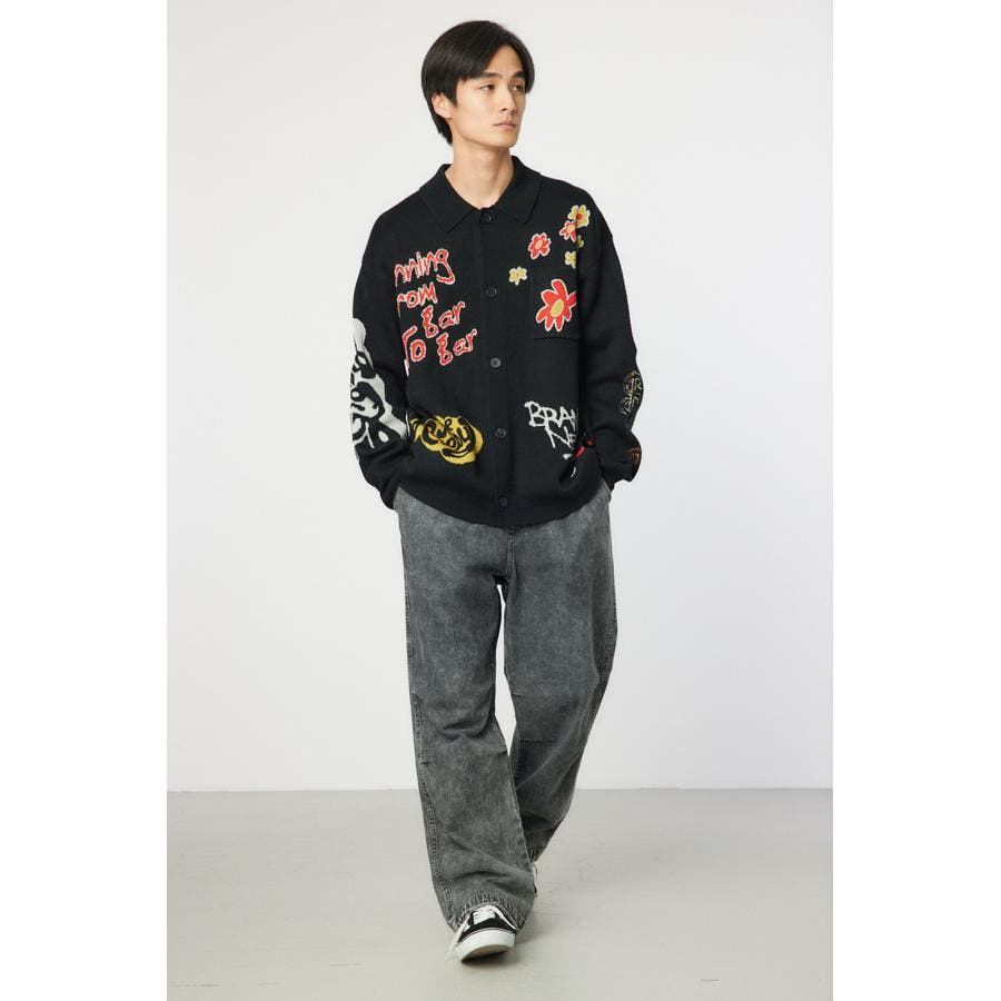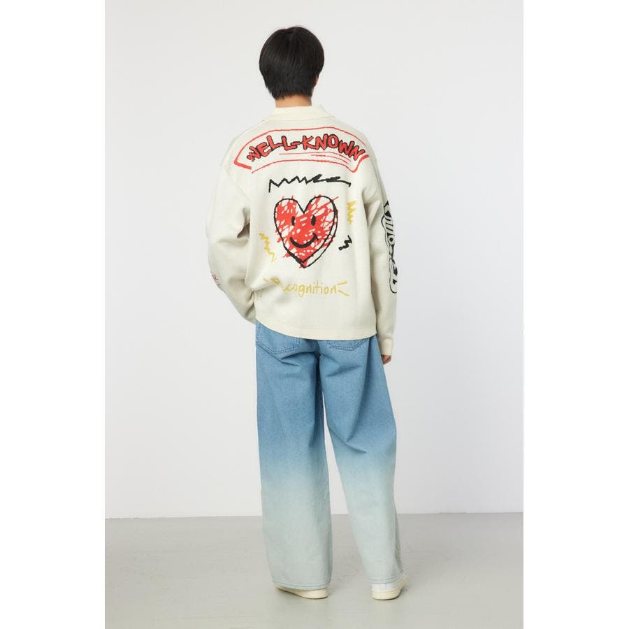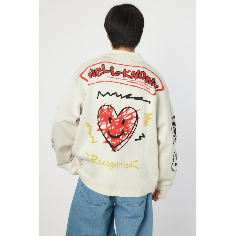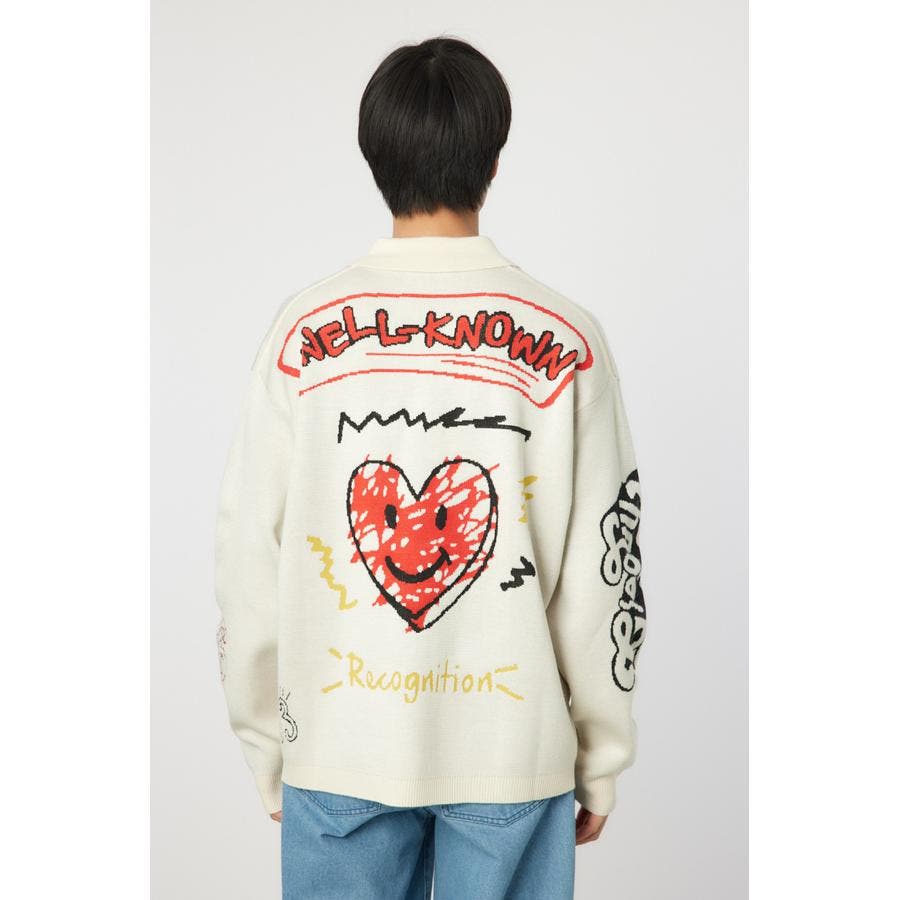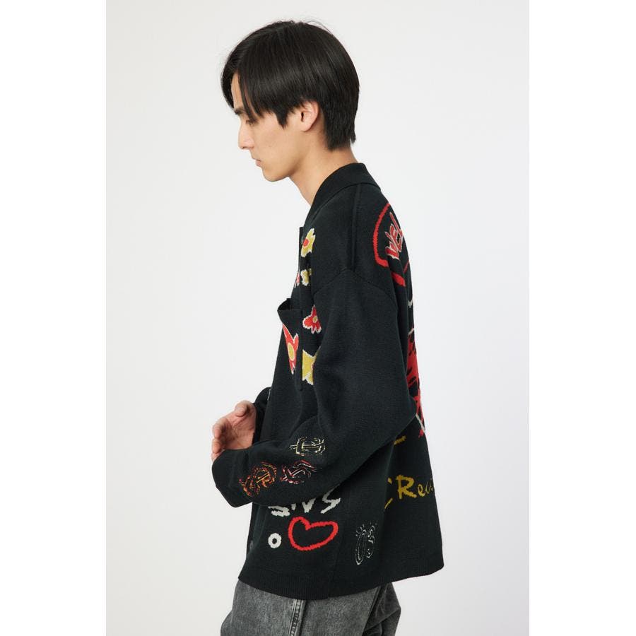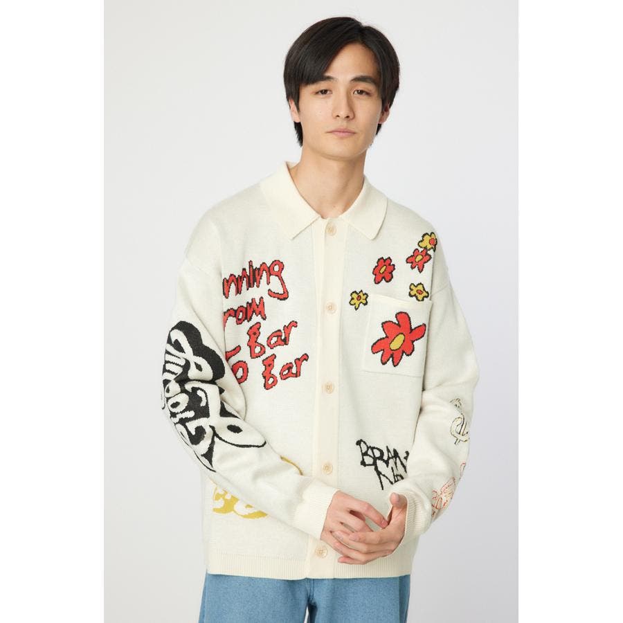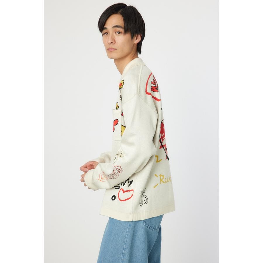 ボディ全面に施された大胆な手描き風デザインが目を引くニットカーディガン。