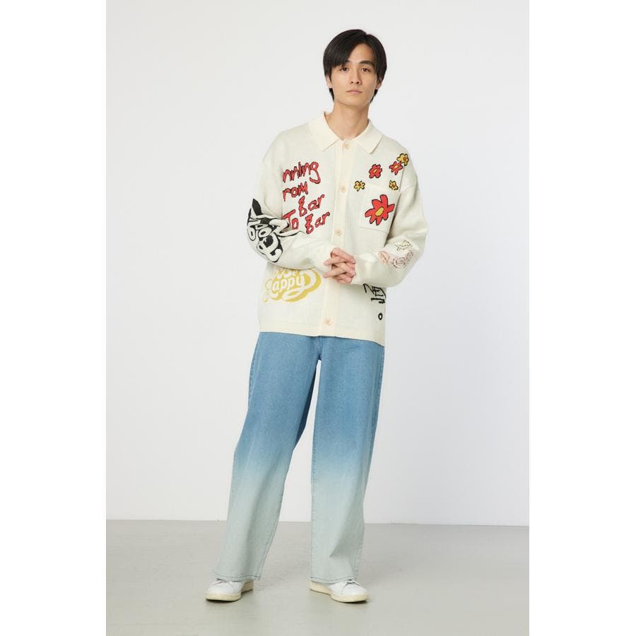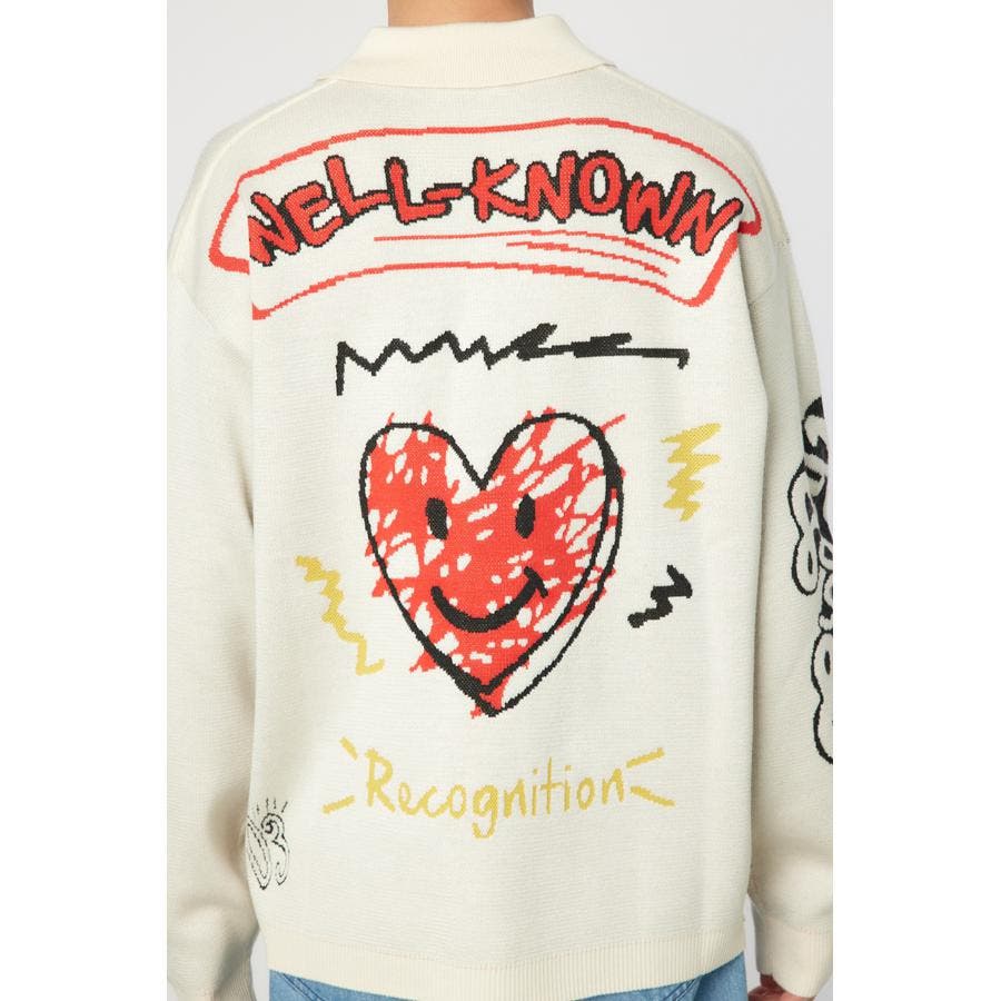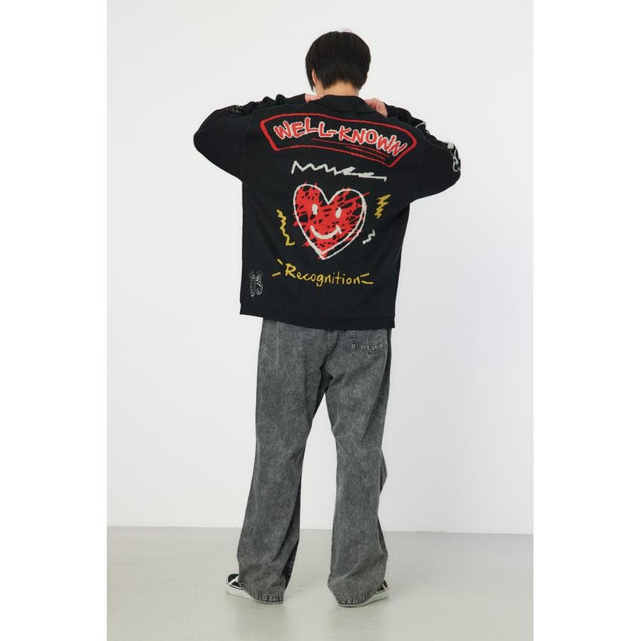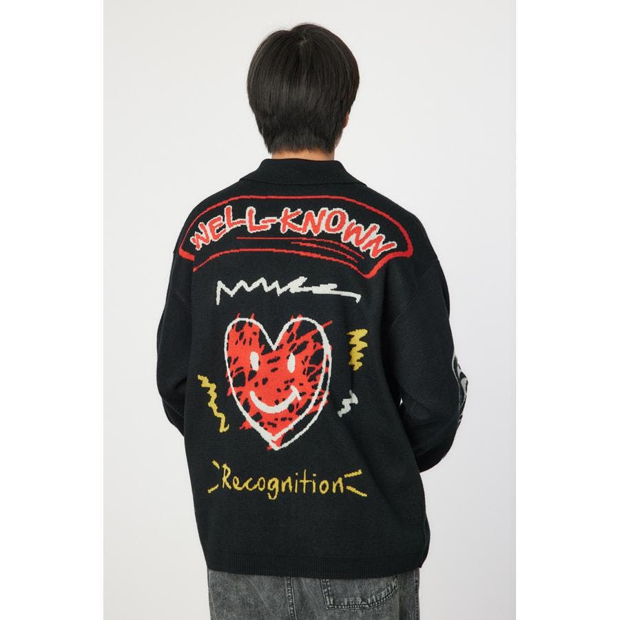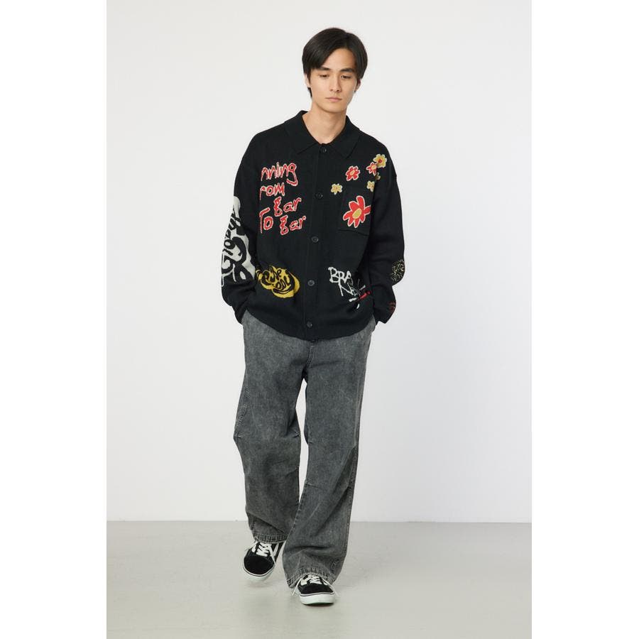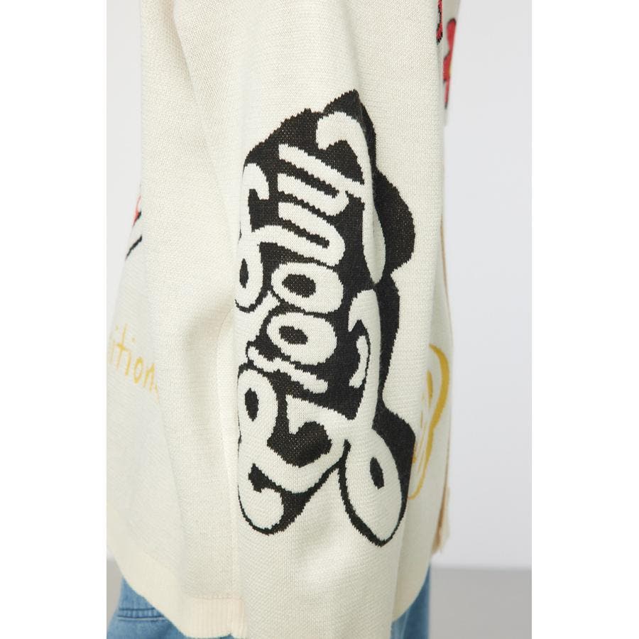 ボディ全面に施された大胆な手描き風デザインが目を引くニットカーディガン。