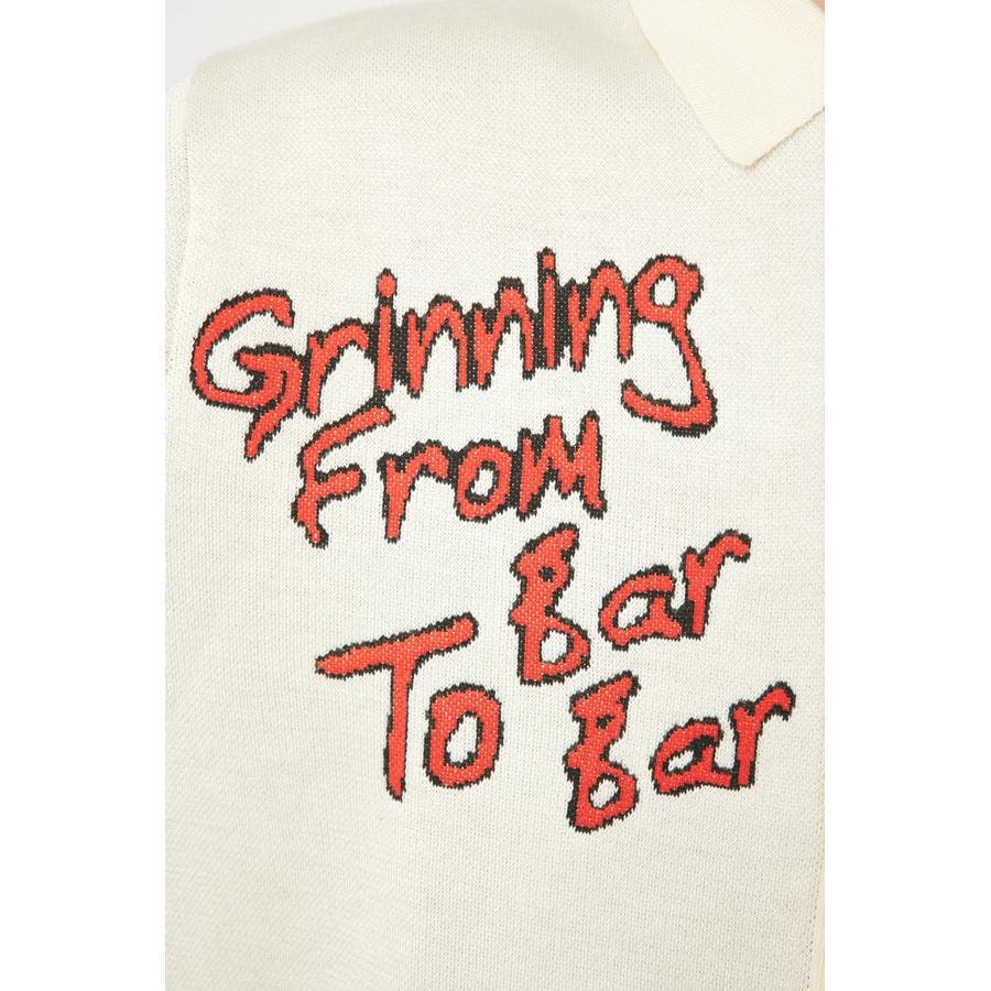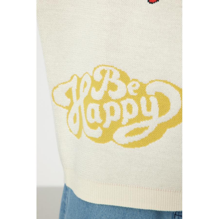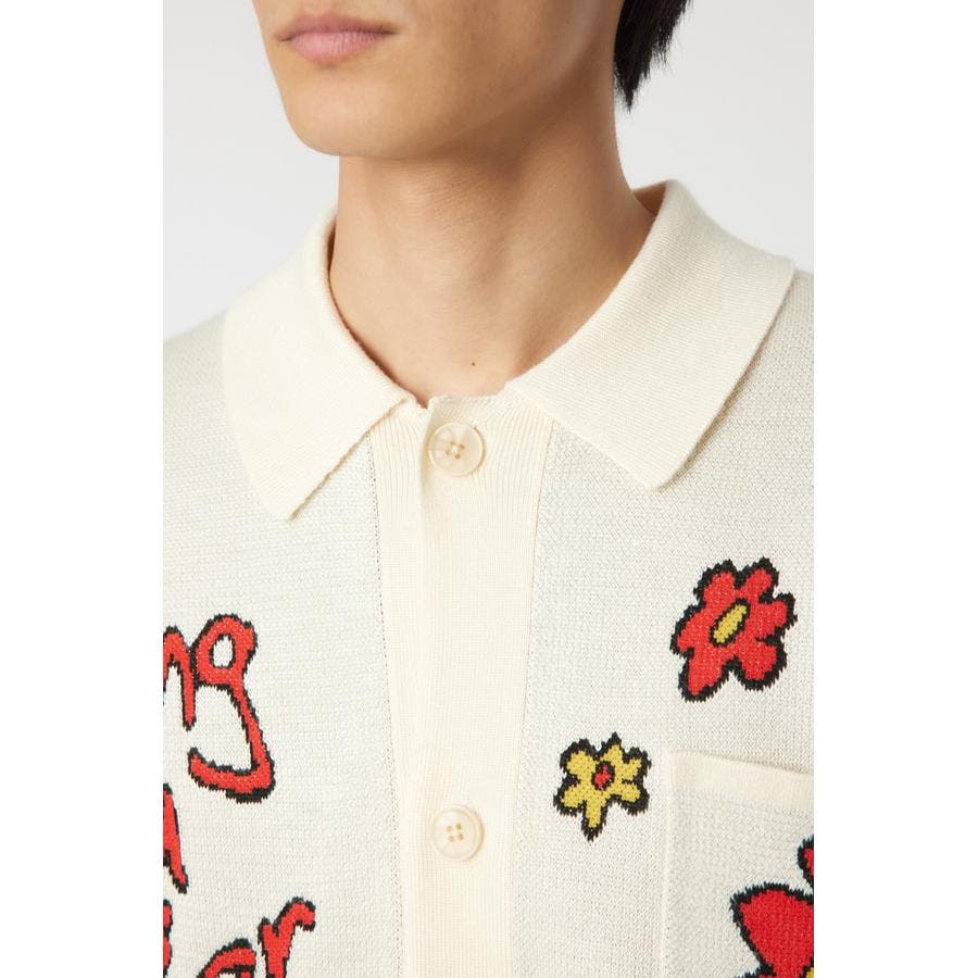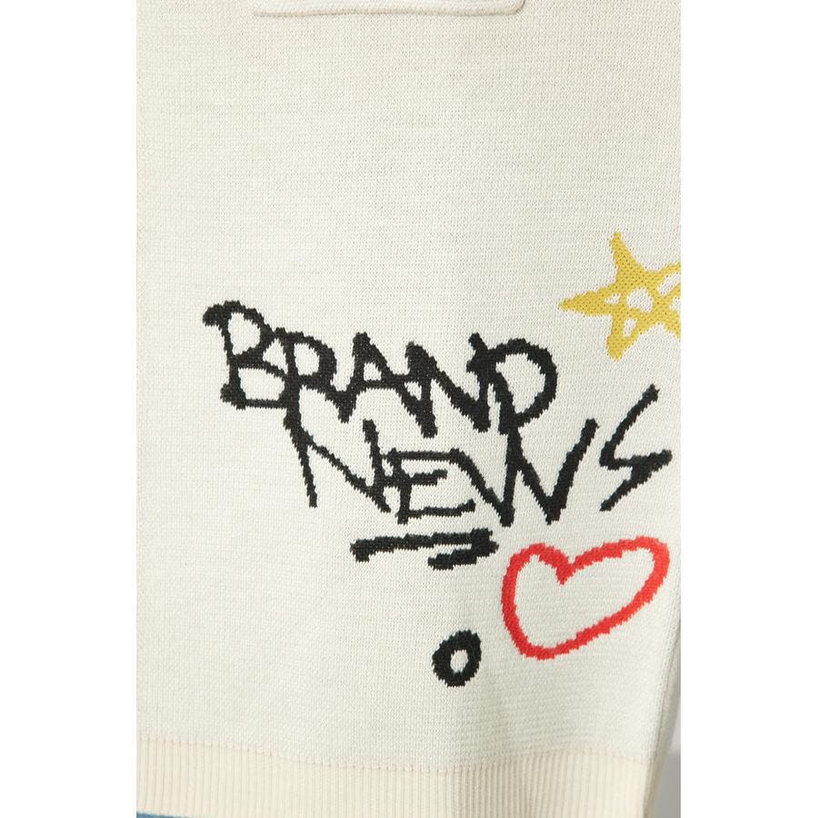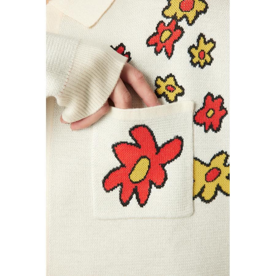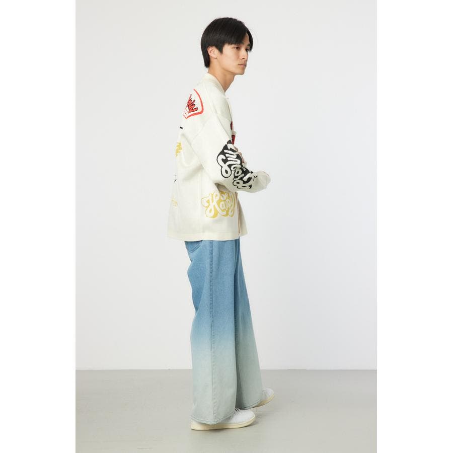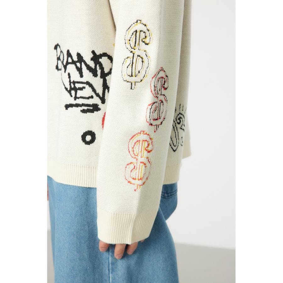 ボディ全面に施された大胆な手描き風デザインが目を引くニットカーディガン。