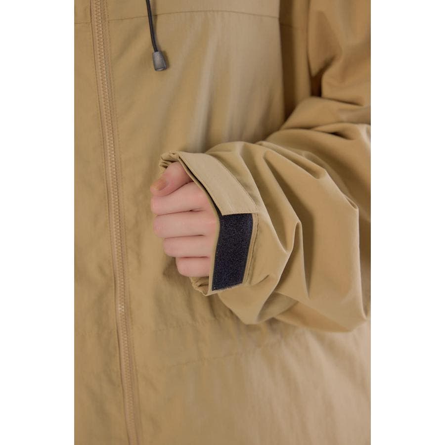 袖口はサイズ調整用のベルクロ付きタブ、フード口と裾口はストッパー付きのコード通しがあります。
