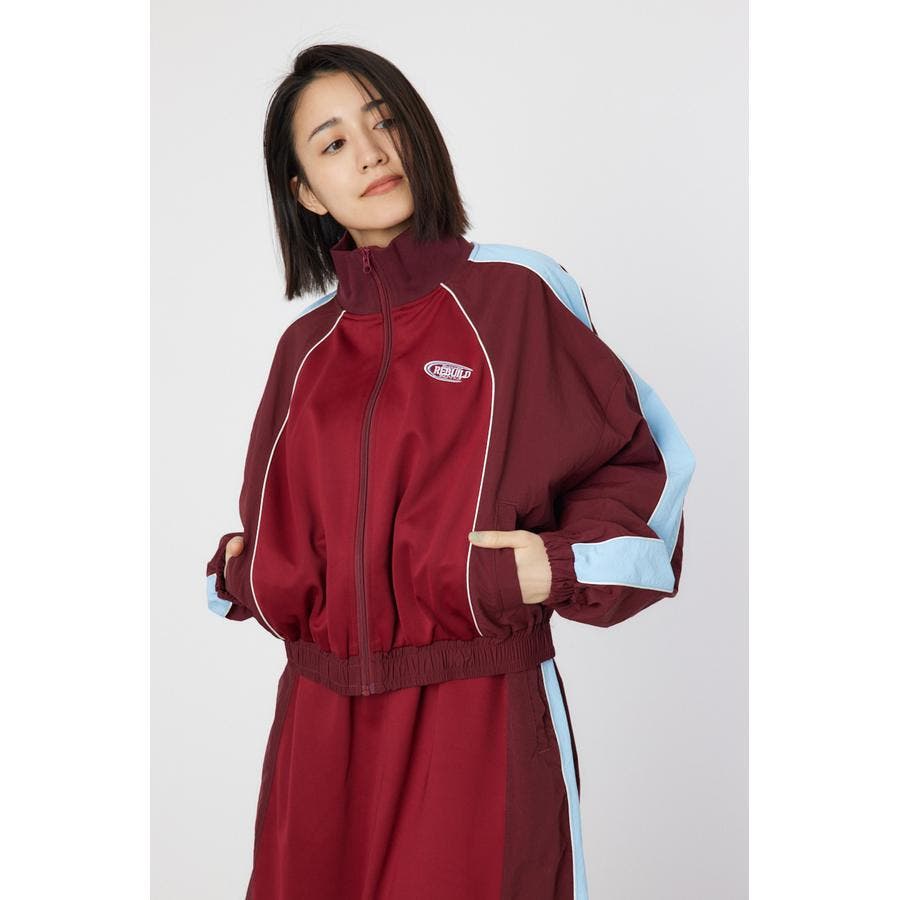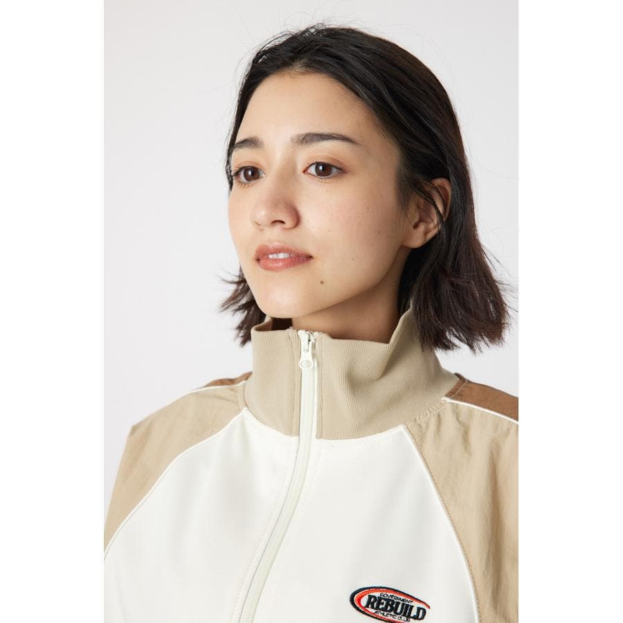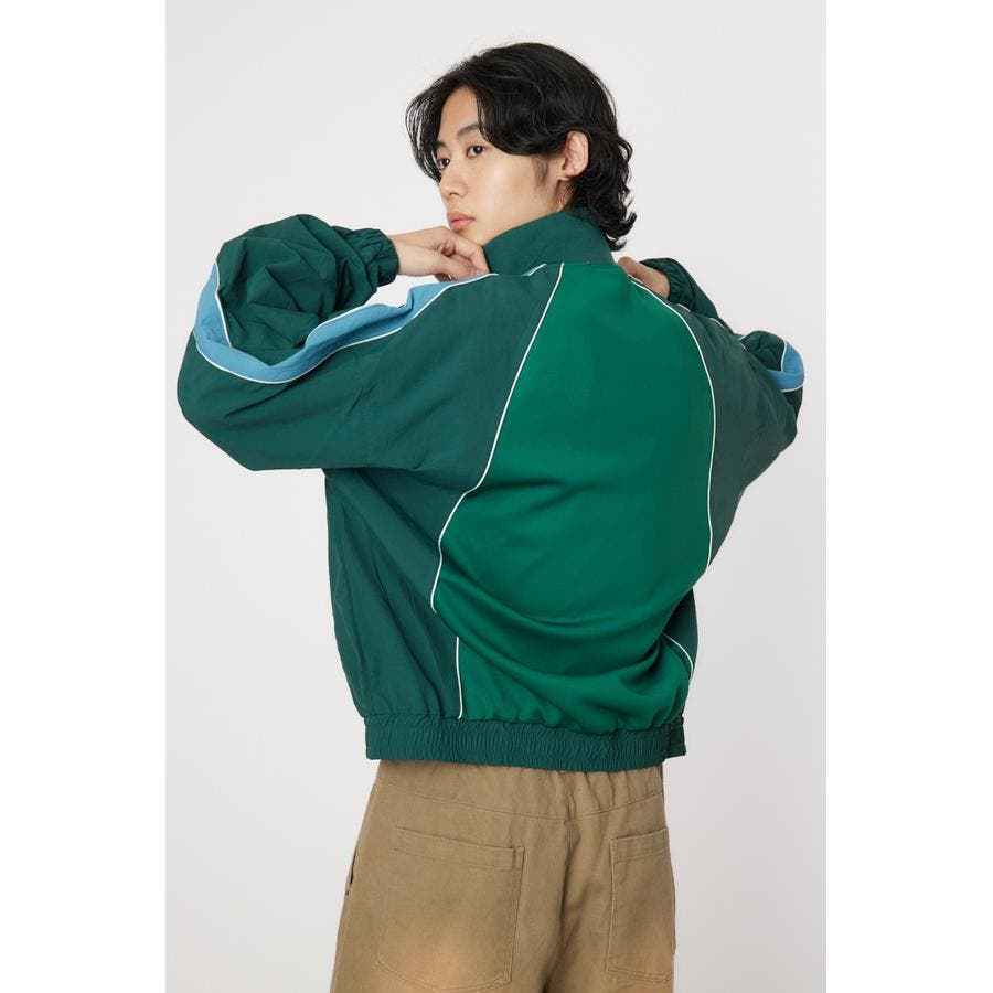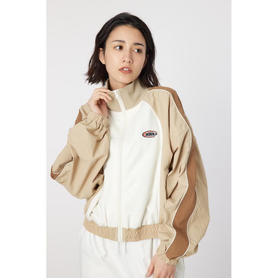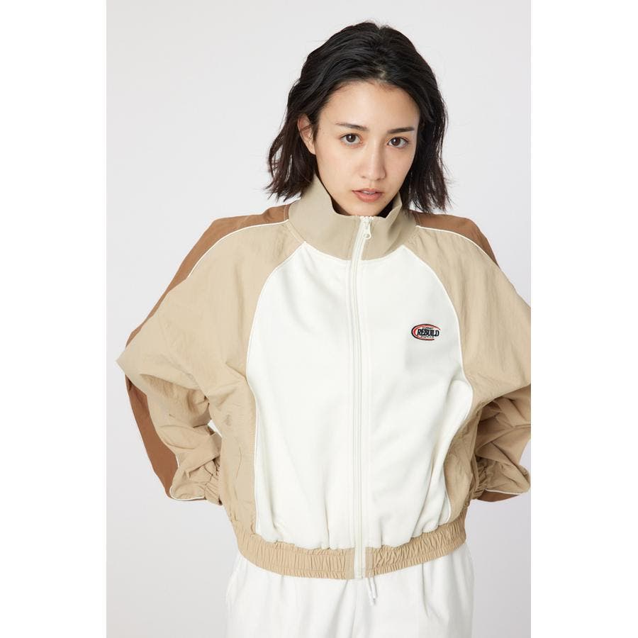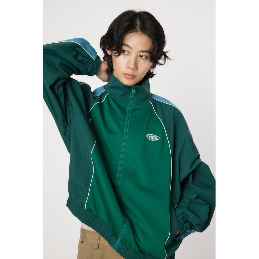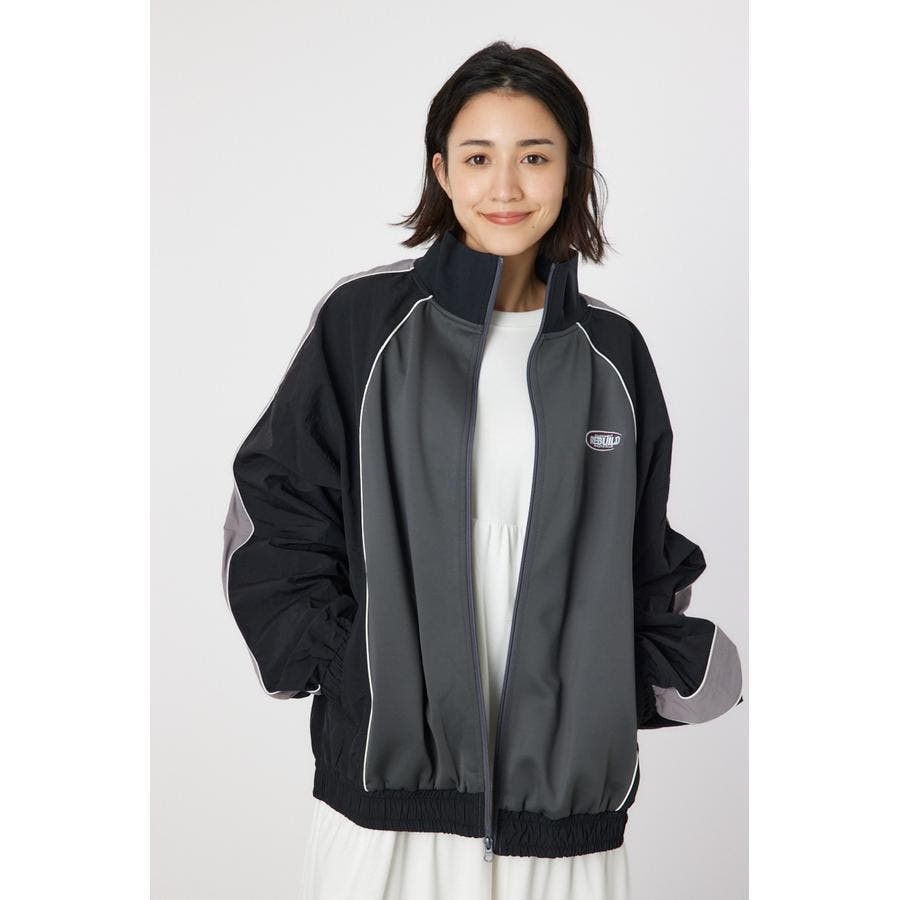 ジャージとナイロンをドッキングしてリメイク風に仕上げたトラックジャケット。インパクトがあるので、羽織るだけで主役になるアイテム。Mサイズは短丈、Lサイズはユニセックスで着用できます。