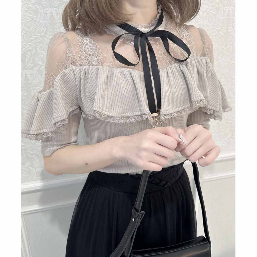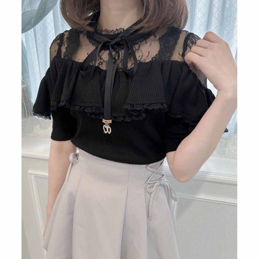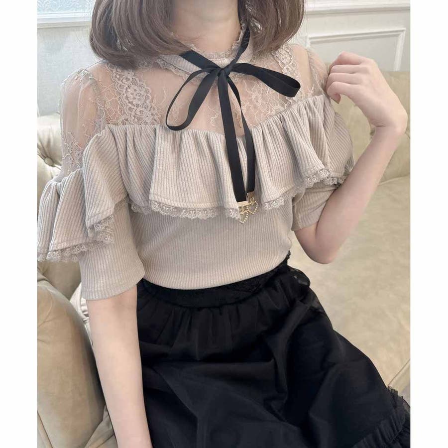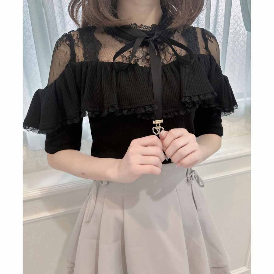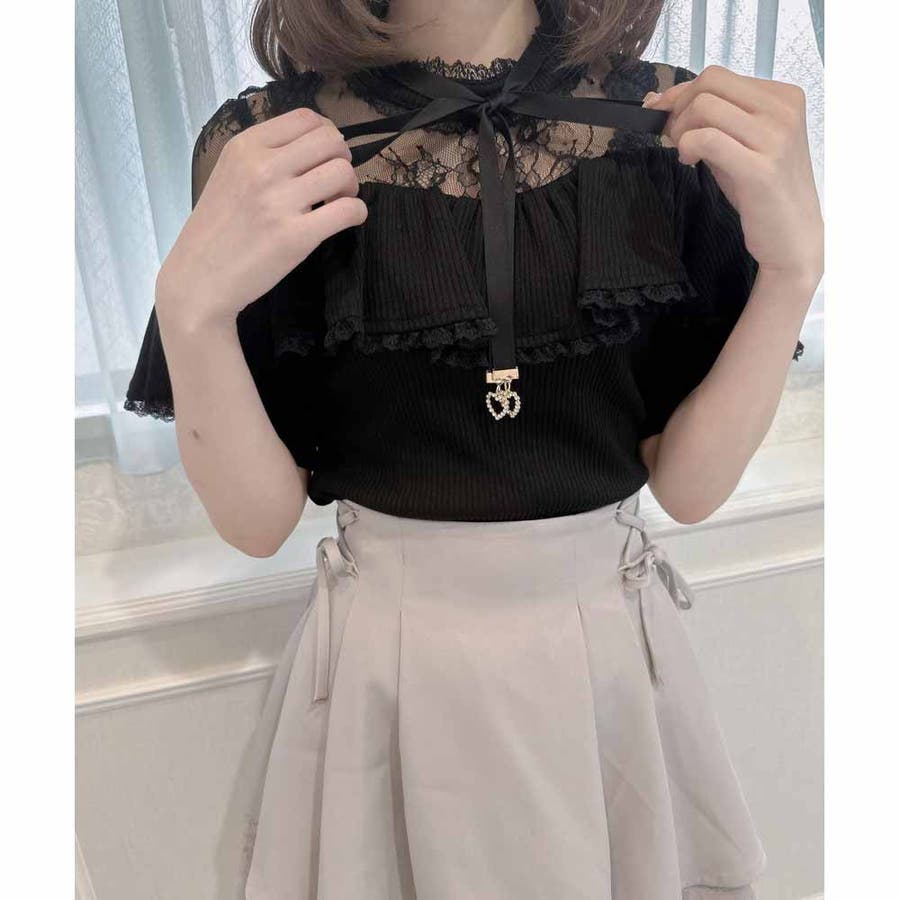 取り外し可能なリボンがついた着心地のいいテレコトップスのお目見えです。リボンの先に付いた小さなハートのビジュがきらきら♡身頃はコンパクトに設計され、ラッフルフリルが体型をカモフラージュしてくれます。レーシーなデコルテ部分が可愛いポイント♪