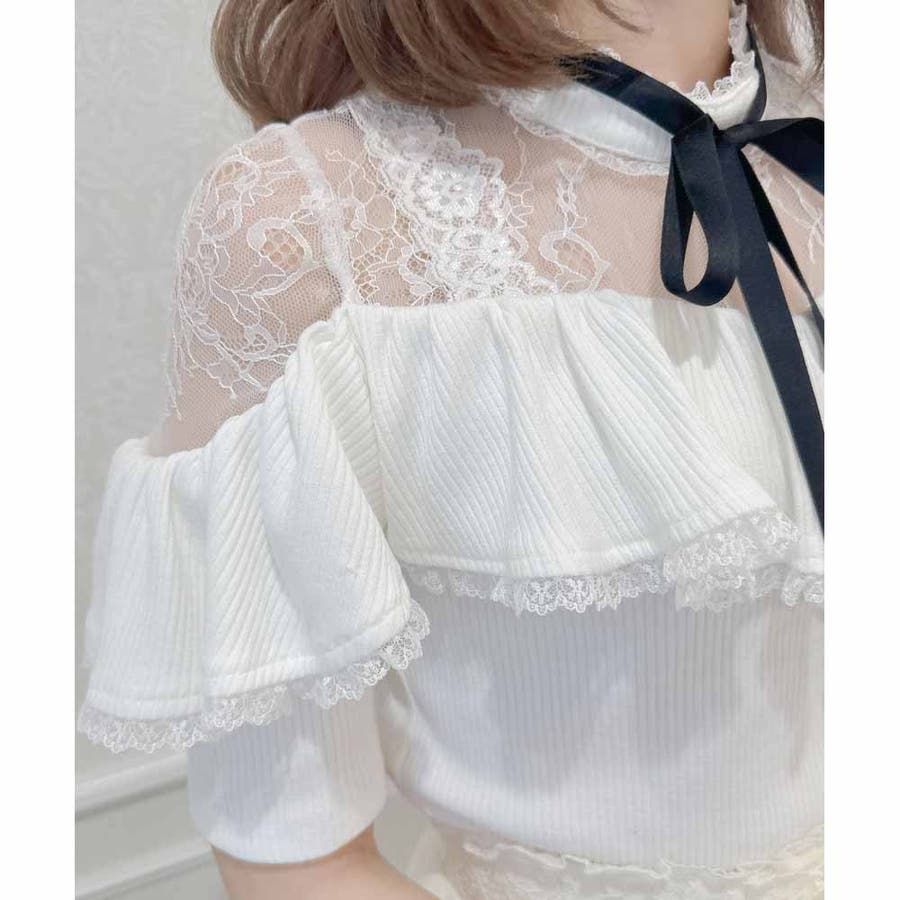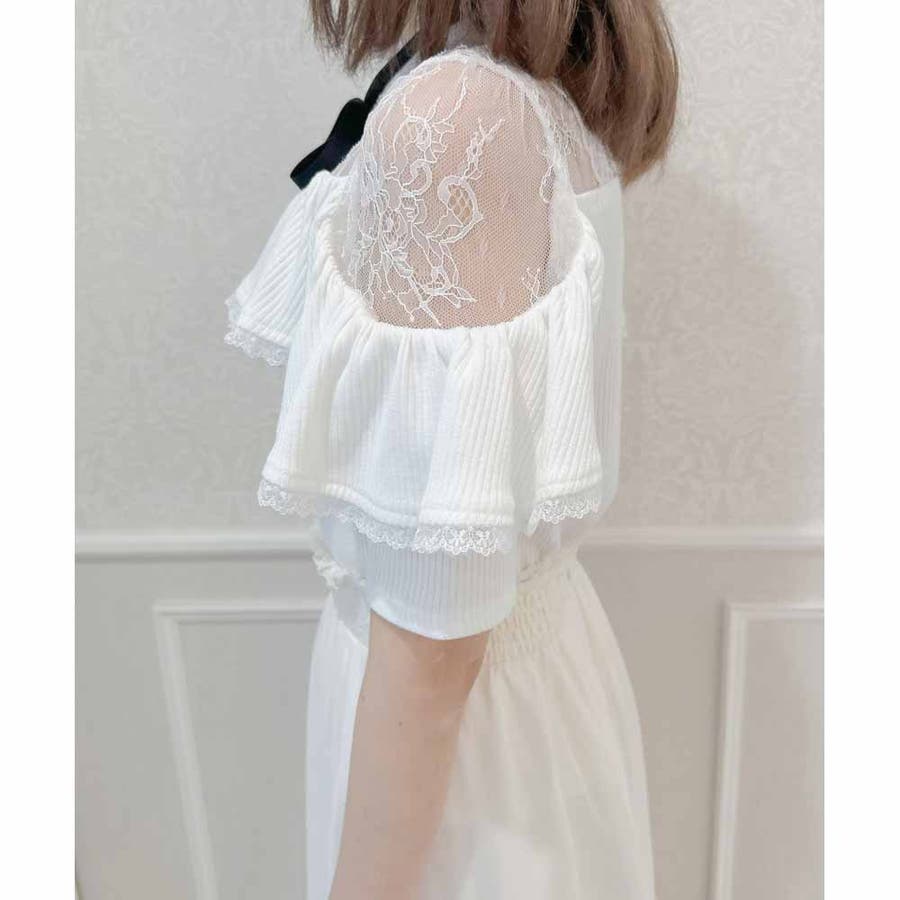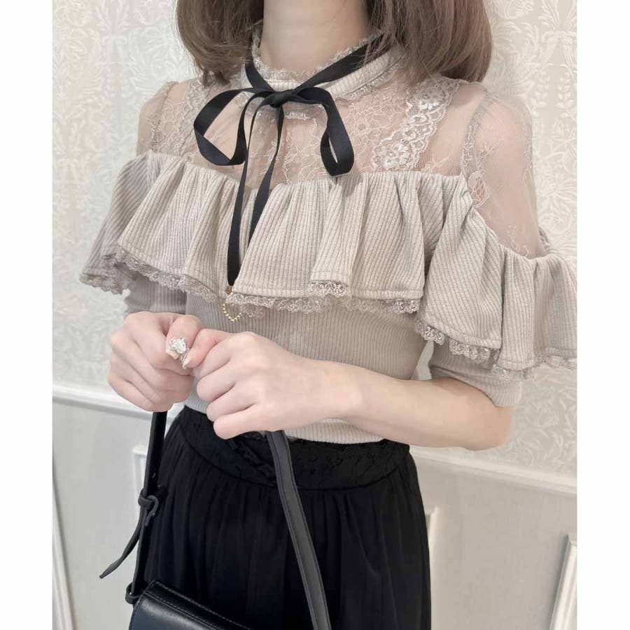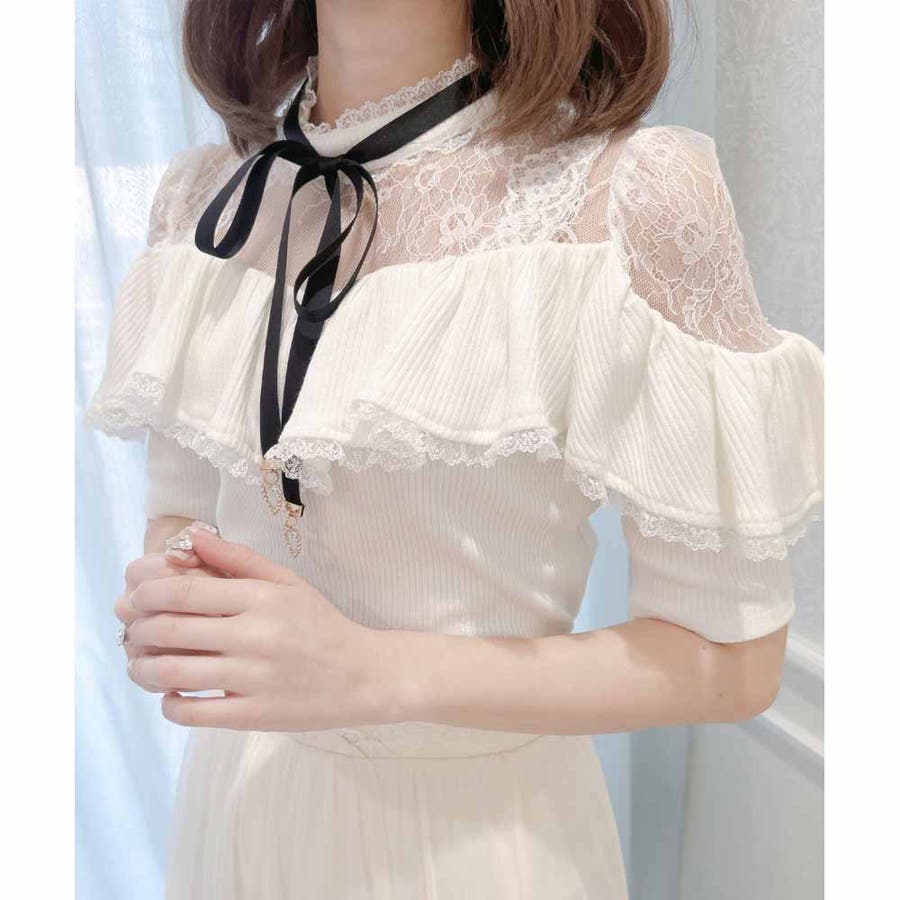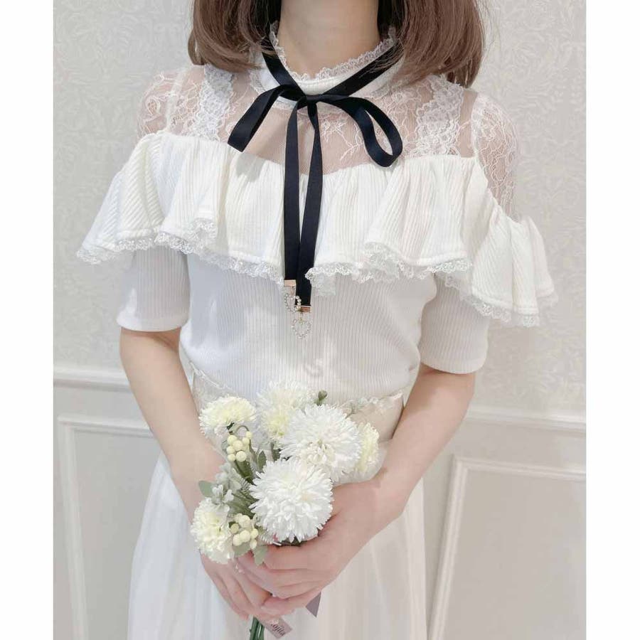 取り外し可能なリボンがついた着心地のいいテレコトップスのお目見えです。リボンの先に付いた小さなハートのビジュがきらきら♡身頃はコンパクトに設計され、ラッフルフリルが体型をカモフラージュしてくれます。レーシーなデコルテ部分が可愛いポイント♪