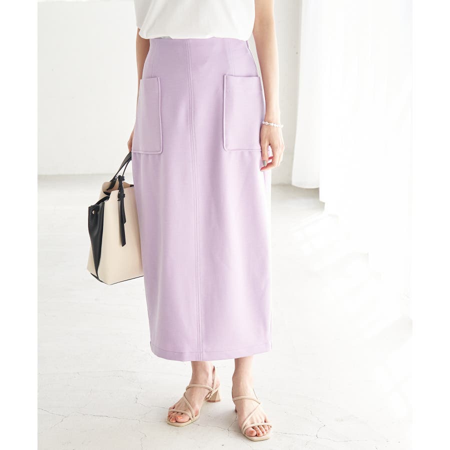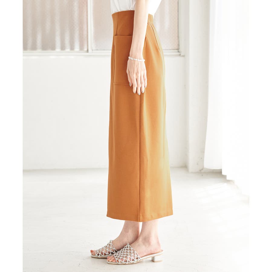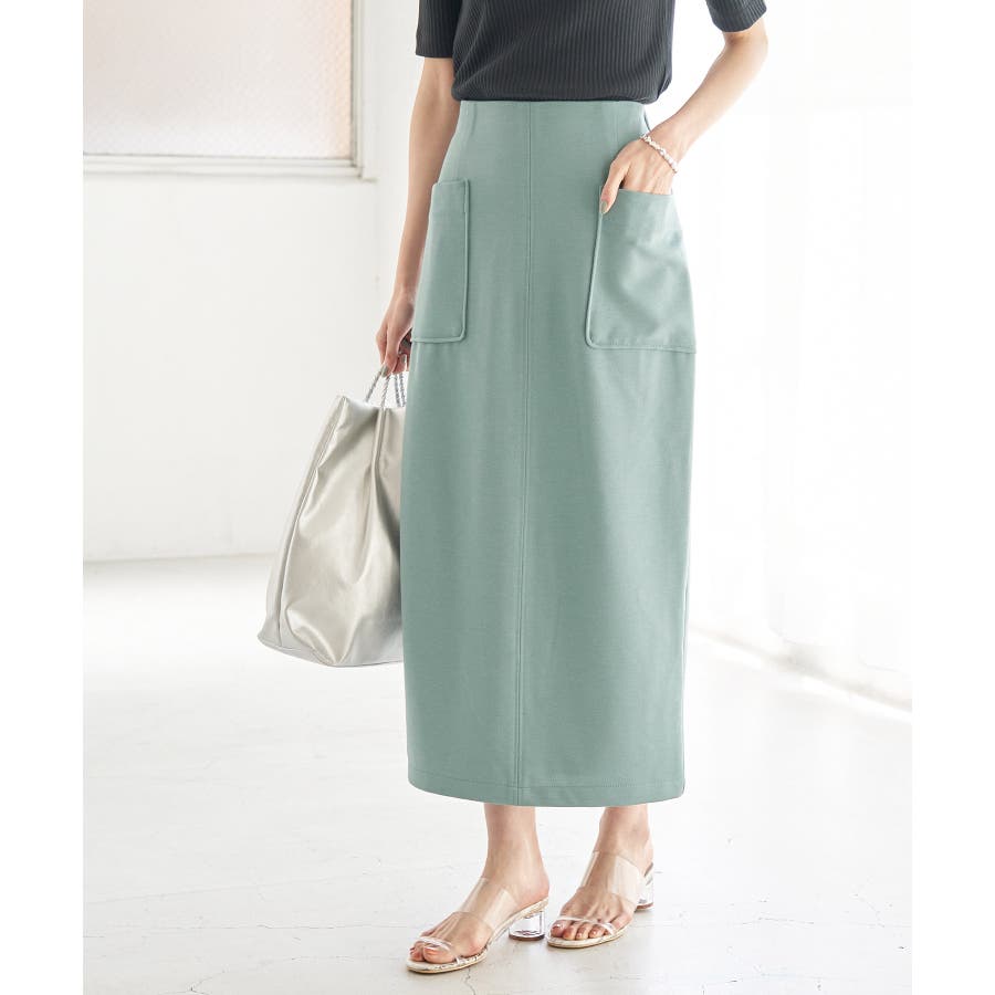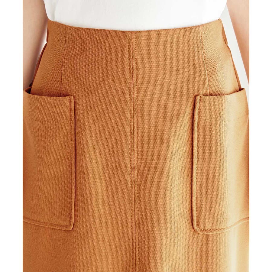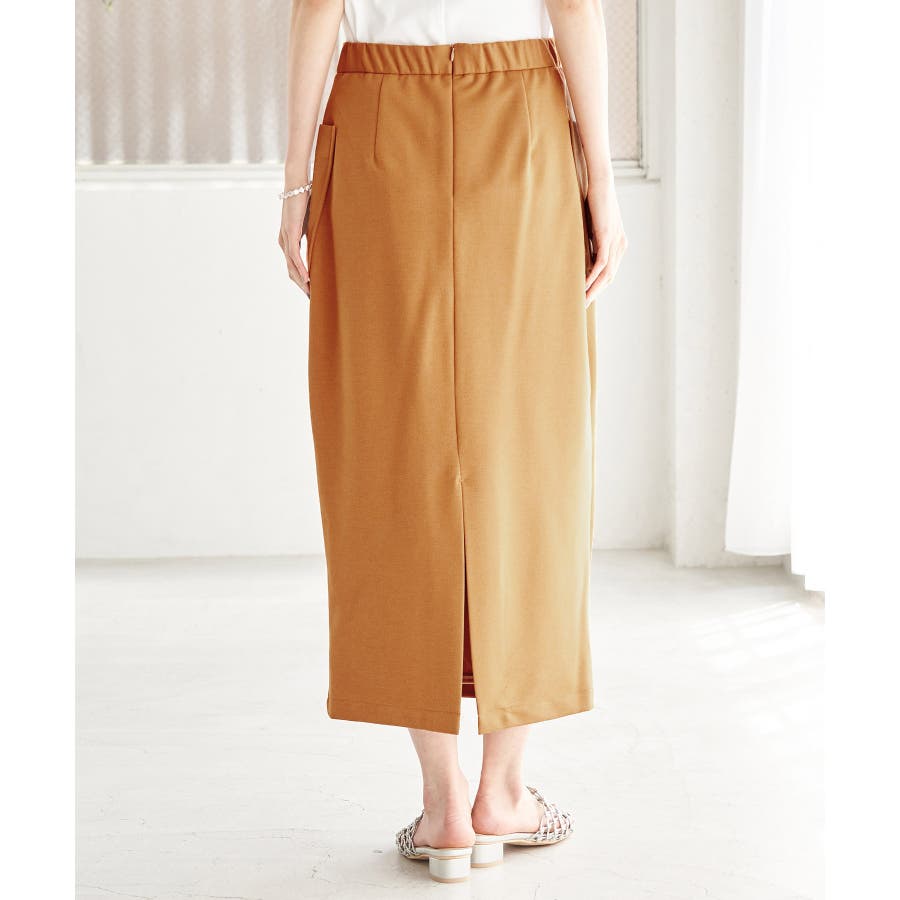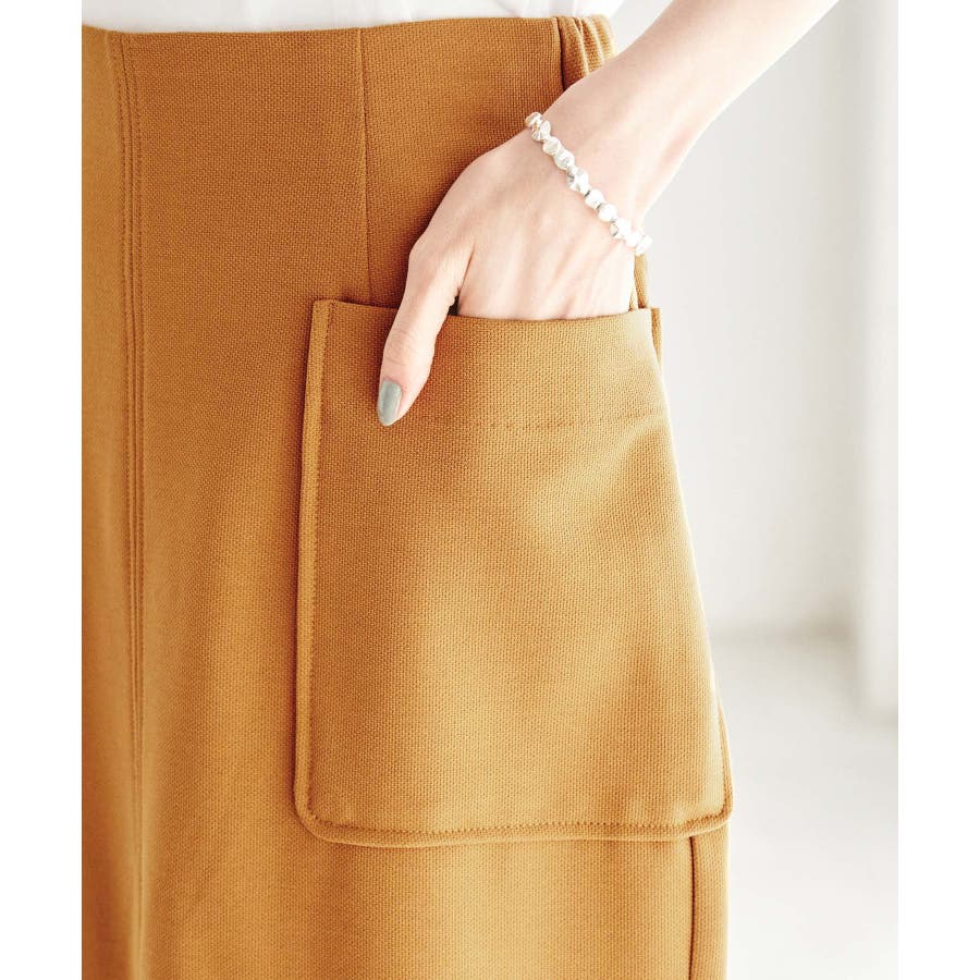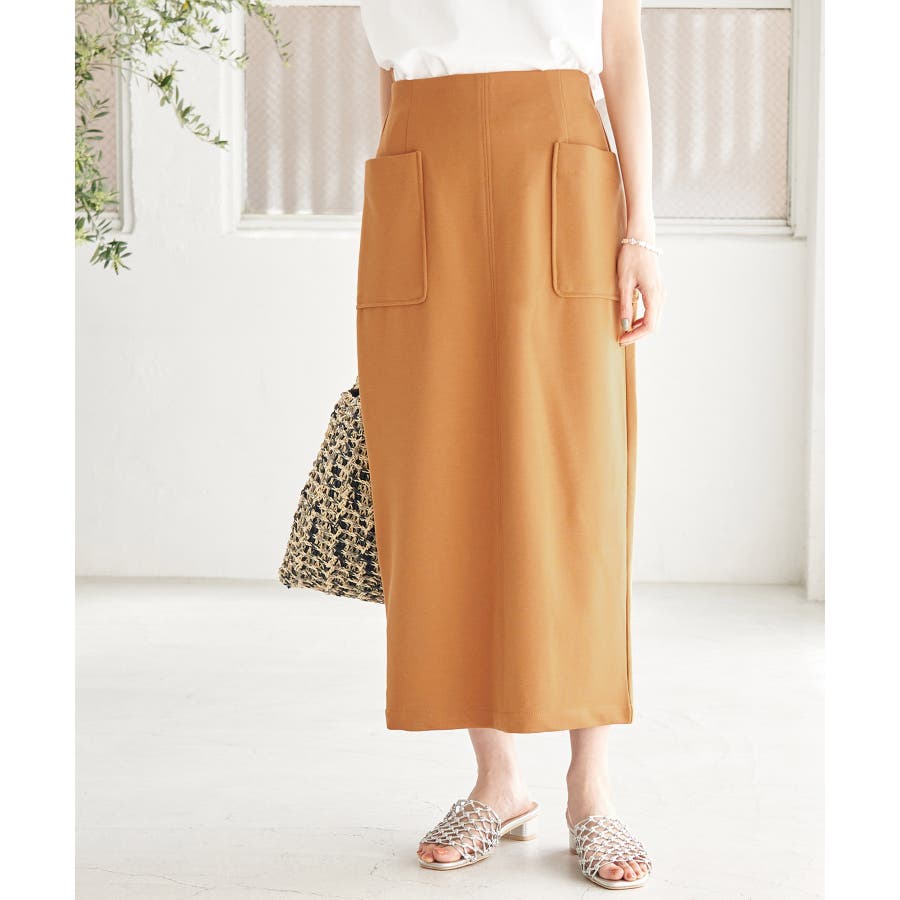 【素材感】 ・伸縮性のあるジャージー素材。 ・レーヨン混で落ち着いた光沢感。 【デザイン・シルエット】 ・タイトシルエットながら動きやすさ抜群。 ・ビッグポケットがポイントとなり、気になる腰のラインをカバー。 【カラー】 ・春らしいカラーを揃えた4色展開。 ・ブルー(44)は少し緑がかったのあるブルーになります。 【スタイリングポイント】 ・カジュアルなTシャツをインして、大人なオフスタイルが完成。 ・オレンジはブラウン系のトップスを合わせると、まとまりのある色使いに。 ----------------------------- 裏地:あり 透け感:なし 伸縮性:あり 生地感・厚さ:普通 ポケット:あり ウエスト:ゴム 季節:春・夏 ----------------------------- ※撮影時の光、お使いのモニター環境によって色の見え方が違う場合がございます。 ※モデル身長:165cm 着用サイズ:38 : □■着用レビュー■□ 〈スタッフA〉 身長:153cm 普段の着用サイズ:36(S)又は38(M) 着用サイズ:36 サイズ感:スッキリとした細身なシルエットです。 生地感:ジャージ素材なのでかなり伸びがよいです。 着心地:伸びの良い素材なので細身ですが動きやすく軽い着心地です。 おすすめコーデ:細身のアイラインスカートなのでボリュームのあるブラウスをINしたコーデやカジュアルなTシャツ合わせがおすすめです。 〈スタッフB〉 身長:162cm 普段の着用サイズ:38(M) 着用サイズ:38 サイズ感:タイトスカートですが全体的にゆとりがあり、ヒップや足のラインは拾いません。丈は足首が出る長さです。 素材感:少し厚手で下着のラインが響きにくく安心感があります。 着心地:伸縮性があり、バックスリットが施されているのでとても動きやすいです。 おすすめコーデ:フロントの大きなポケットがポイントなのでトップスインして着用するのがオススメです。