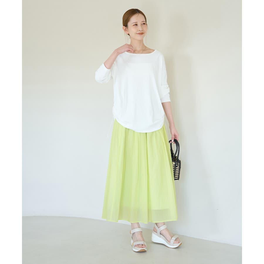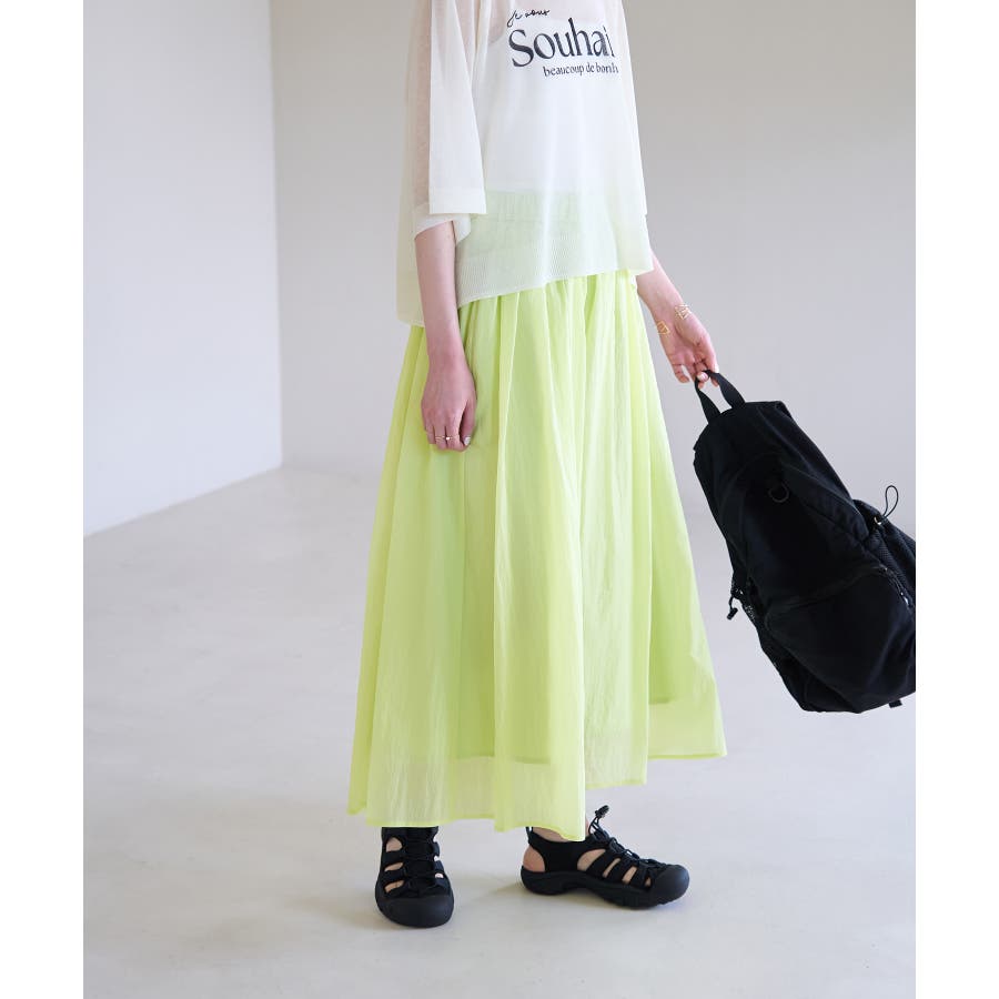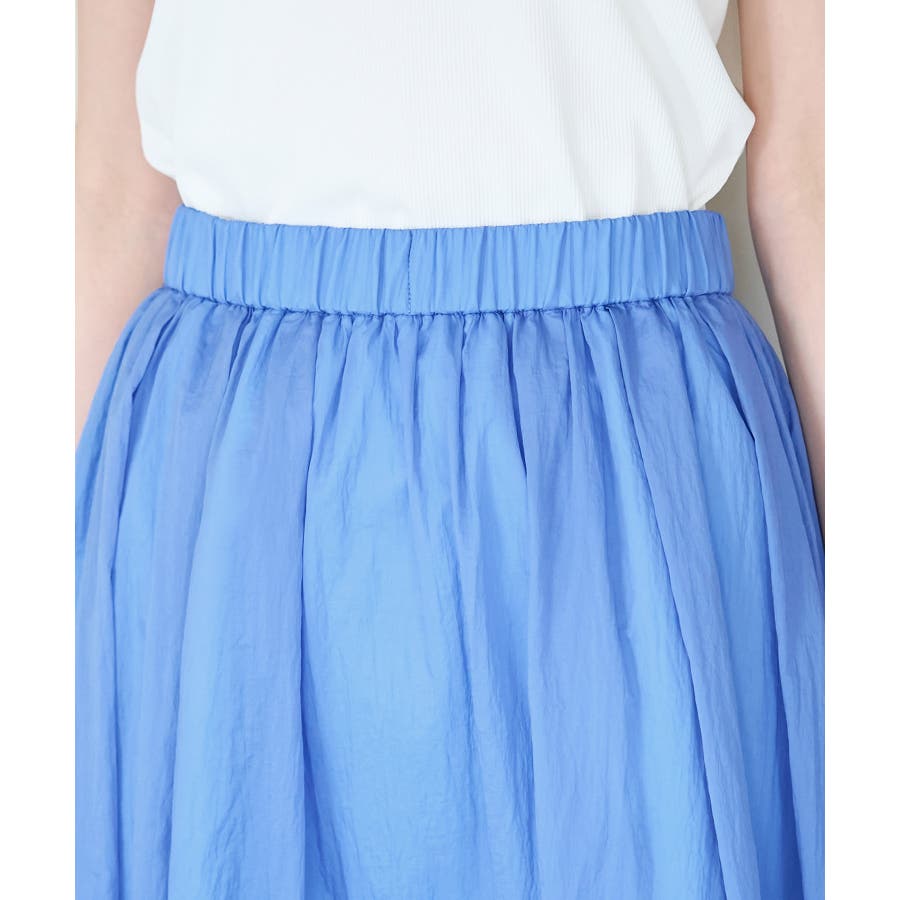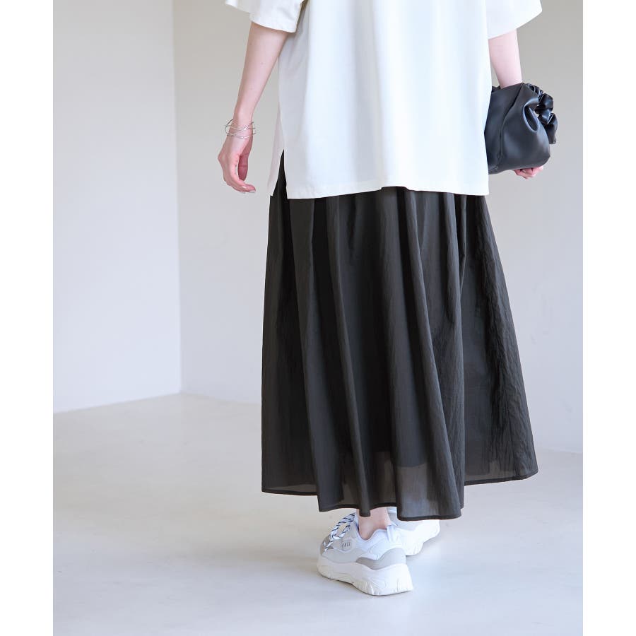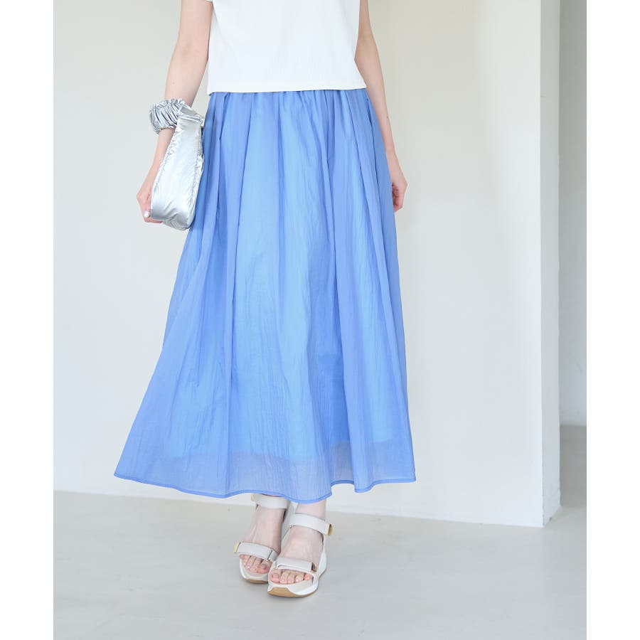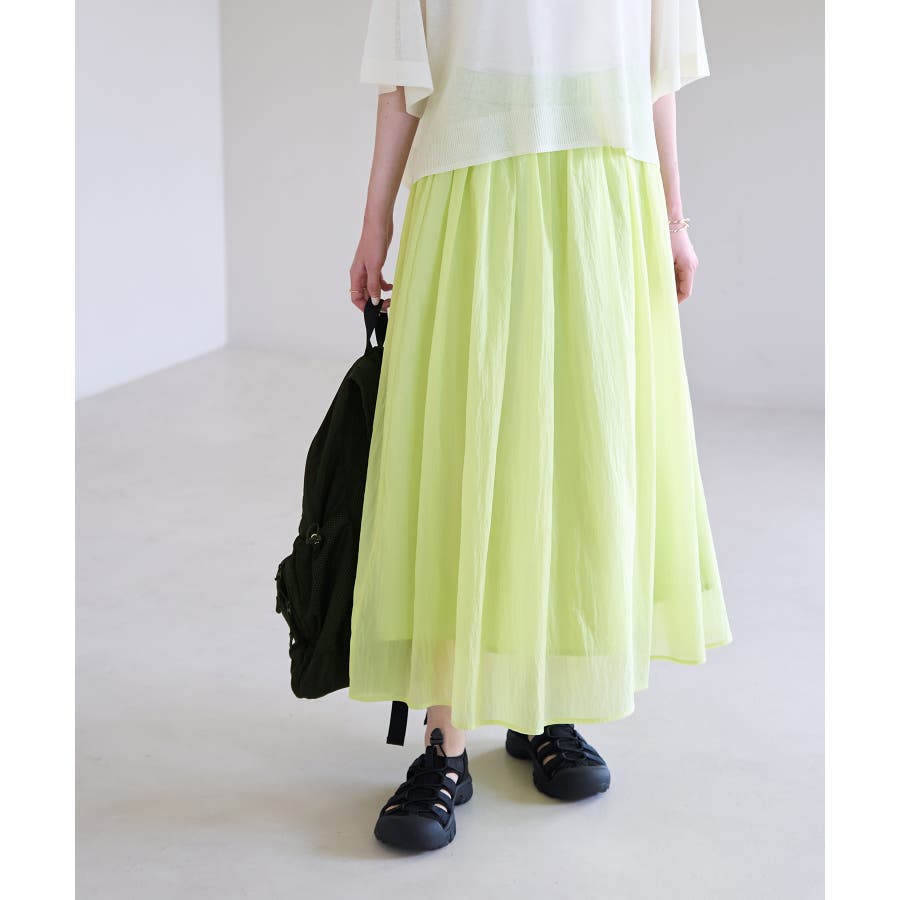 【素材感】 ・ふわっと軽い、シアーなナイロン素材を使ったギャザースカート。 【デザイン・シルエット】 ・くるぶしが隠れるほどの、やや長めのミディアム丈。 ・ウエストはノンストレスのゴム仕様。 【カラー】 ・チャコールグレー、ホワイト、イエロー、ブルーの4色展開。 【スタイリングポイント】 ・バレエシューズに合わせてガーリッシュなムードをプラス。 ・ボーダーカットソーと合わせれば爽やかな春夏コーデに。 ・サマーニットに合わせて素材のミックス感を楽しむスタイルも◎。 ----------------------------- 裏地:あり 透け感:裏地がない部分はややあり 伸縮性:なし 生地感・厚さ:やや薄手 ウエスト:ゴム ポケット:なし 季節:春~秋 ----------------------------- ※撮影時の光、お使いのモニター環境によって色の見え方が違う場合がございます。 ※モデル身長:165cm 着用サイズ:38