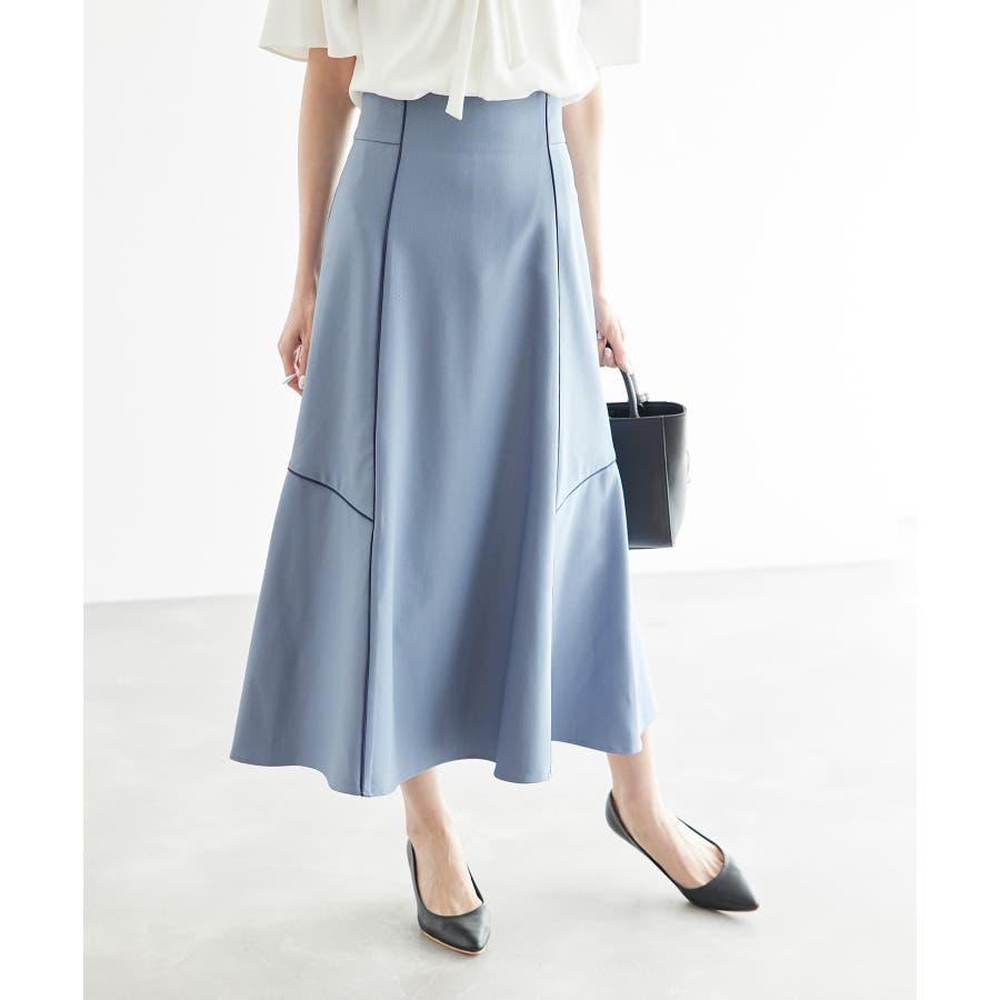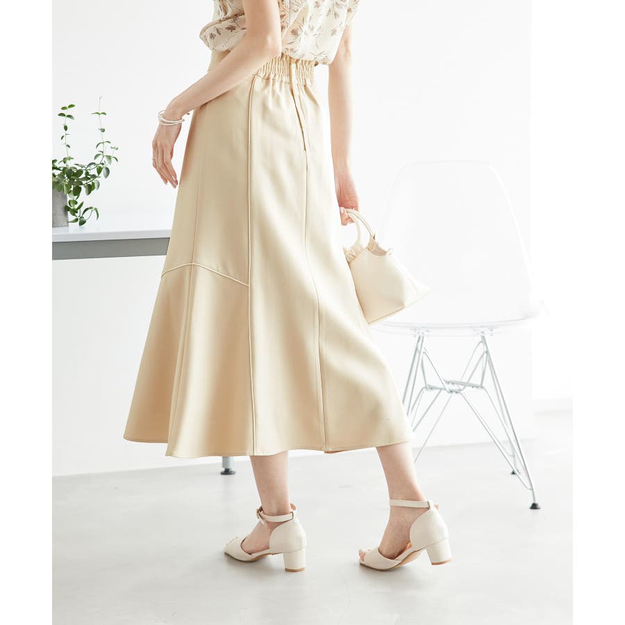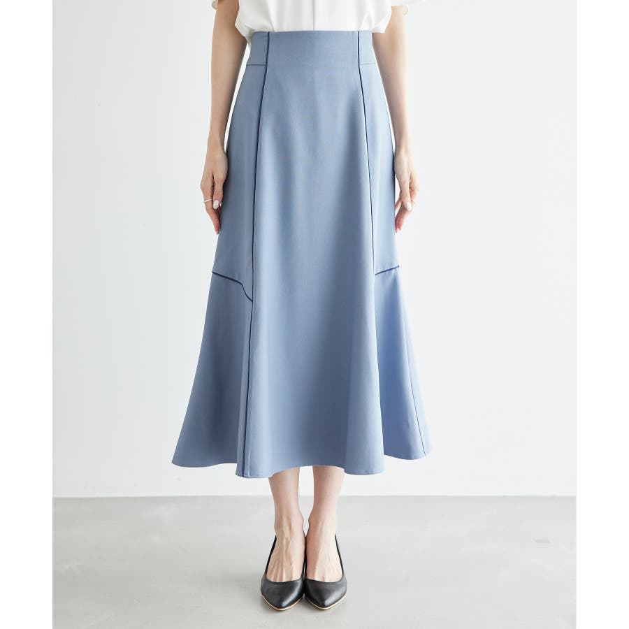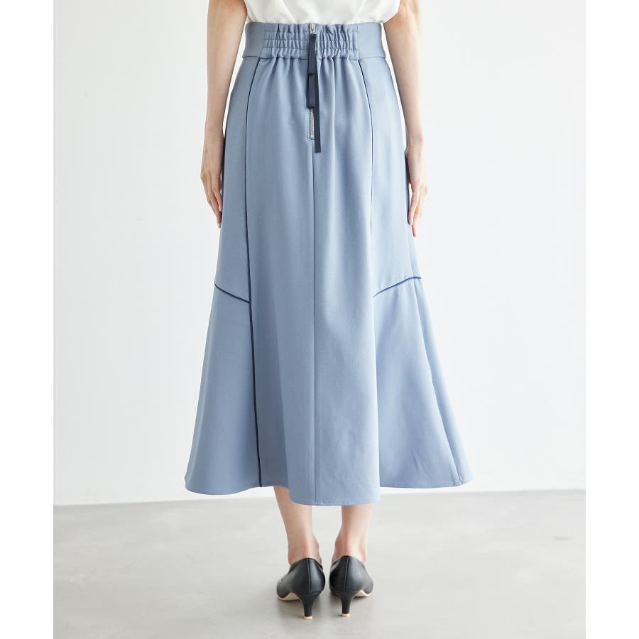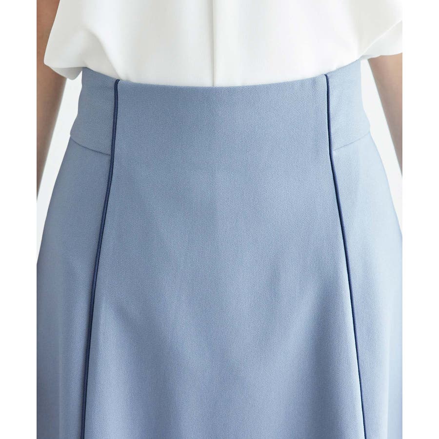 【素材感】 ・きれいめな素材感でお仕事着としても◎ 【デザイン・シルエット】 ・切り替えに配色パイピングを施した、メリハリのあるデザイン。 ・裾が少しだけ広がる、落ち着いた大人なシルエット。 ・ベルトラインは、後ろ中心のみギャザー使いに。 ・着脱はバックファスナー開閉。 【カラー】 ・カラーによって組成が異なります。 ベージュ(27):ベージュ×ホワイトパイピング (表地)ポリエステル 100% (裏地)ポリエステル 100% ブルー(40):デニム調ネイビー×ネイビーパイピング サックスブルー(44):サックスブルー×ネイビーパイピング ポリエステル 100% 【スタイリングポイント】 ・愛らしいブラウスと好相性。 ・クロップドトップに合わせるか、トップスは裾インで着こなすのがおすすめ。 ・足もとはレディライクなサンダル合わせが◎。 ----------------------------- 裏地:ベージュ(27)のみあり 透け感:なし 伸縮性:なし 生地感・厚さ:普通 ウエスト:後ろギャザー ポケット:なし その他仕様:後ろファスナー 季節:春~秋 ----------------------------- ※撮影時の光、お使いのモニター環境によって色の見え方が違う場合がございます。 ※モデル身長:165cm 着用サイズ:38