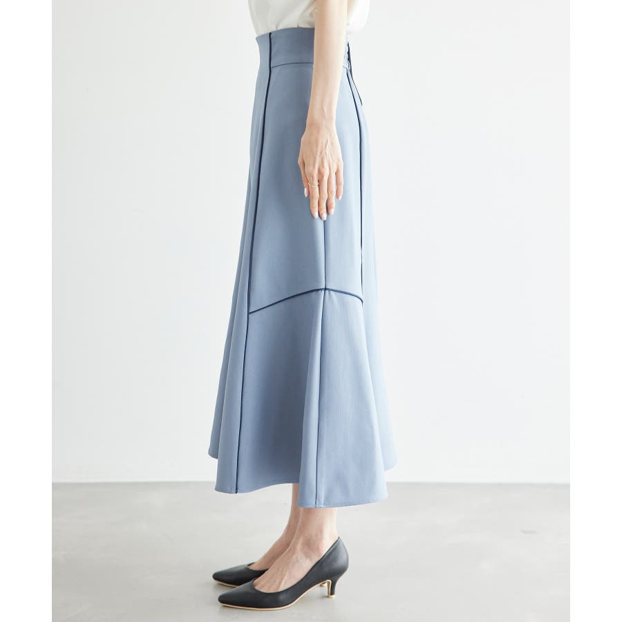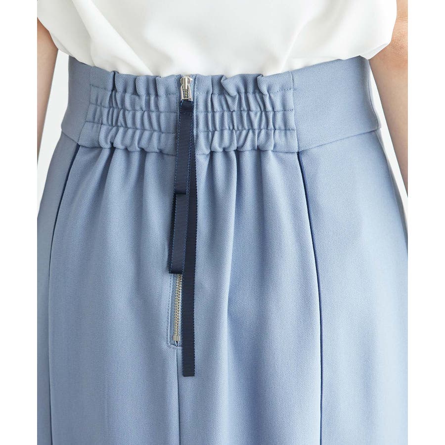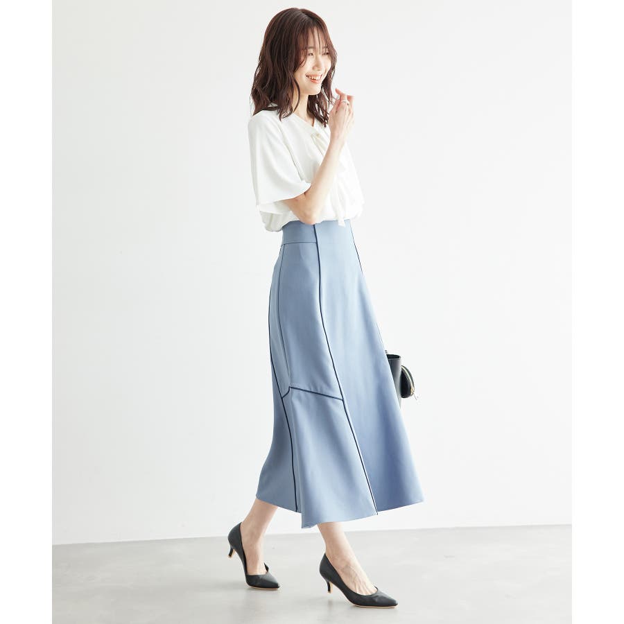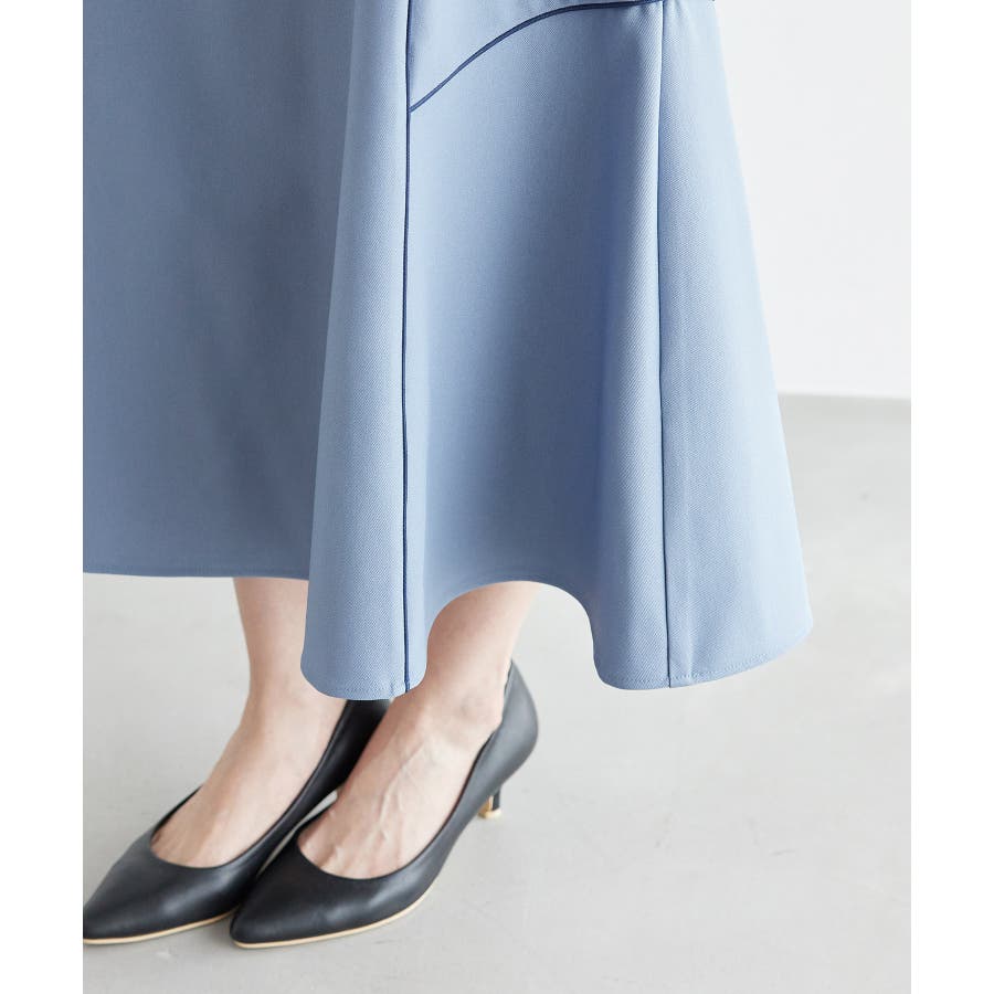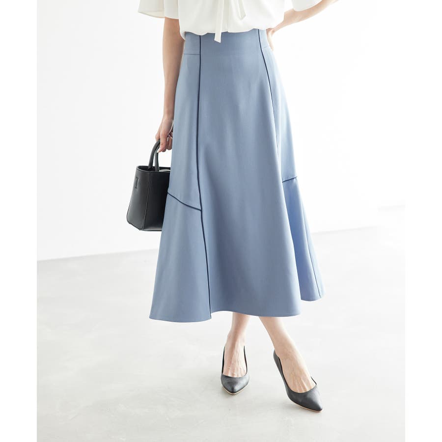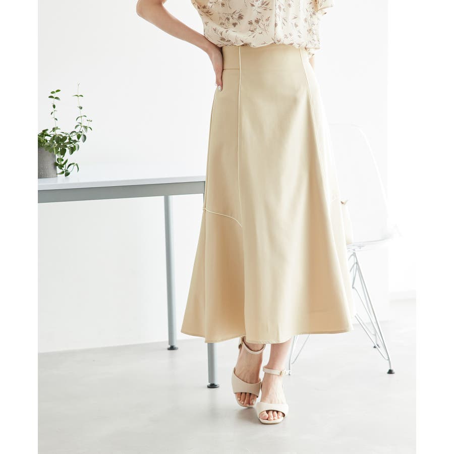 【素材感】 ・きれいめな素材感でお仕事着としても◎ 【デザイン・シルエット】 ・切り替えに配色パイピングを施した、メリハリのあるデザイン。 ・裾が少しだけ広がる、落ち着いた大人なシルエット。 ・ベルトラインは、後ろ中心のみギャザー使いに。 ・着脱はバックファスナー開閉。 【カラー】 ・カラーによって組成が異なります。 ベージュ(27):ベージュ×ホワイトパイピング (表地)ポリエステル 100% (裏地)ポリエステル 100% ブルー(40):デニム調ネイビー×ネイビーパイピング サックスブルー(44):サックスブルー×ネイビーパイピング ポリエステル 100% 【スタイリングポイント】 ・愛らしいブラウスと好相性。 ・クロップドトップに合わせるか、トップスは裾インで着こなすのがおすすめ。 ・足もとはレディライクなサンダル合わせが◎。 ----------------------------- 裏地:ベージュ(27)のみあり 透け感:なし 伸縮性:なし 生地感・厚さ:普通 ウエスト:後ろギャザー ポケット:なし その他仕様:後ろファスナー 季節:春~秋 ----------------------------- ※撮影時の光、お使いのモニター環境によって色の見え方が違う場合がございます。 ※モデル身長:165cm 着用サイズ:38