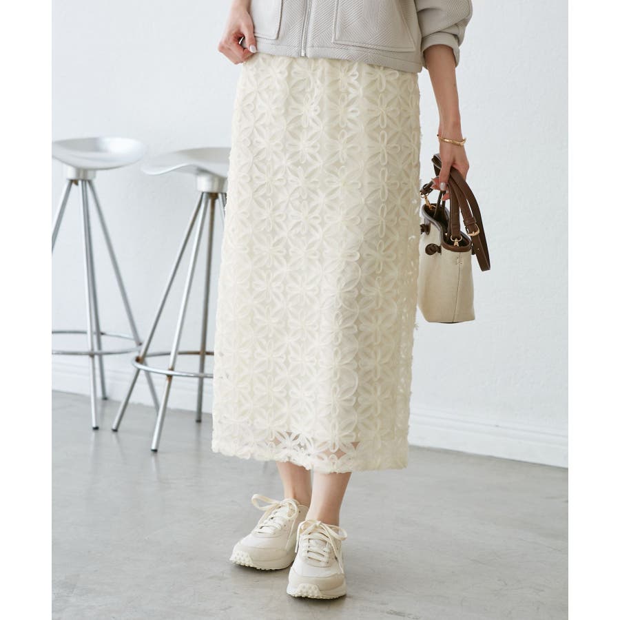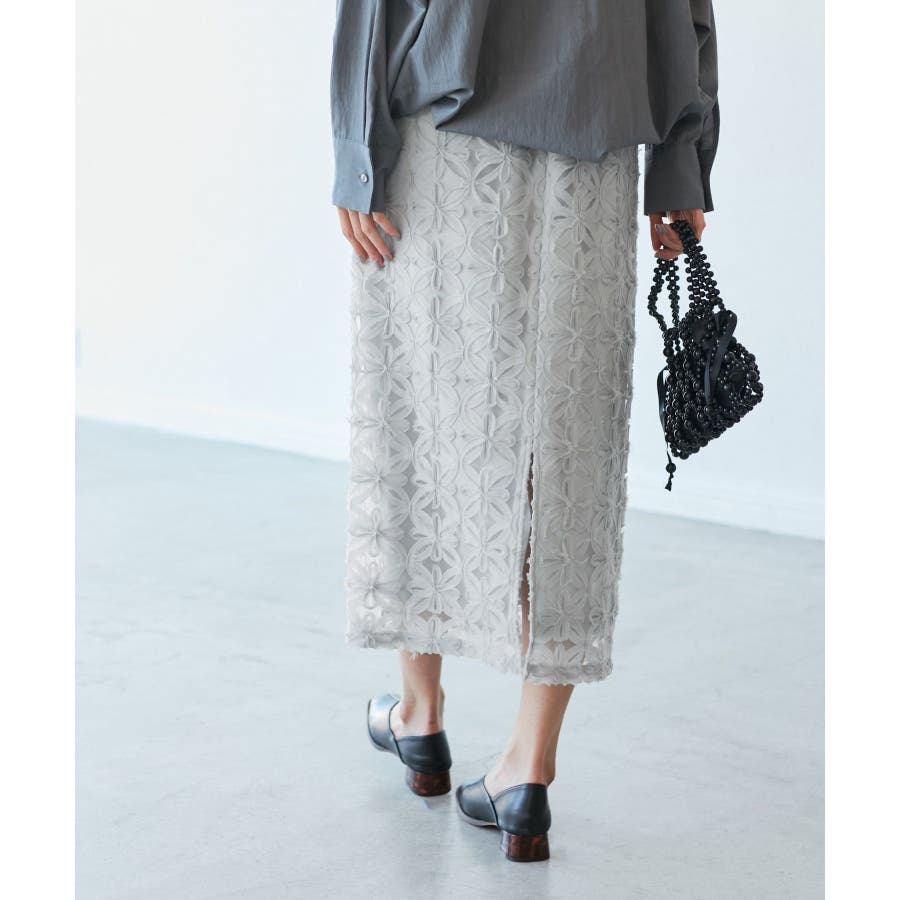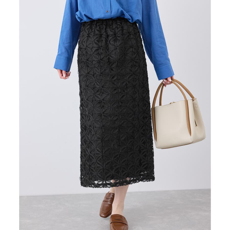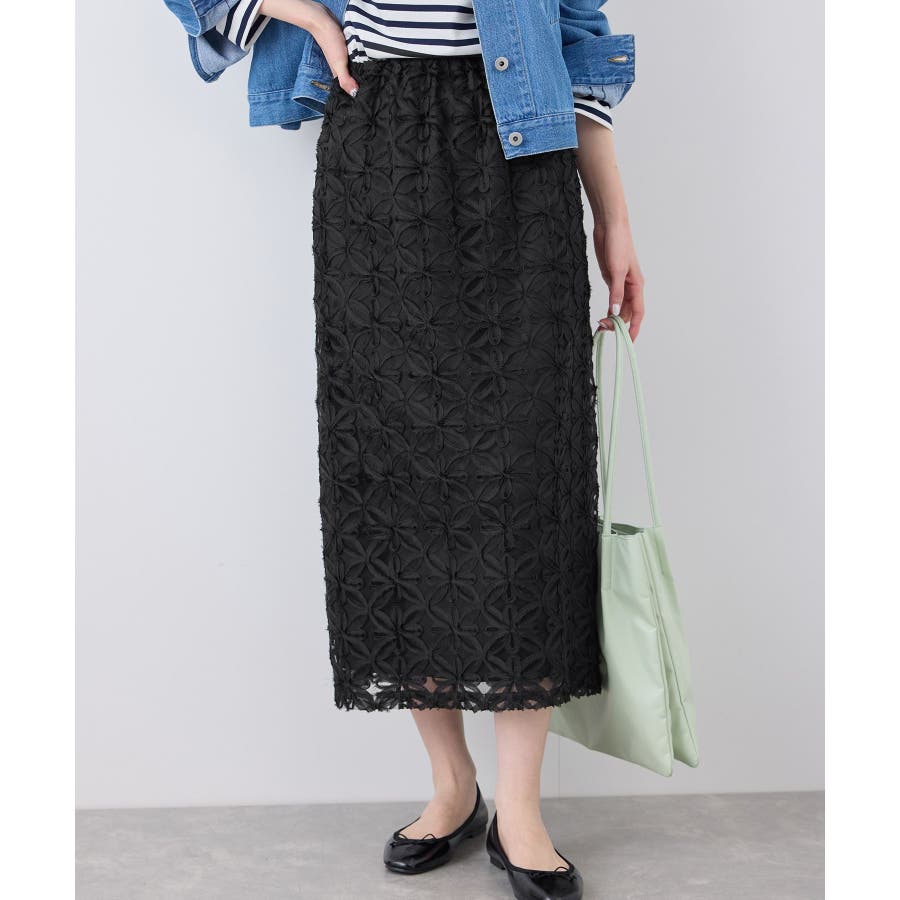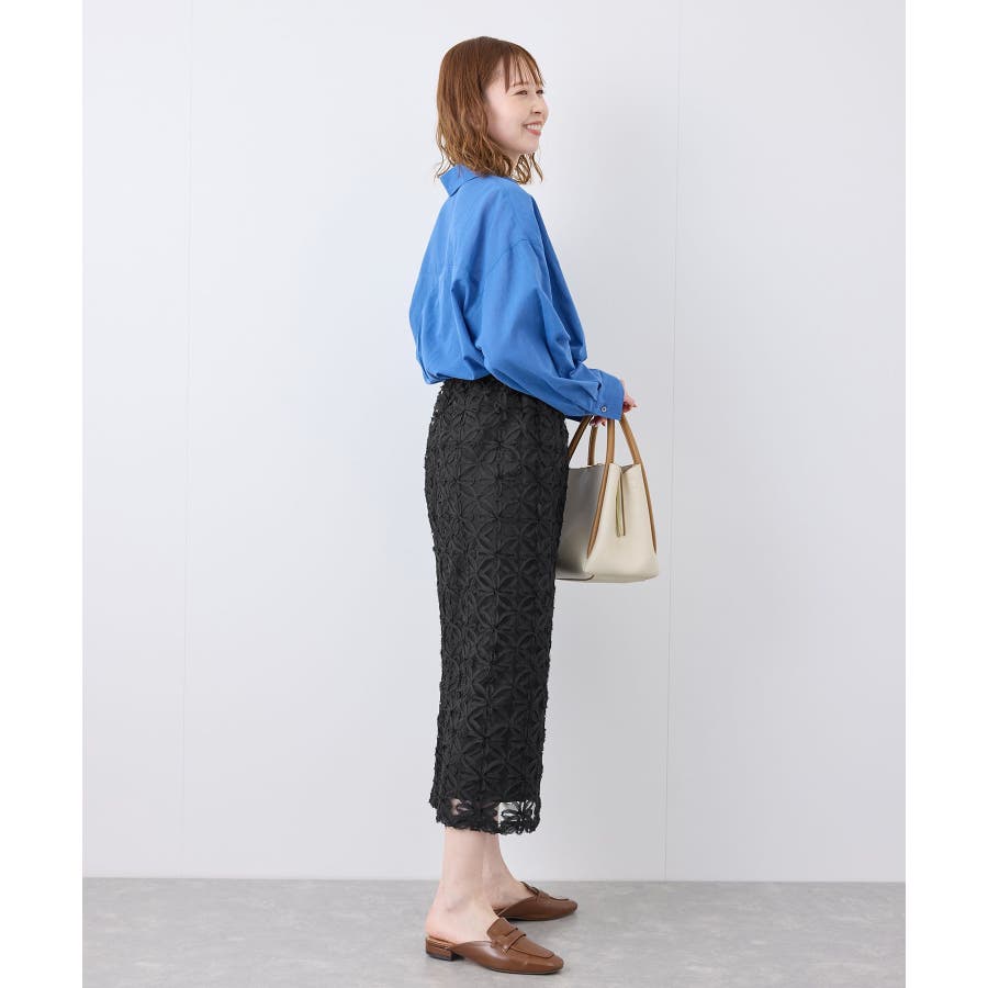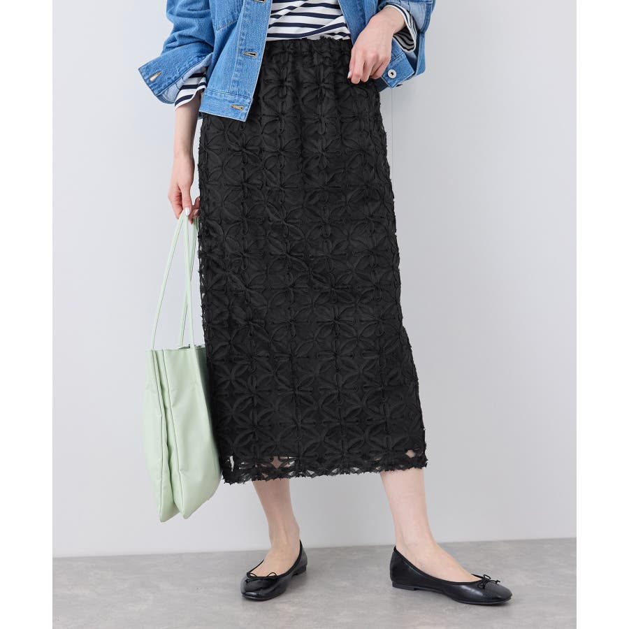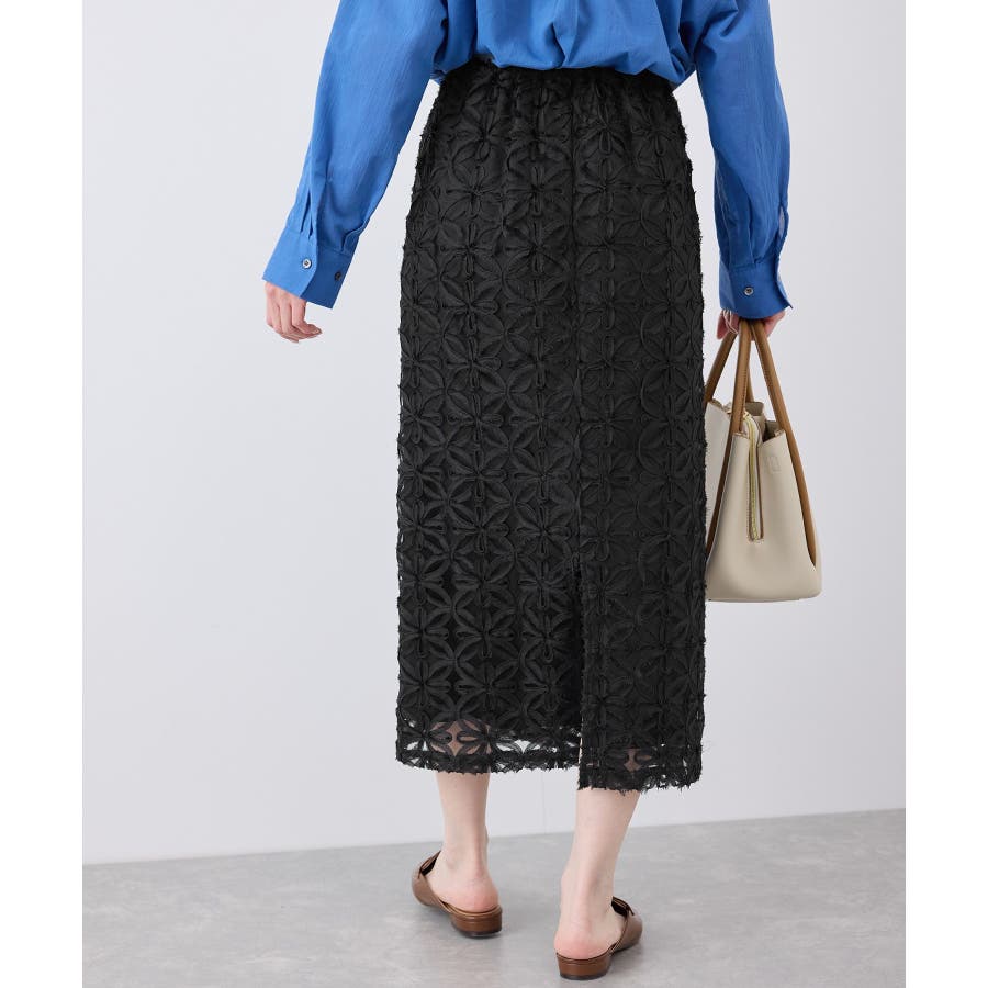 【素材感】 ・素材感がクリアな印象でカジュアルにも、キレイめにも着られる。 【デザイン・シルエット】 ・フラワー柄のチュールレースを用いたタイトスカート。 ・足捌きの良いバックスリット入り。 ・脇接ぎを入れないことによって脇で柄が切れることを防ぎ、サイドから見てもキレイで価値観アップ。 【カラー】 ・ブラック、ライトグレー、オフホワイトの落ち着いた3色展開。 【スタイリングポイント】 ・ボーダーシャツでスウィートなスカートをカジュアルにアレンジ。 ・冬はシンプルなニット合わせがおすすめ。 ・ニットは素材感のあるものを合わせるとおしゃれな雰囲気に。 ----------------------------- 裏地:あり 透け感:裏地がない部分はややあり 伸縮性:なし 生地感・厚さ:普通 ポケット:なし ウエスト:ゴム 季節:春・夏・秋・冬 ----------------------------- ※撮影時の光、お使いのモニター環境によって色の見え方が違う場合がございます。 ※モデル身長:166cm 着用サイズ:38 ※この製品は、表面の毛羽が着用時の摩擦によって抜けたり、ほかの衣服に付着することがありますので、組み合わせの衣服などにご注意下さい。 付着した毛羽はブラシをかけることで簡単に除去することができます。
