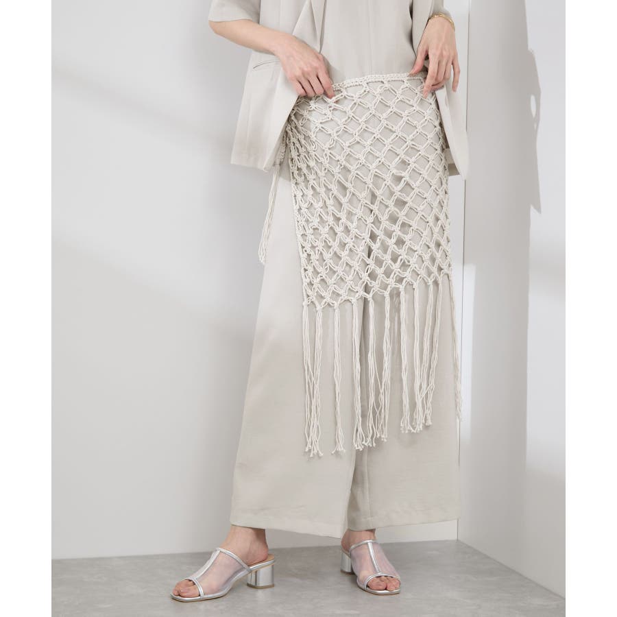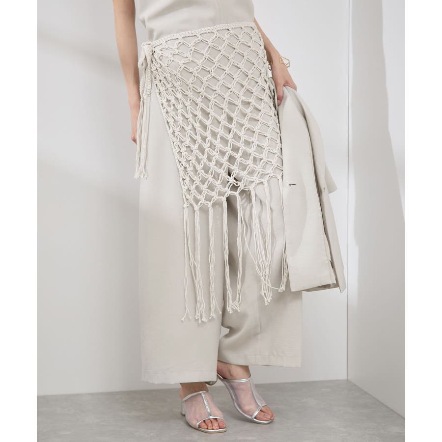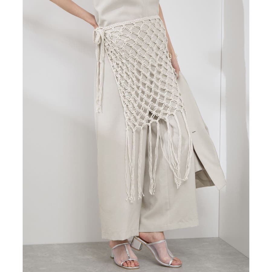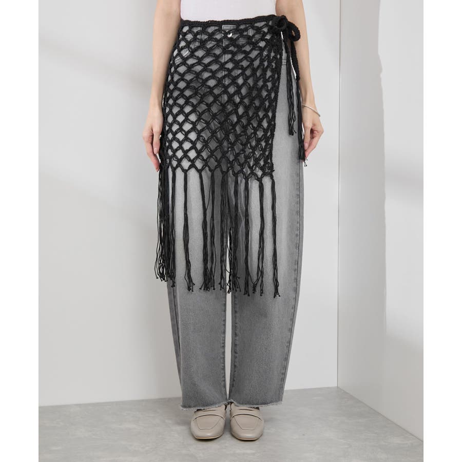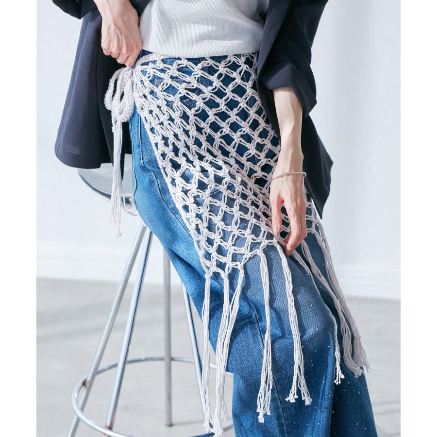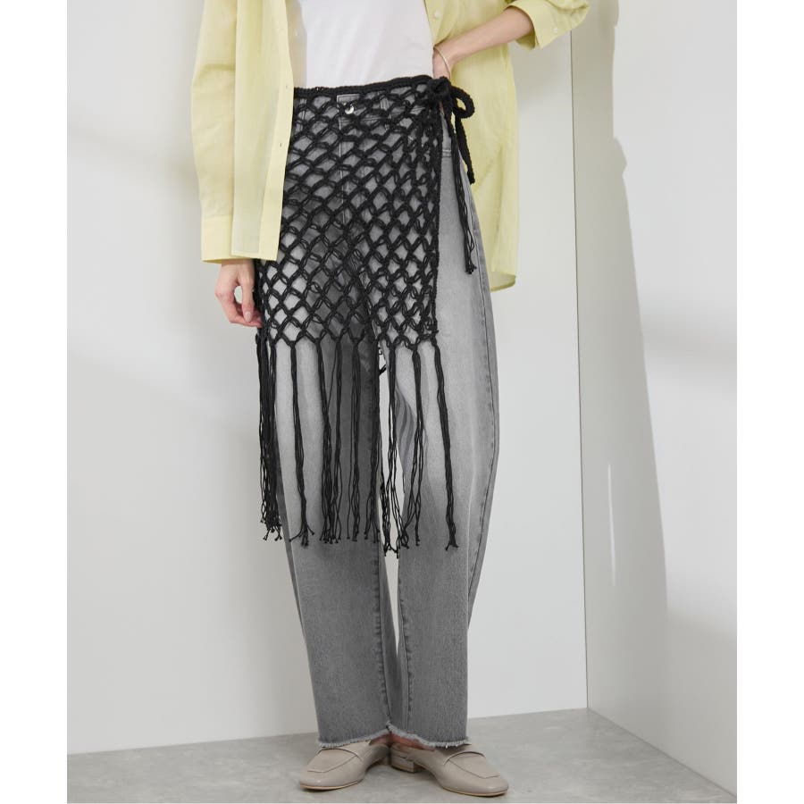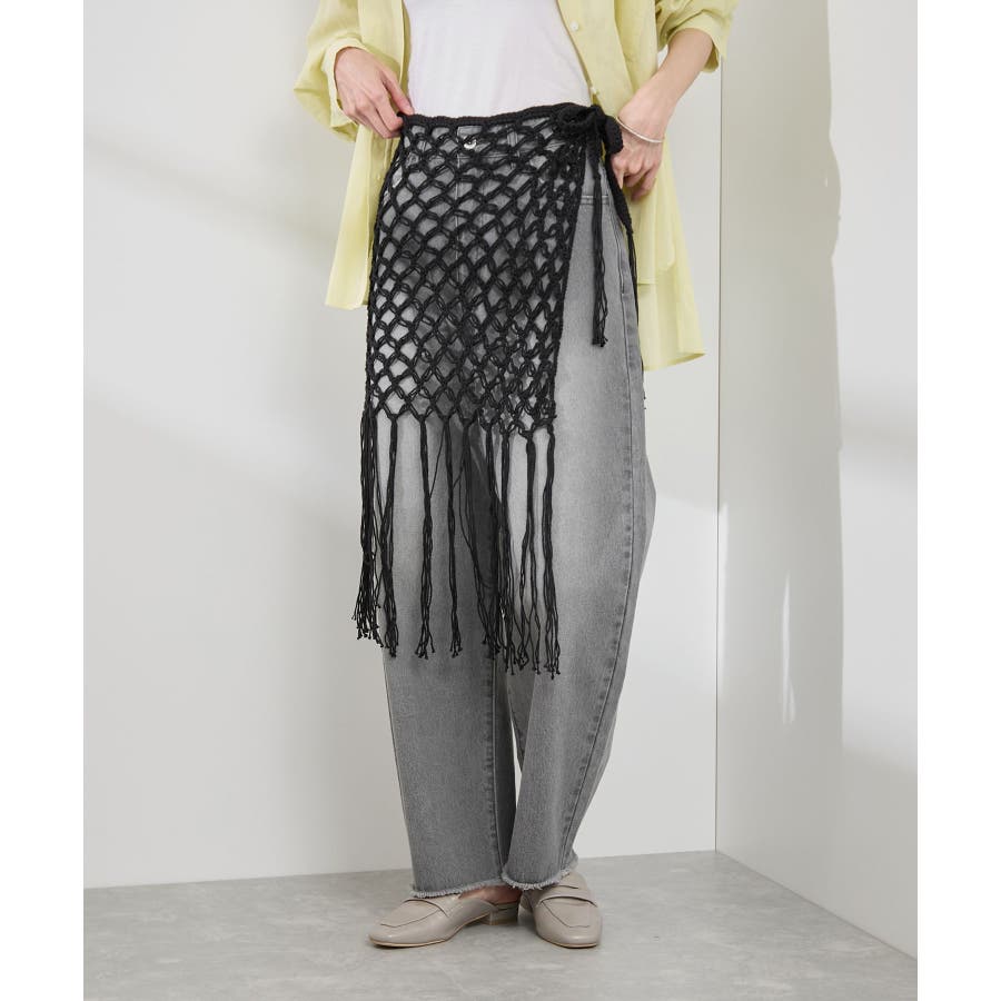 【素材感】 ・ラスティックな雰囲気のマットな糸。 【デザイン・シルエット】 ・トレンドのマクラメ風に編んだかぎ針のニット巻きスカート。 ・紐は左右どちらでもお好きな方で結べます。 ・裾に長めフリンジをあしらい、動きを出したデザイン。 【カラー】 ・ブラック、アイボリーの合わせやすいベーシックカラー2色展開。 【スタイリングポイント】 ・デニムとのレイヤードが一押し。 ・インナーペチを重ねてスカートとして穿く場合は、デニムのジャケットやシャツ合わせがおすすめ。 ----------------------------- 裏地:なし 透け感:あり 伸縮性:ややあり 生地感・厚さ:普通 季節:春・夏・秋・冬 ----------------------------- ※撮影時の光、お使いのモニター環境によって色の見え方が違う場合がございます。 ※モデル身長:165cm 着用サイズ:38