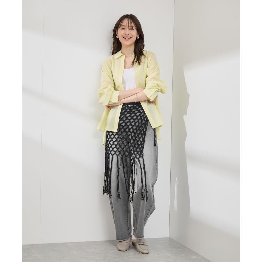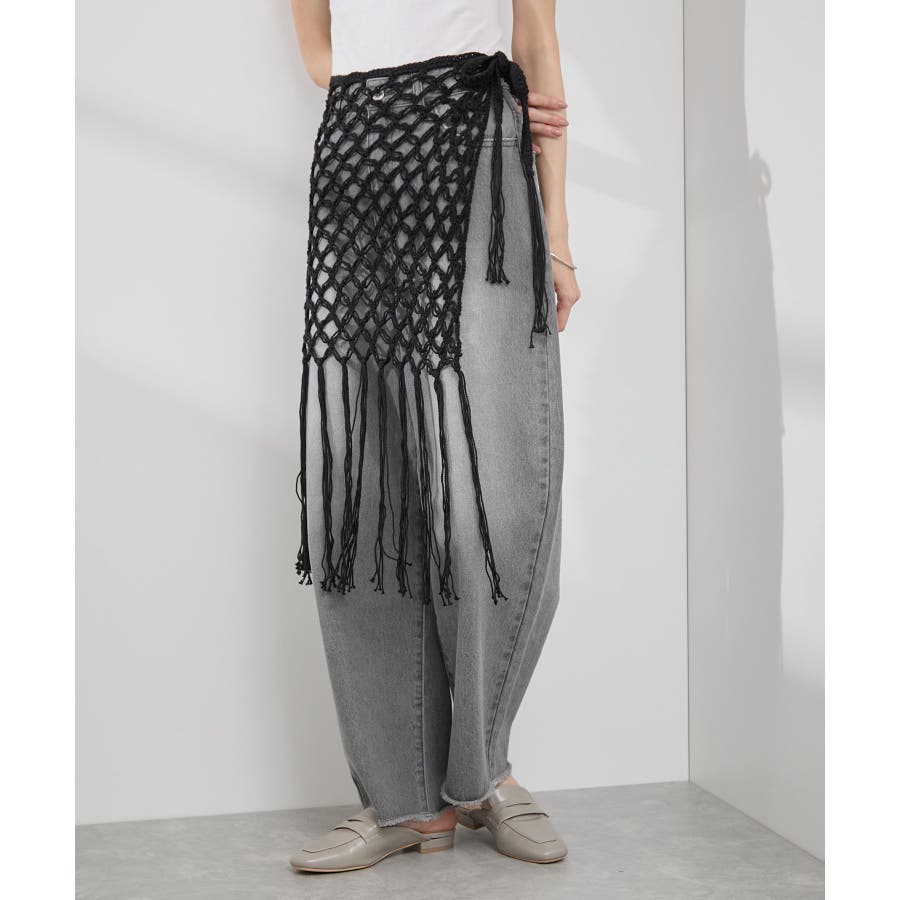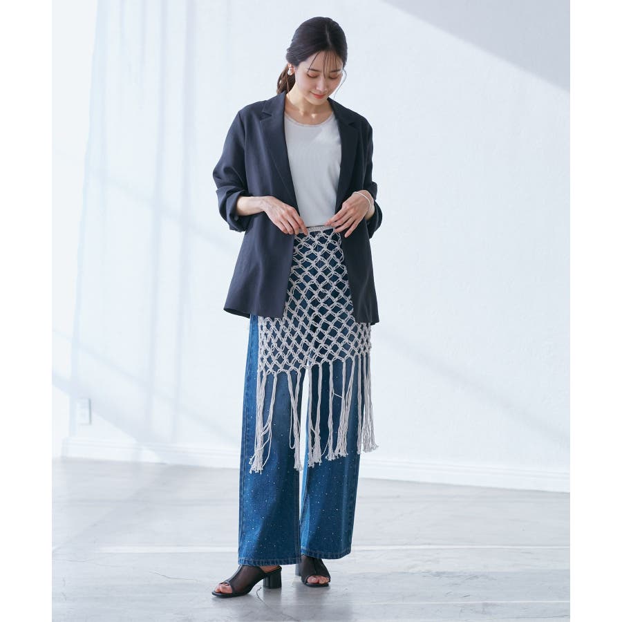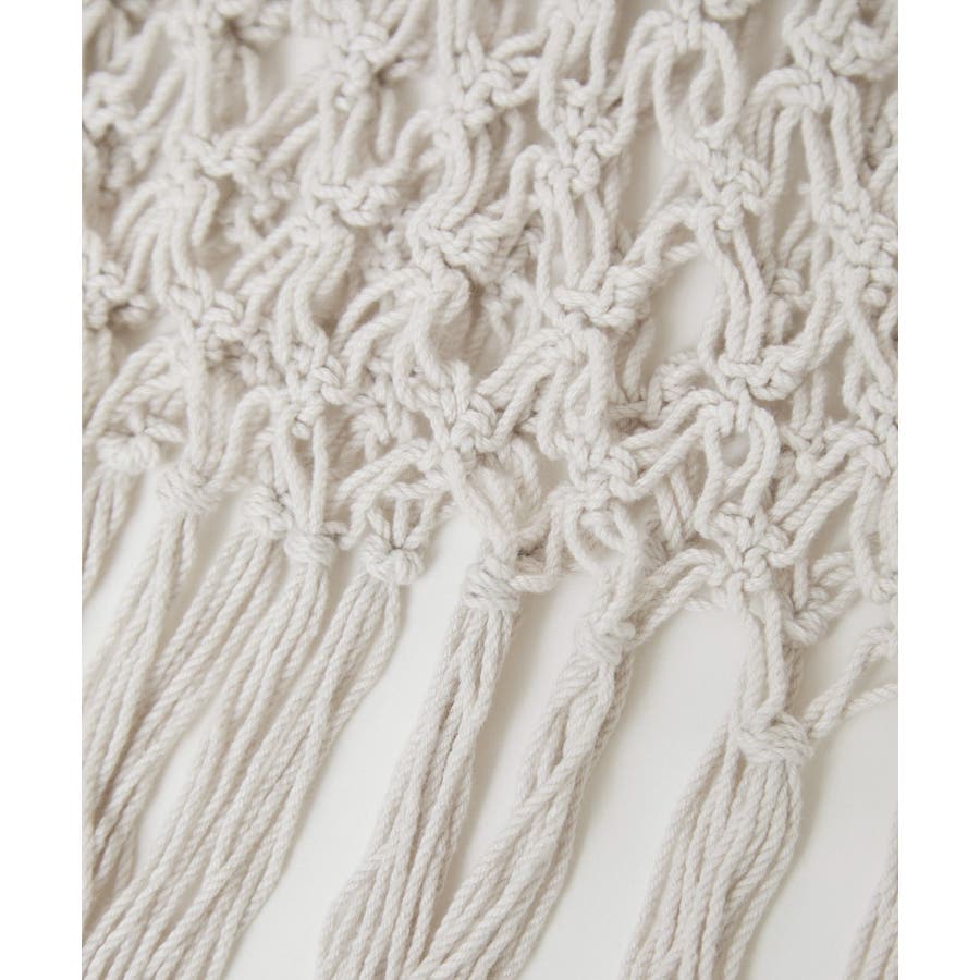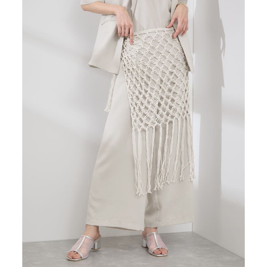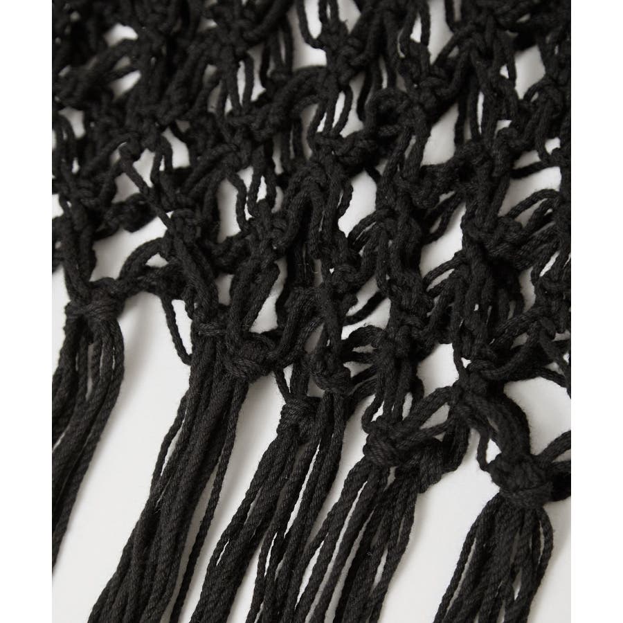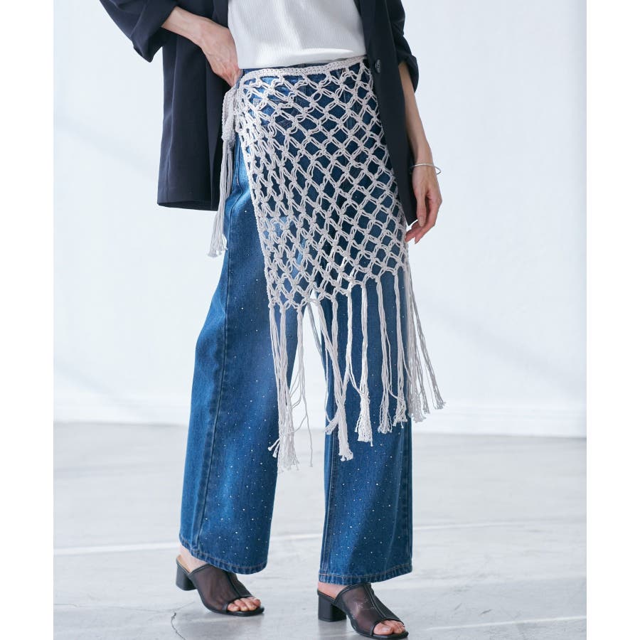 【素材感】 ・ラスティックな雰囲気のマットな糸。 【デザイン・シルエット】 ・トレンドのマクラメ風に編んだかぎ針のニット巻きスカート。 ・紐は左右どちらでもお好きな方で結べます。 ・裾に長めフリンジをあしらい、動きを出したデザイン。 【カラー】 ・ブラック、アイボリーの合わせやすいベーシックカラー2色展開。 【スタイリングポイント】 ・デニムとのレイヤードが一押し。 ・インナーペチを重ねてスカートとして穿く場合は、デニムのジャケットやシャツ合わせがおすすめ。 ----------------------------- 裏地:なし 透け感:あり 伸縮性:ややあり 生地感・厚さ:普通 季節:春・夏・秋・冬 ----------------------------- ※撮影時の光、お使いのモニター環境によって色の見え方が違う場合がございます。 ※モデル身長:165cm 着用サイズ:38