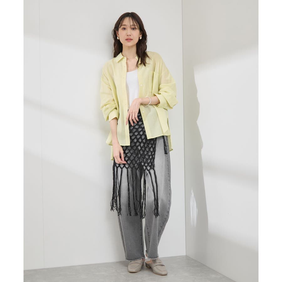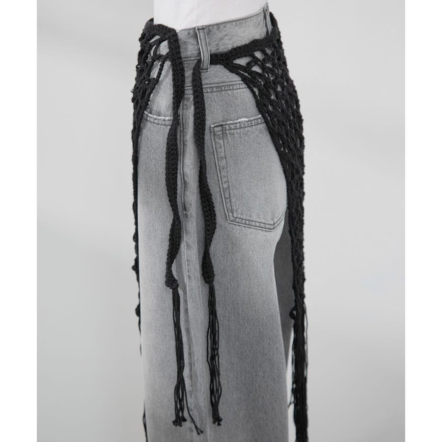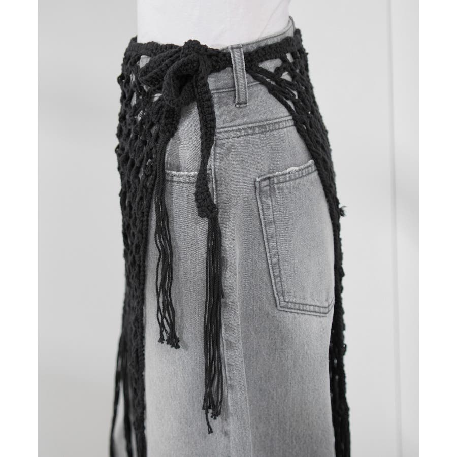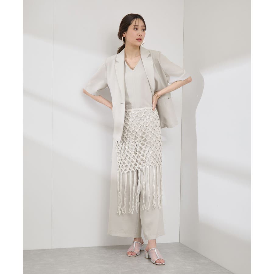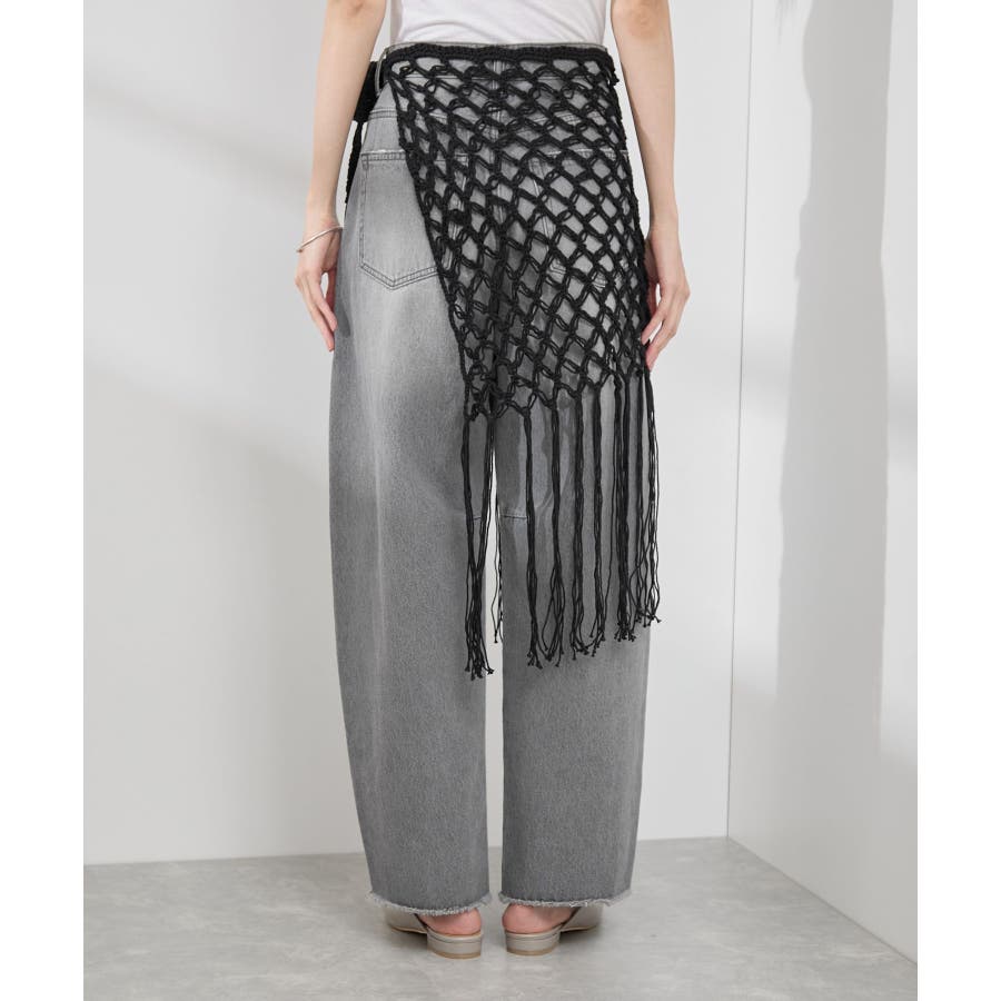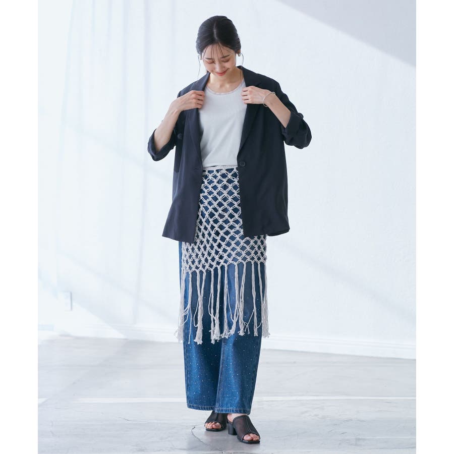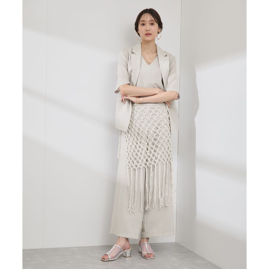 【素材感】 ・ラスティックな雰囲気のマットな糸。 【デザイン・シルエット】 ・トレンドのマクラメ風に編んだかぎ針のニット巻きスカート。 ・紐は左右どちらでもお好きな方で結べます。 ・裾に長めフリンジをあしらい、動きを出したデザイン。 【カラー】 ・ブラック、アイボリーの合わせやすいベーシックカラー2色展開。 【スタイリングポイント】 ・デニムとのレイヤードが一押し。 ・インナーペチを重ねてスカートとして穿く場合は、デニムのジャケットやシャツ合わせがおすすめ。 ----------------------------- 裏地:なし 透け感:あり 伸縮性:ややあり 生地感・厚さ:普通 季節:春・夏・秋・冬 ----------------------------- ※撮影時の光、お使いのモニター環境によって色の見え方が違う場合がございます。 ※モデル身長:165cm 着用サイズ:38