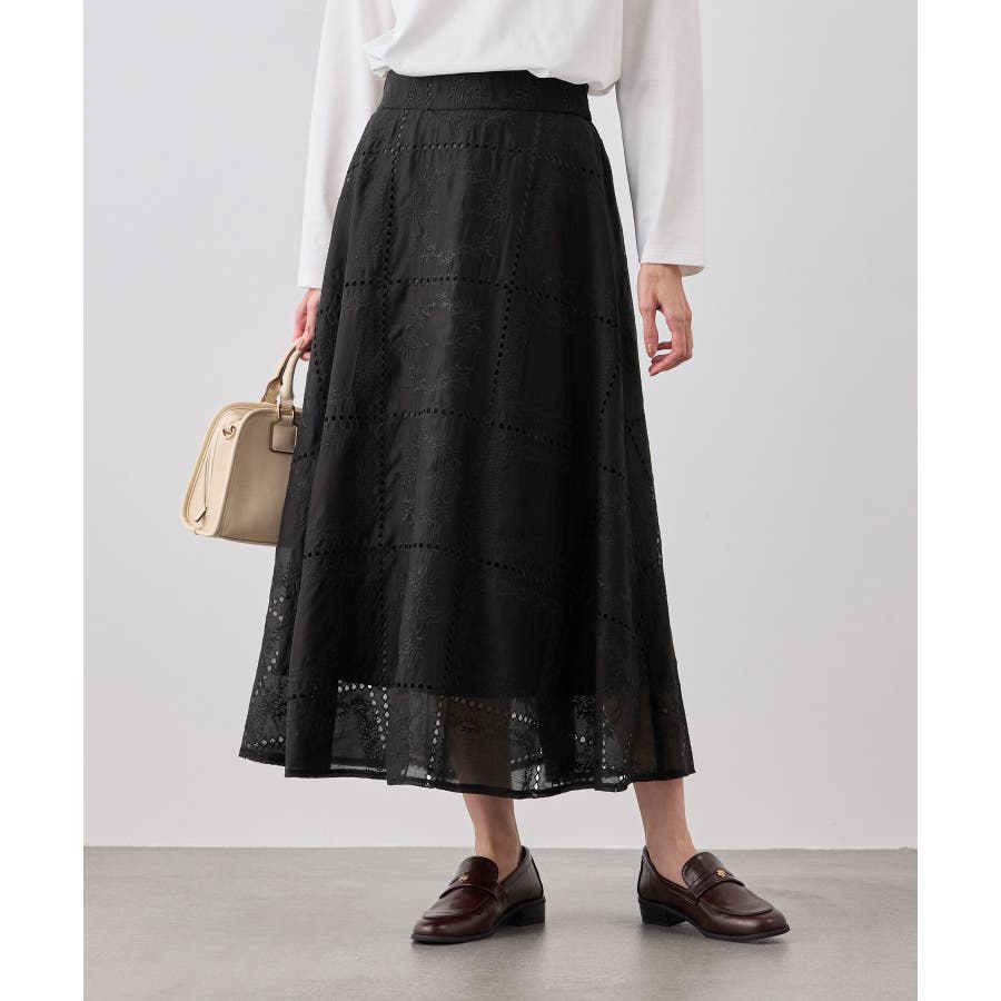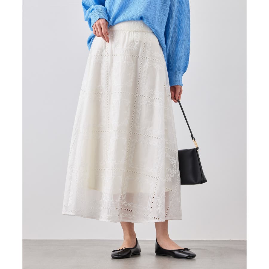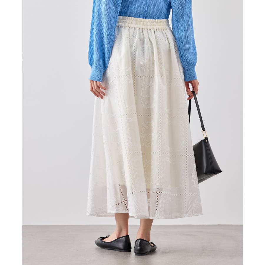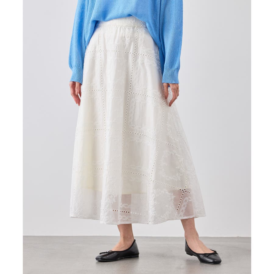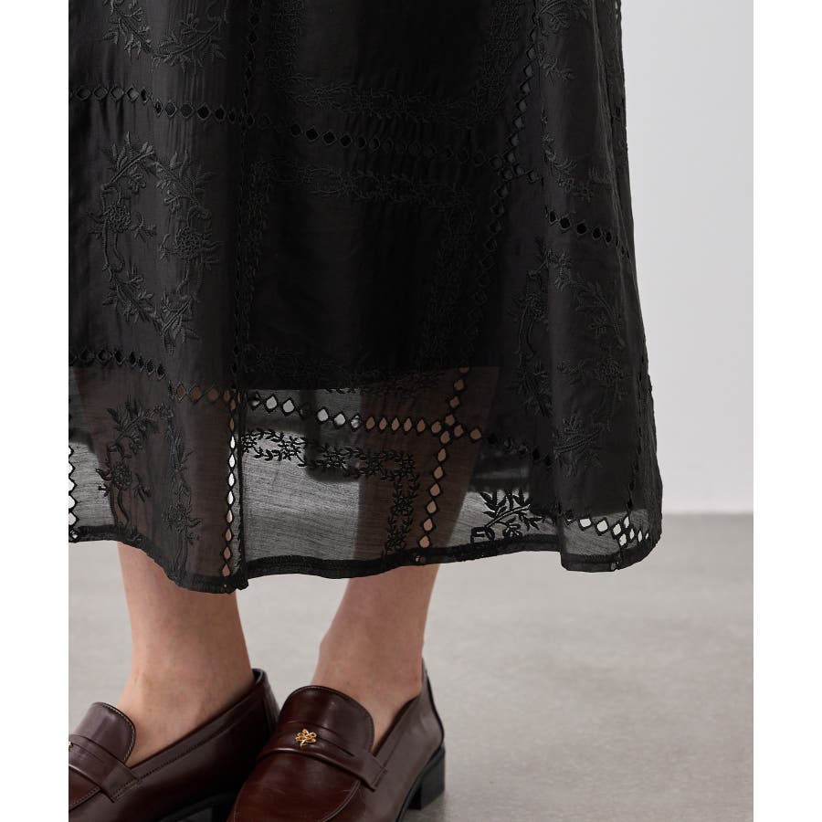 ・シンプルなニットやカットソーを合わせて、スカートの刺繍とシアー感を引き立てた着こなしも◎