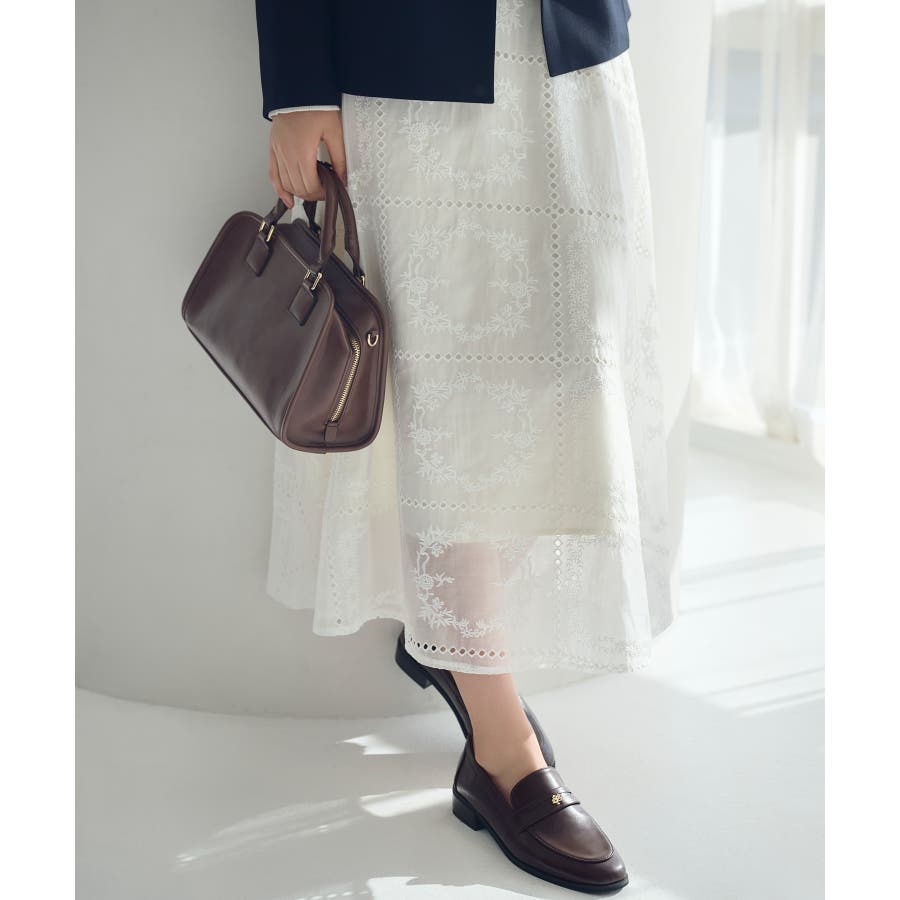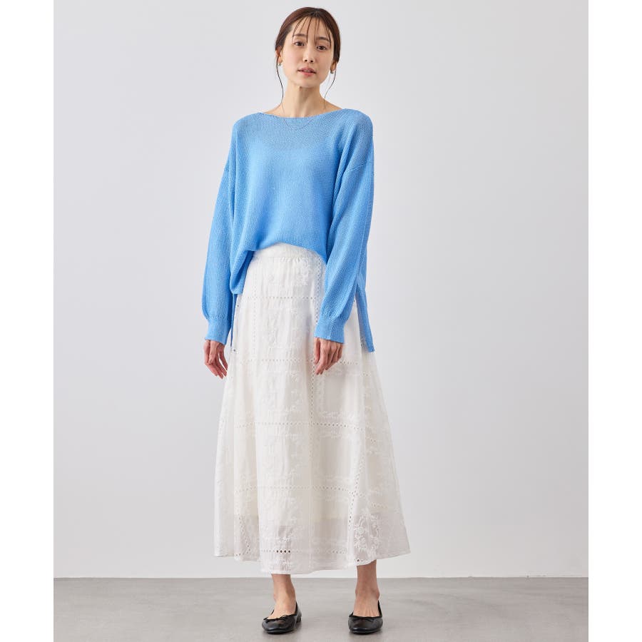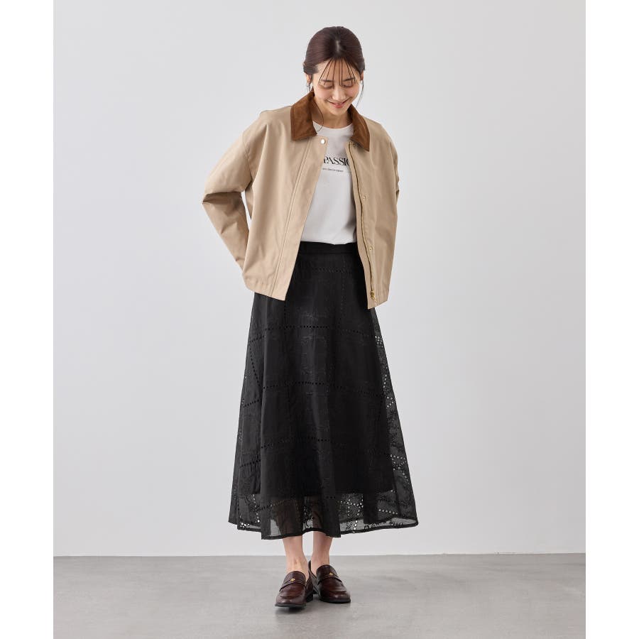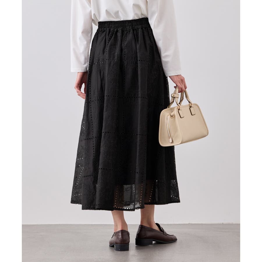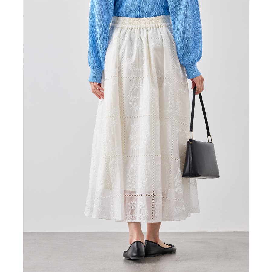 ・シンプルなニットやカットソーを合わせて、スカートの刺繍とシアー感を引き立てた着こなしも◎
