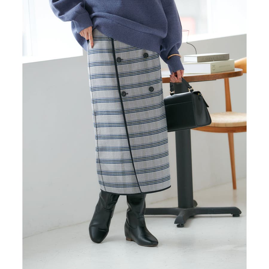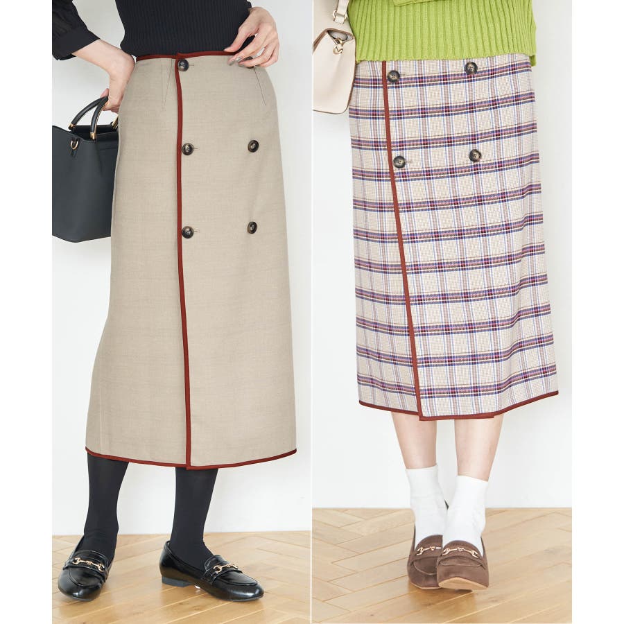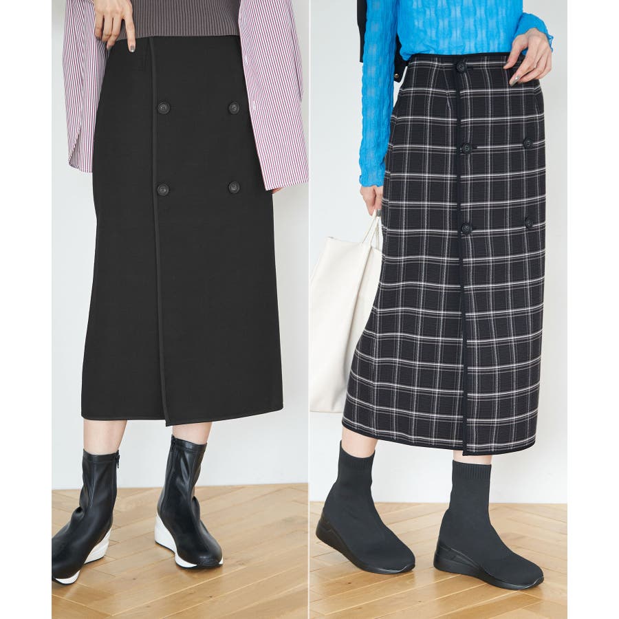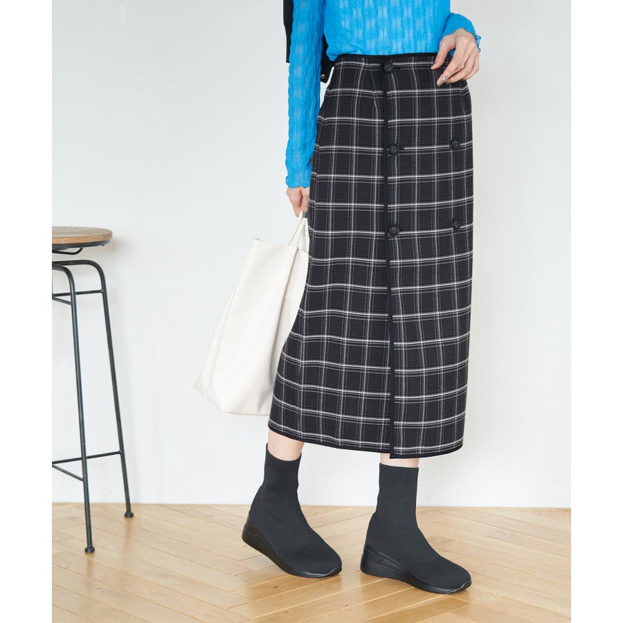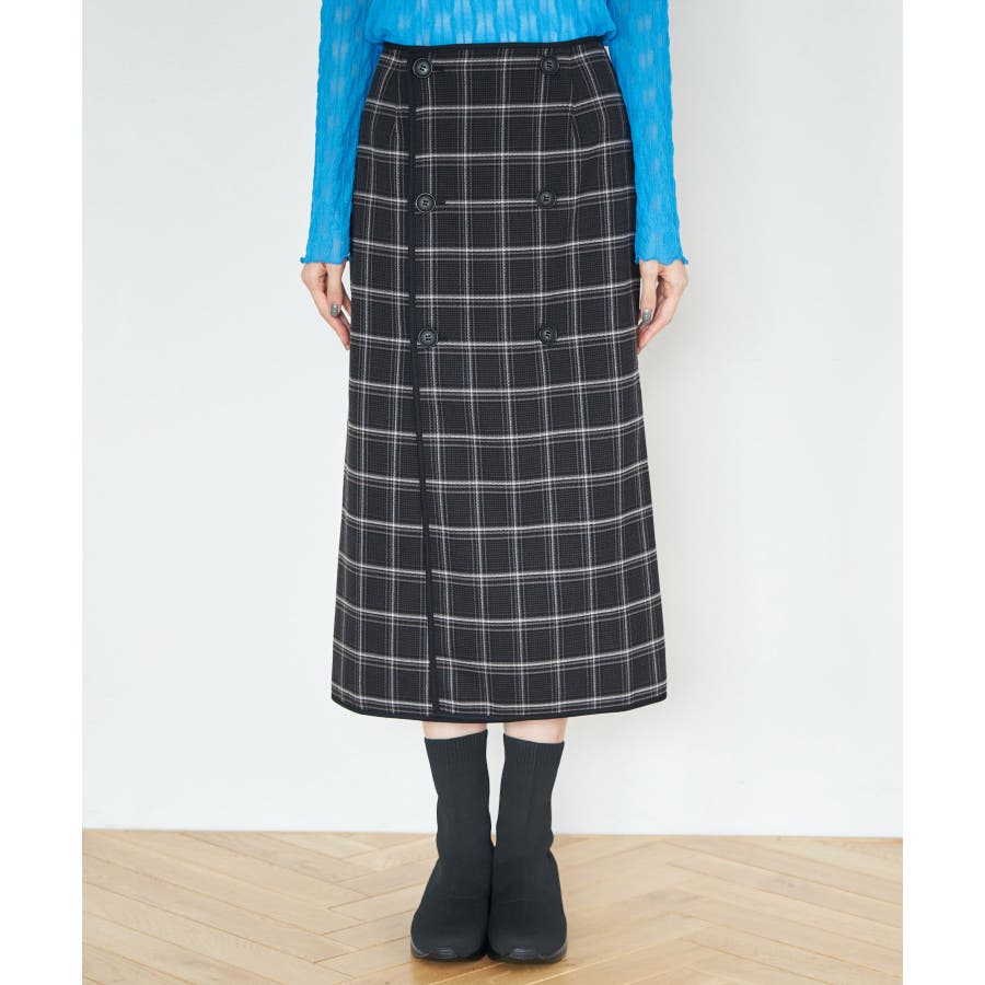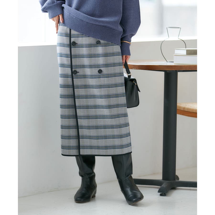 ・チェック柄と無地面を表裏にした、リバーシブル仕立てのラップスカート。
