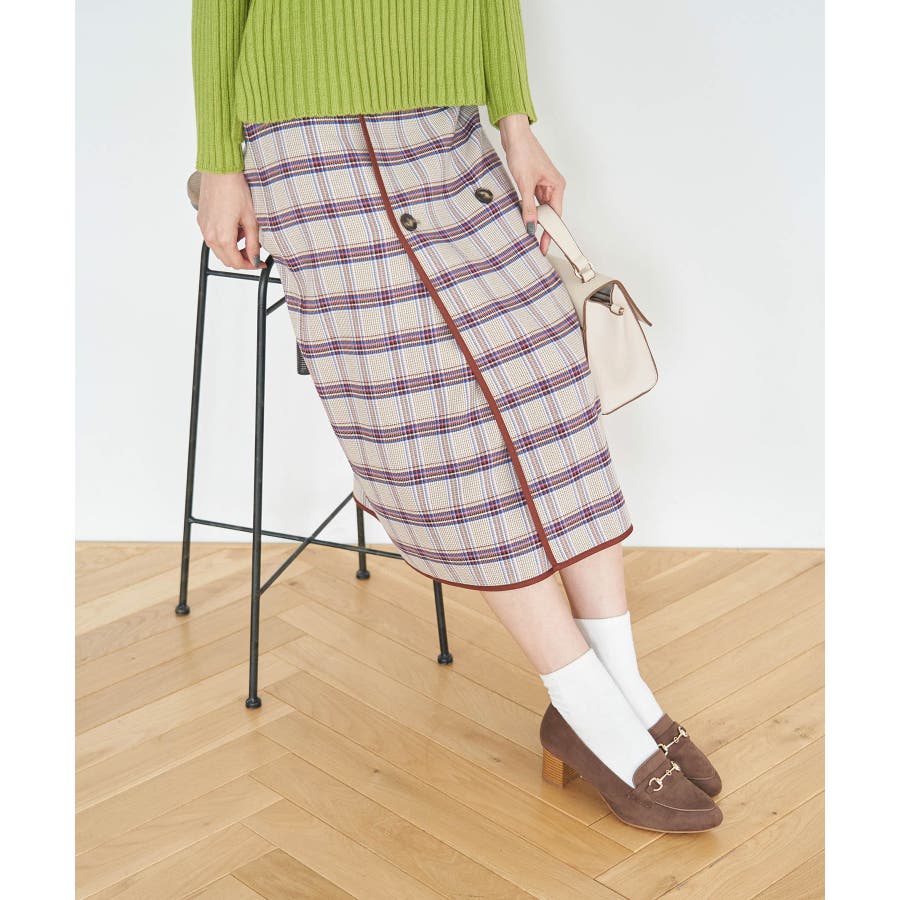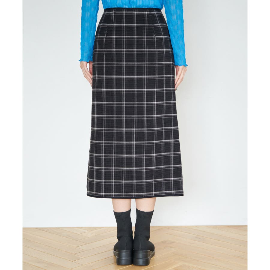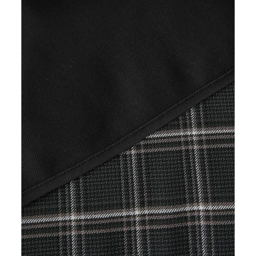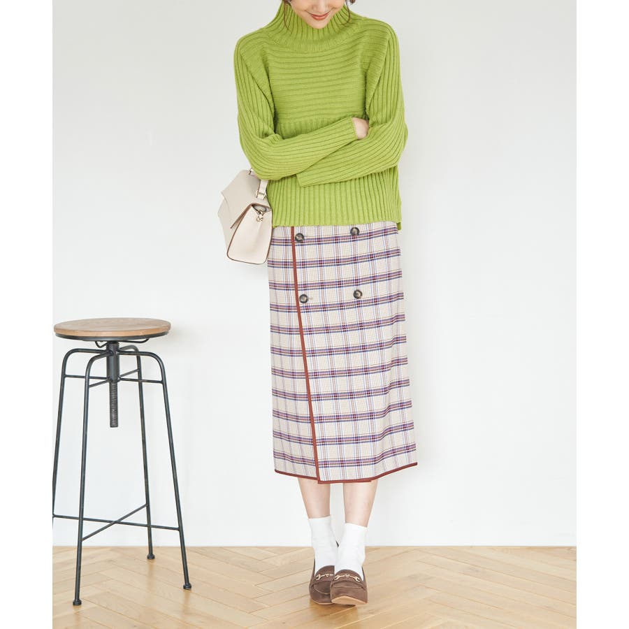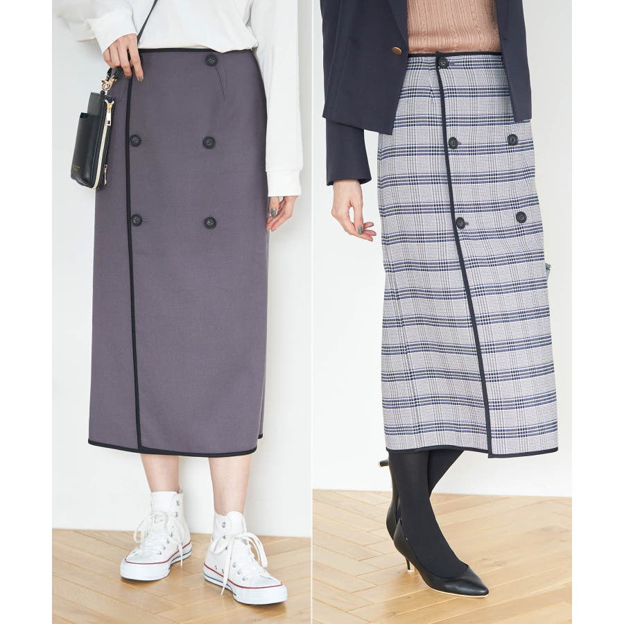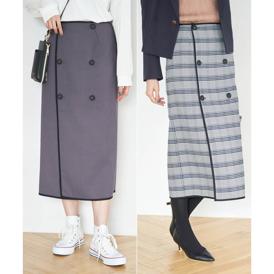 ・チェック柄と無地面を表裏にした、リバーシブル仕立てのラップスカート。