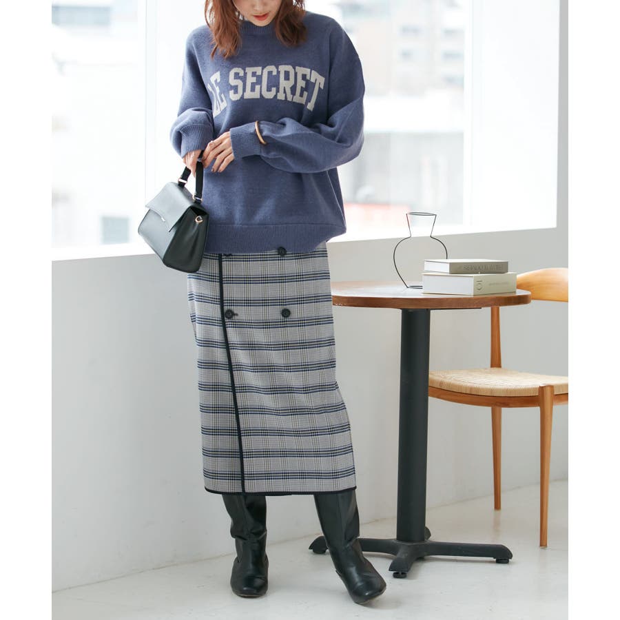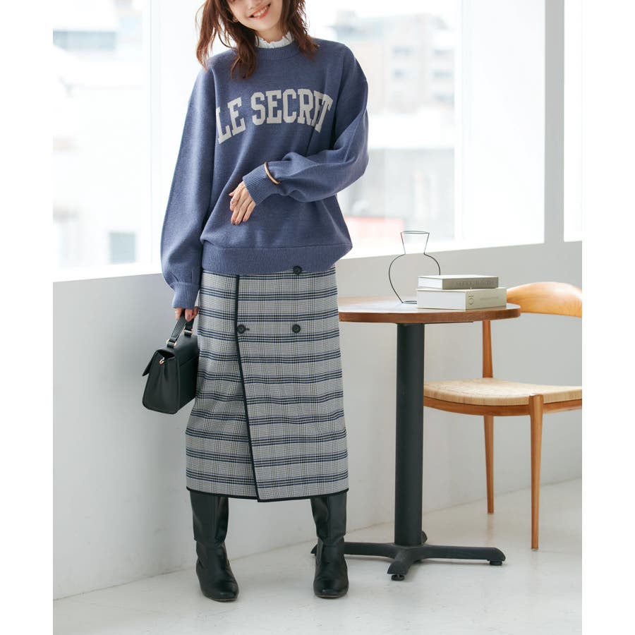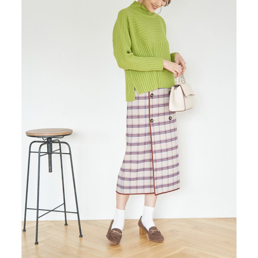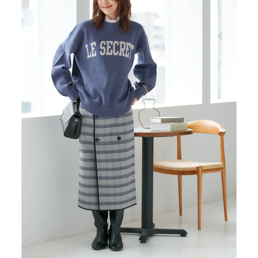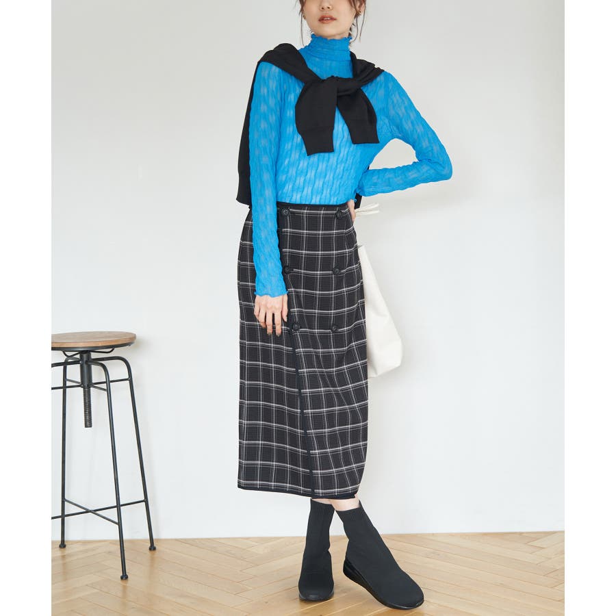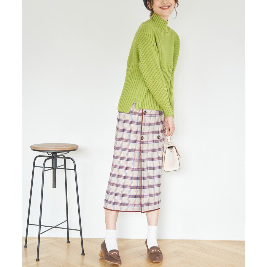 ・チェック柄と無地面を表裏にした、リバーシブル仕立てのラップスカート。
