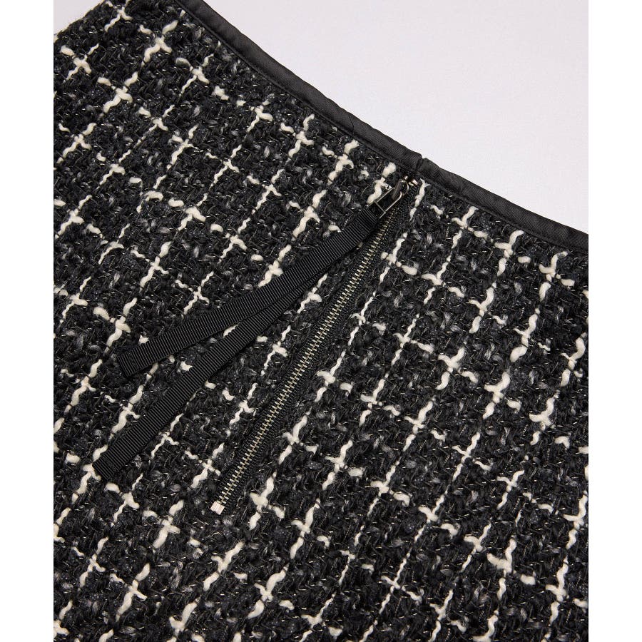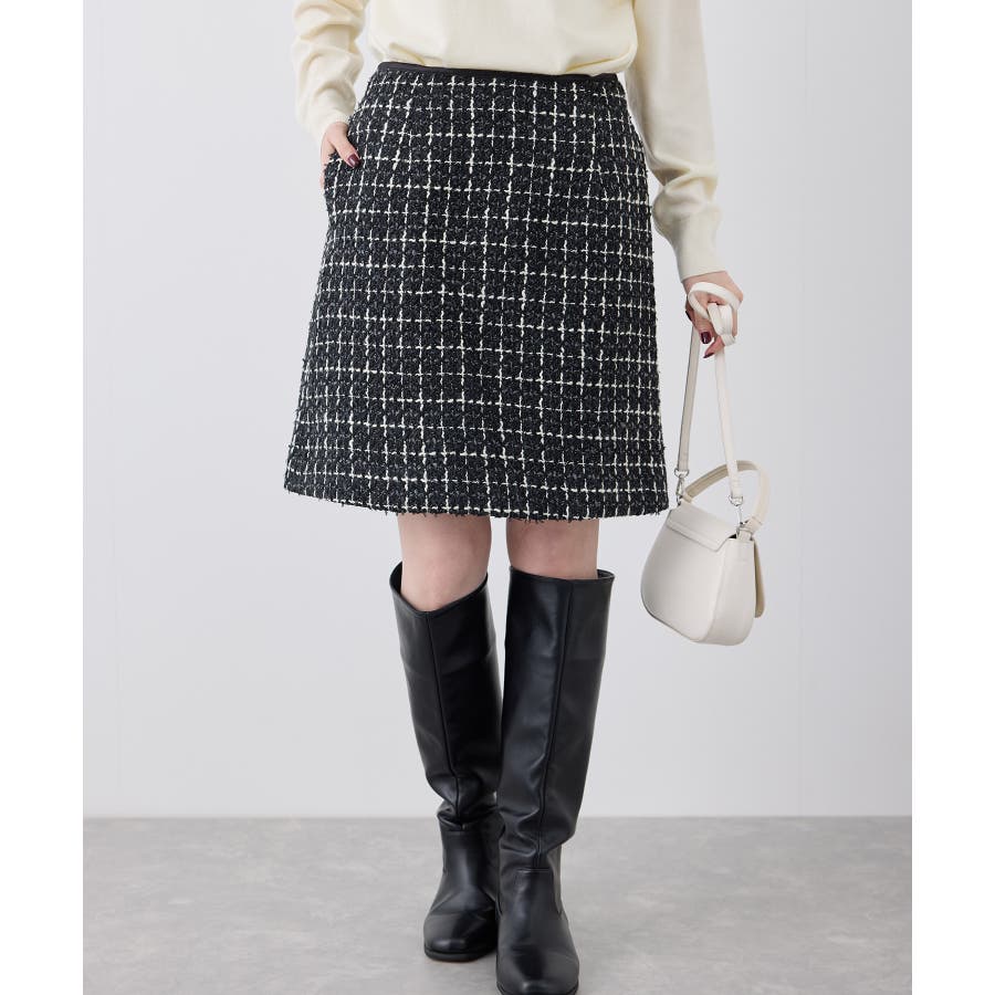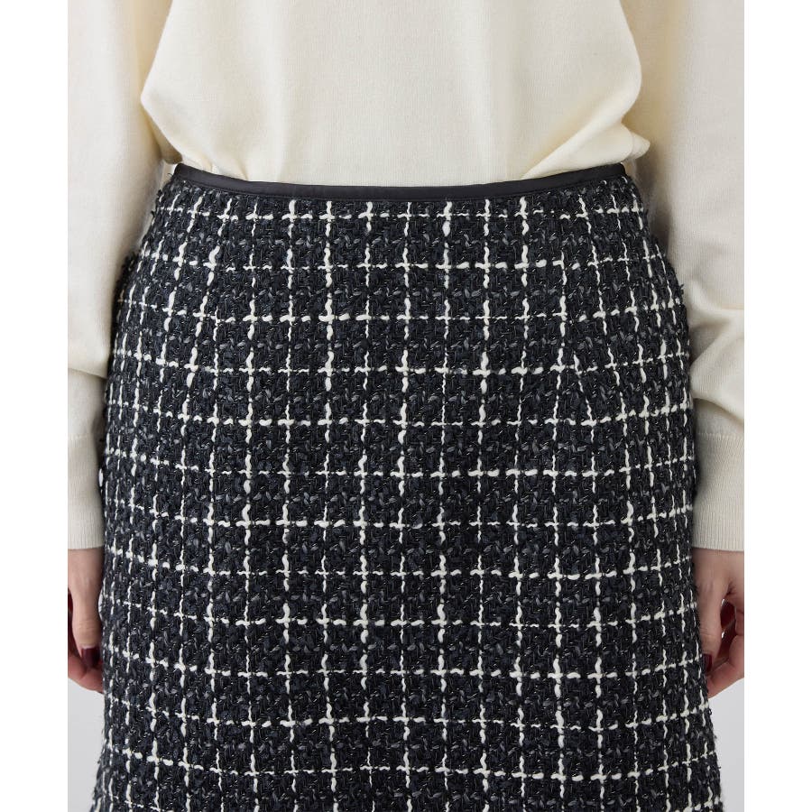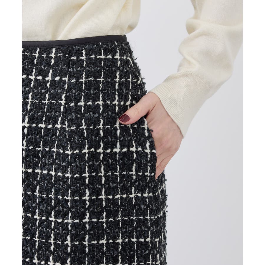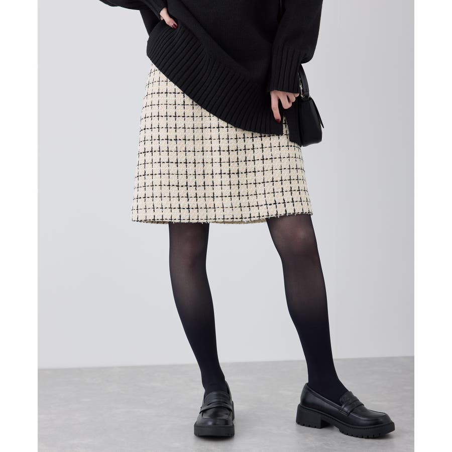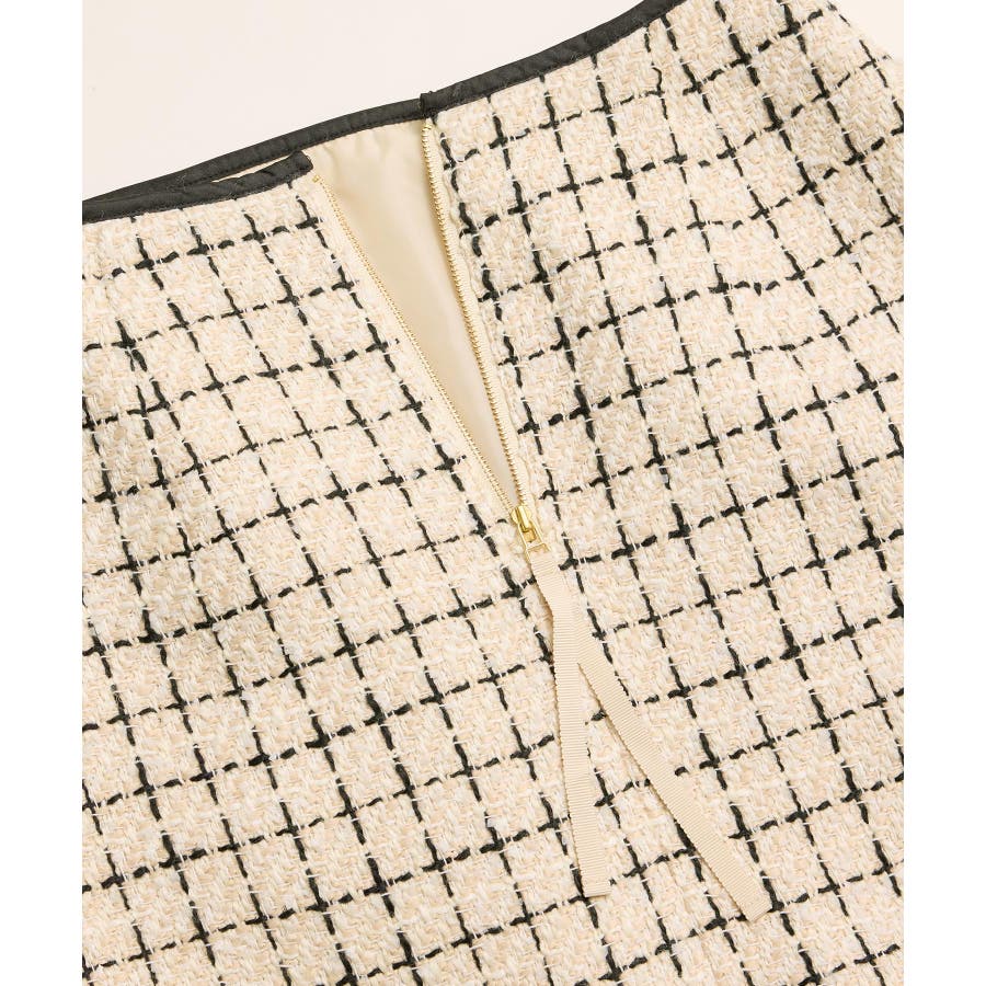 【素材感】 ・ブラック系(02)には薄金のラメ糸を、キナリ系(17)にはゴールドラメを入れたこだわりの生地を使用。 【デザイン・シルエット】 ・チェック柄ツイードのミニスカート。 ・広がりすぎない台形シルエットで大人な印象。 ・バックファスナーにあしらった引手がポイント。 ・秋冬らしい暖かなルックス。 【カラー】 ・アイボリー、ブラックのモノクロカラー2色で展開。 【スタイリングポイント】 ・クラシカルなリブタートルに合わせてスカートを主役に。 ・カレッジロゴ入りのスウェットシャツやフーディー合わせもおすすめ。 ・ゆったりフォルムのセーターに合わせればトレンド感もアップ。 ・ロングブーツやカラータイツで足もとのおしゃれも楽しんで。 ・同シリーズでジレ(品番:GDV54130)も展開しているので、セットアップとしても◎ ・同シリーズでKIDSのビスチェ(品番:GRH64020)、スカート(品番:GRC64030)も展開しているので、親子お揃いも一押し。 ----------------------------- 裏地:あり 透け感:なし 伸縮性:なし 生地感・厚さ:普通 ポケット:あり その他仕様:後ろファスナー 季節:春・秋 ----------------------------- ※撮影時の光、お使いのモニター環境によって色の見え方が違う場合がございます。 ※モデル身長:165cm 着用サイズ:38