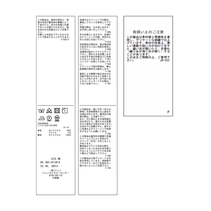 | 素材 | ブラック系(02):(表地) ポリエステル 98% アクリル 2% (裏地) ポリエステル 100%|キナリ系(17):(表地) ポリエステル 98% アクリル 2% (裏地) ポリエステル 100% |