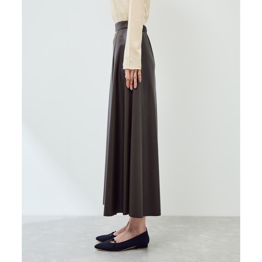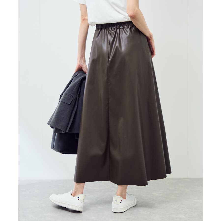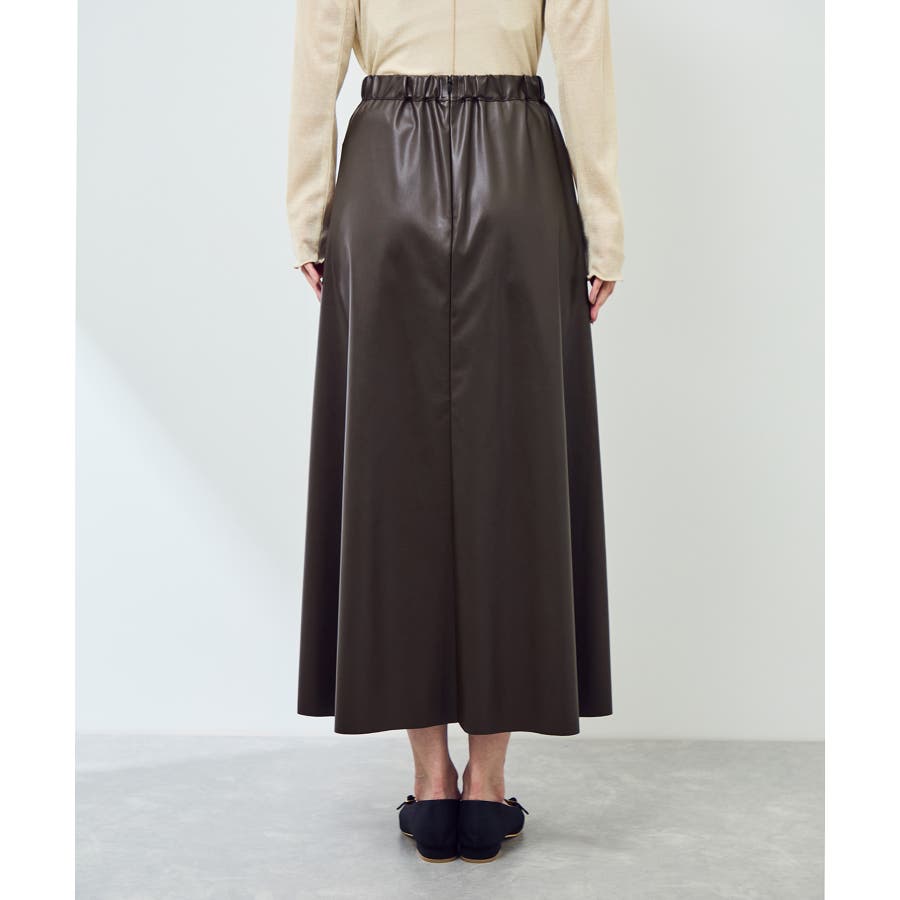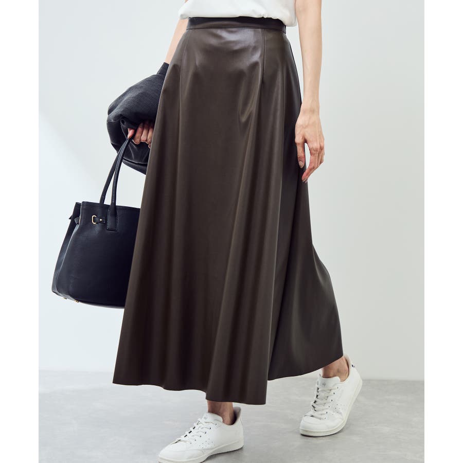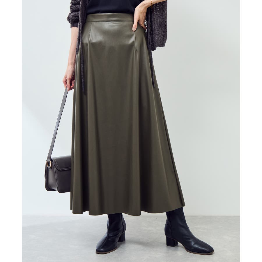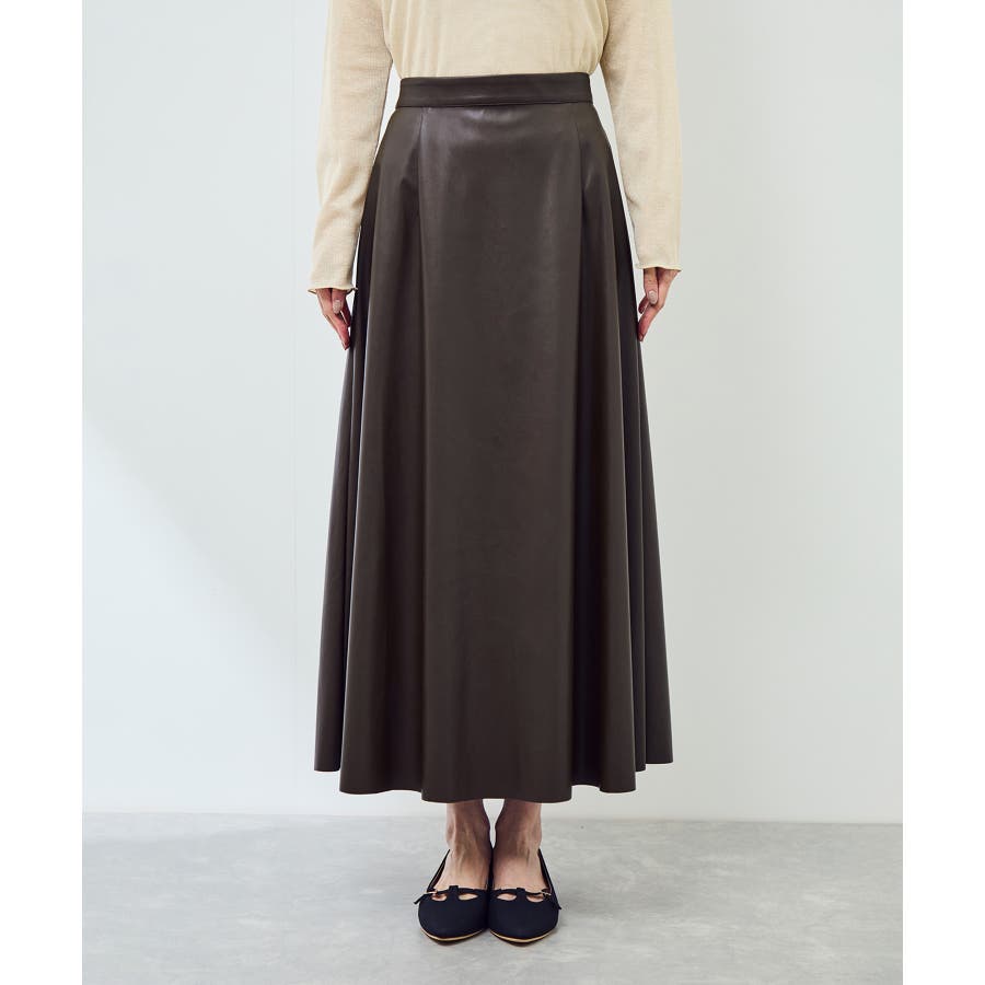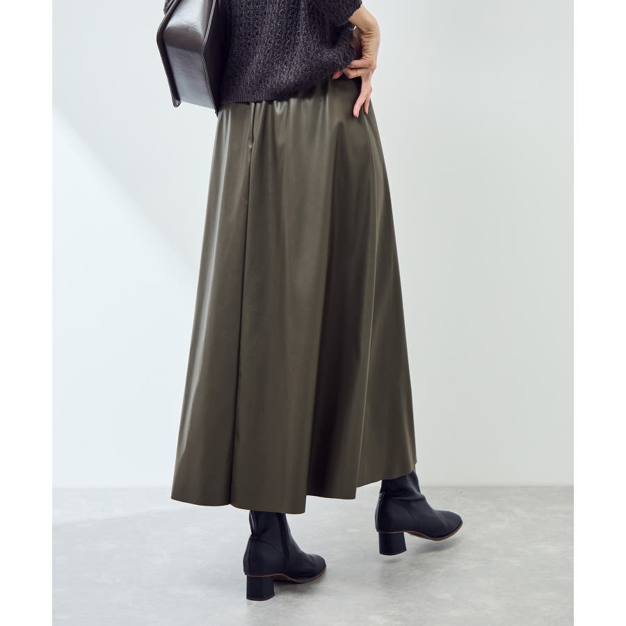 ・色合いがしっかりと出る、シンセティックレザーを用いたフレアスカート。