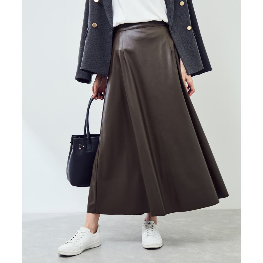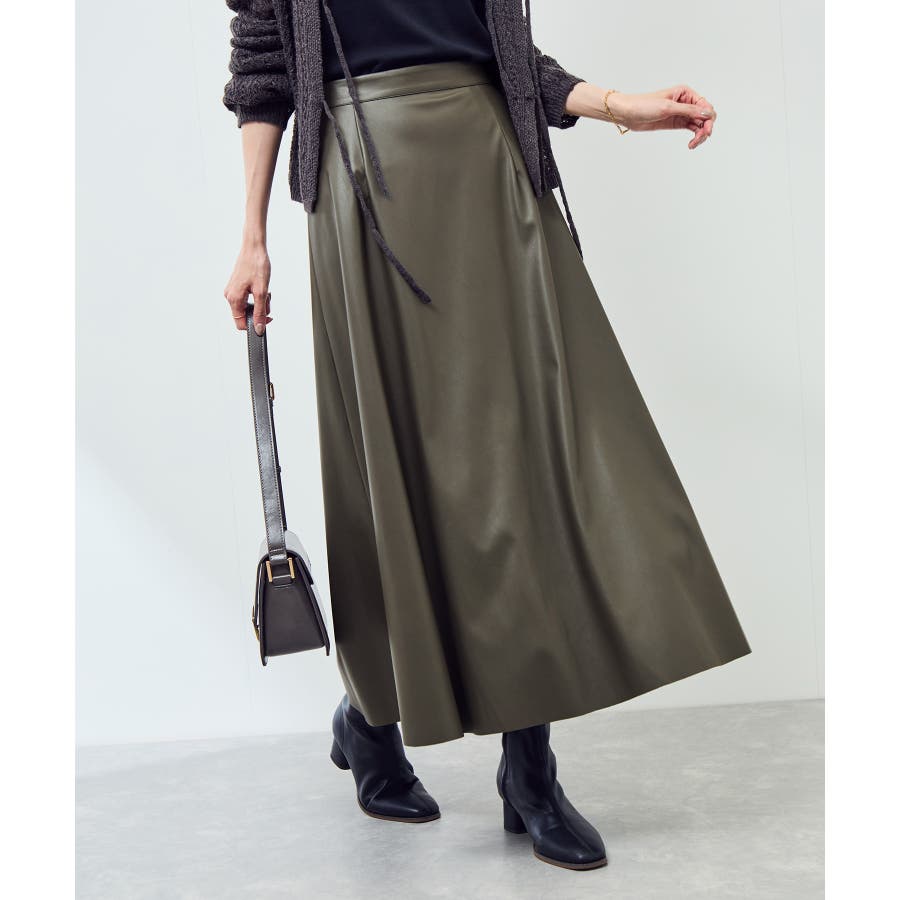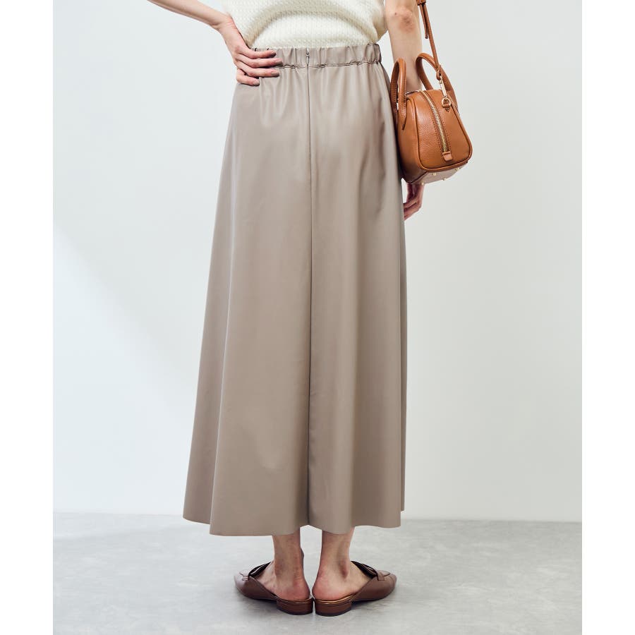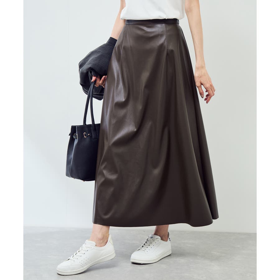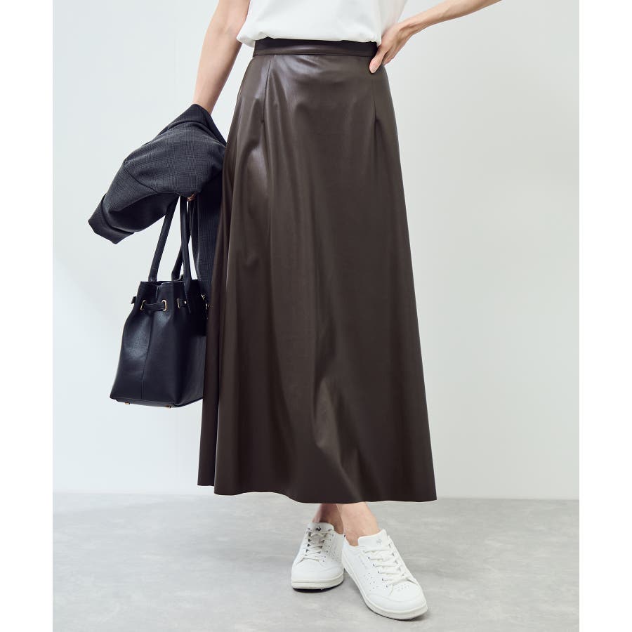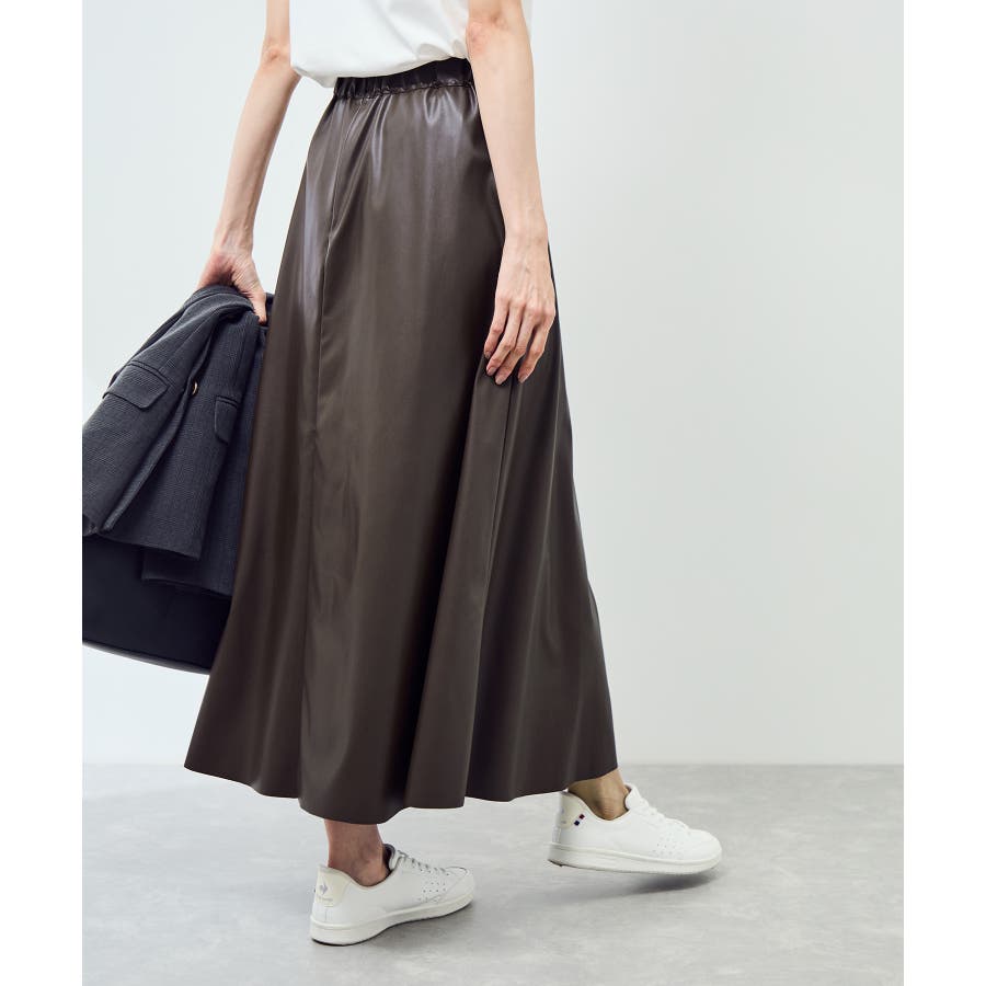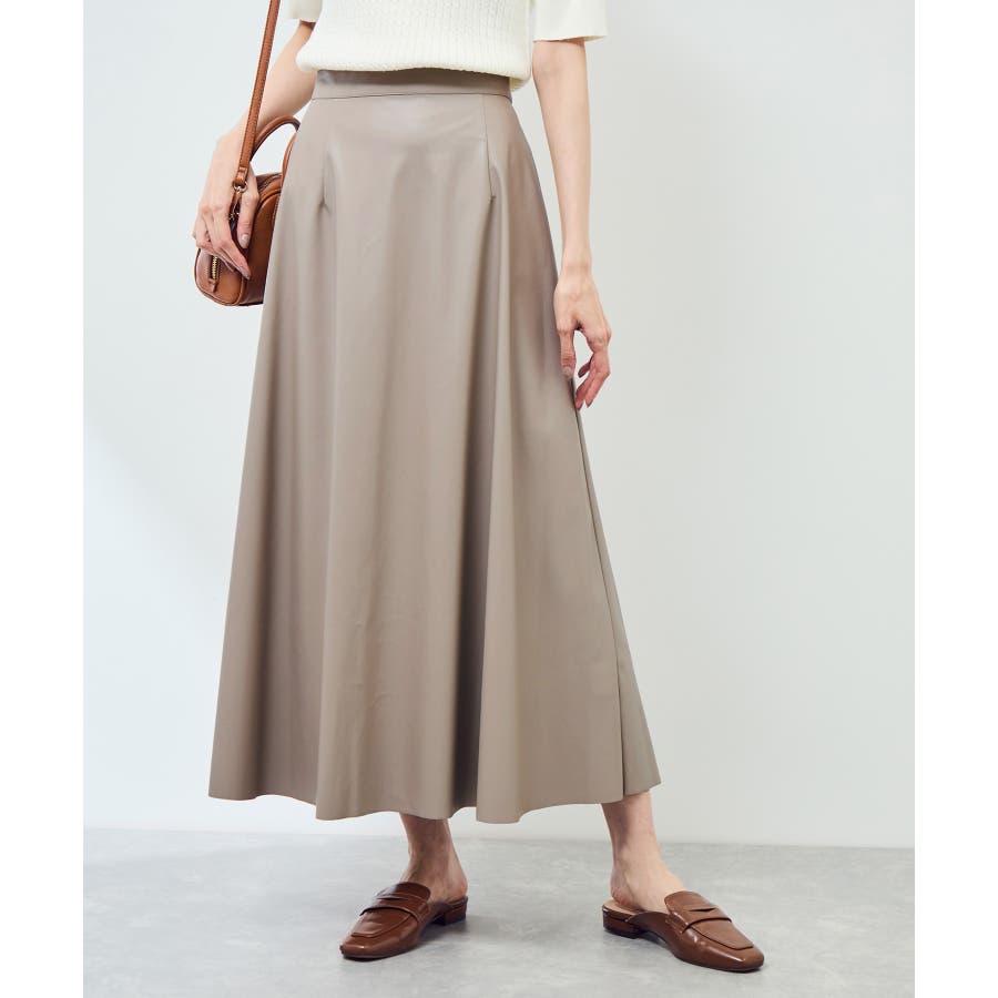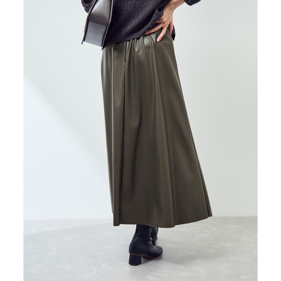 ・色合いがしっかりと出る、シンセティックレザーを用いたフレアスカート。