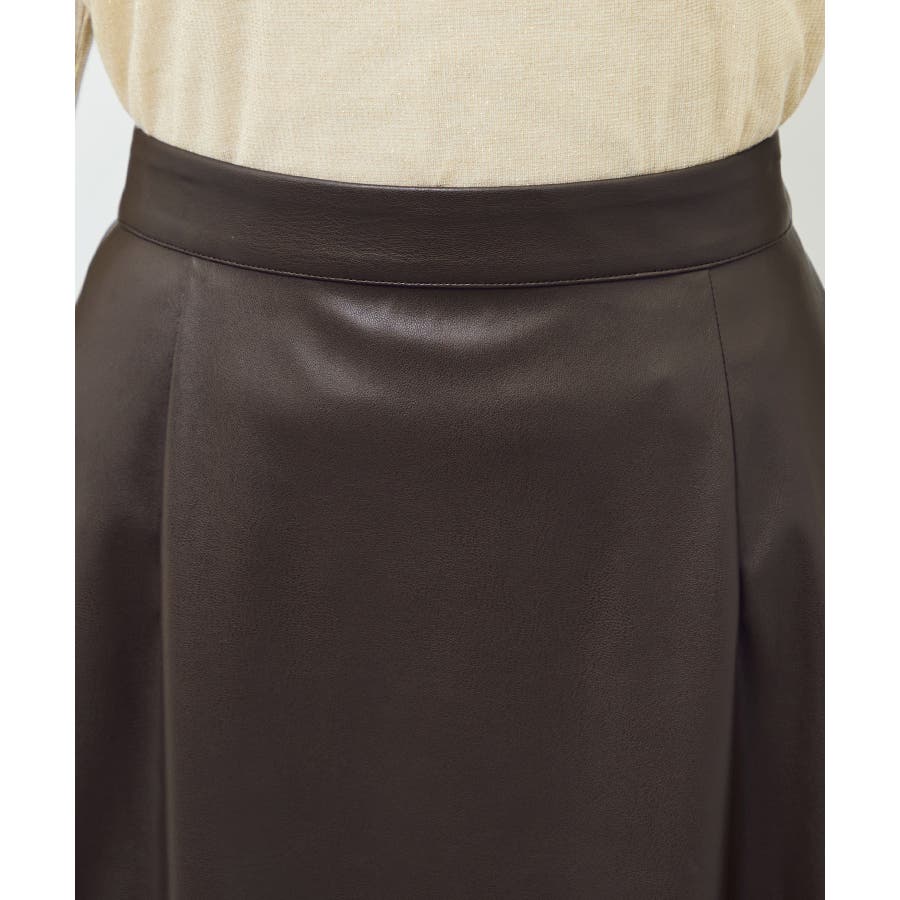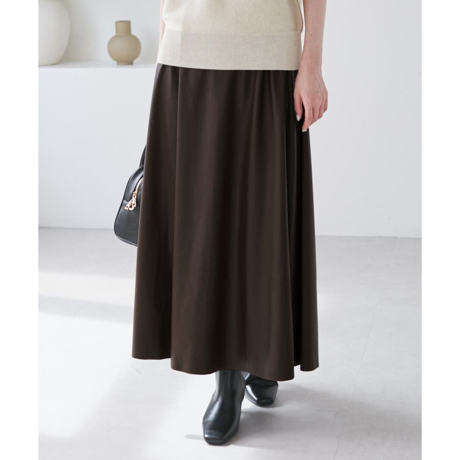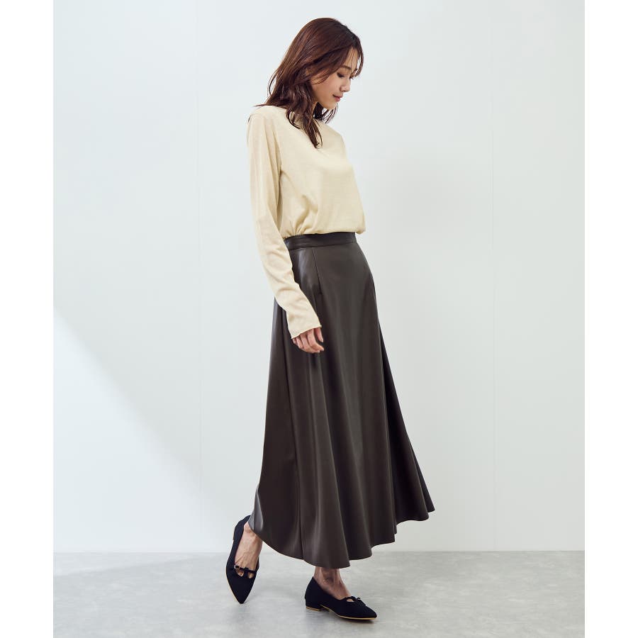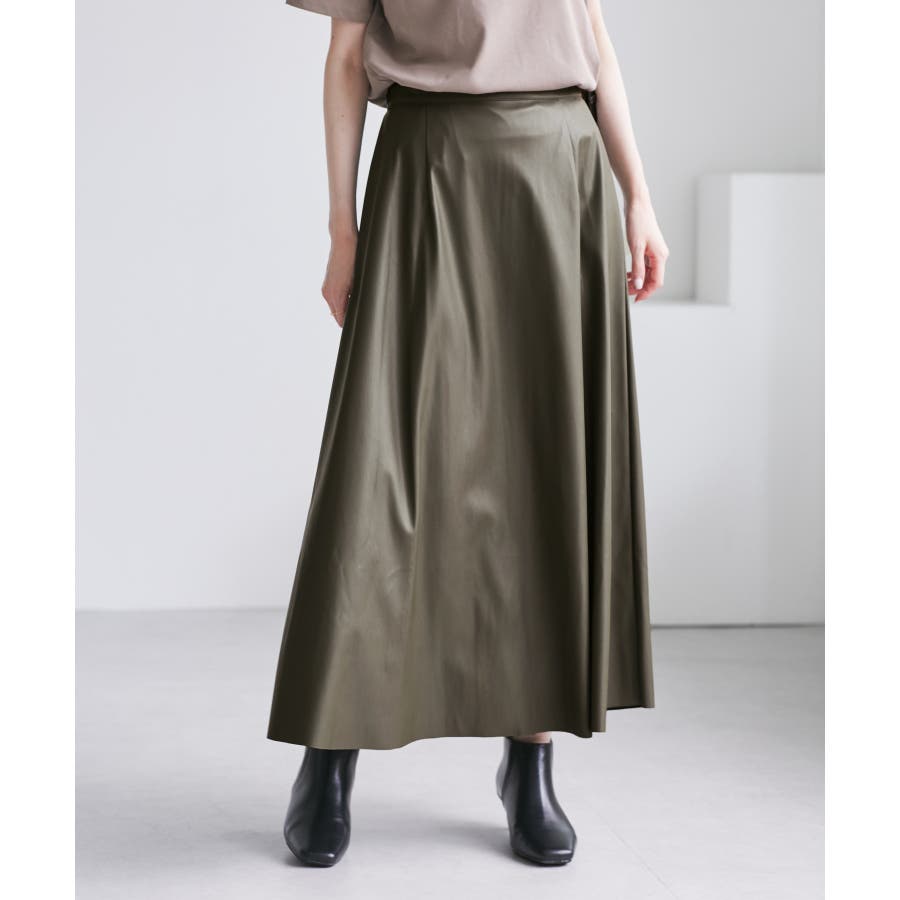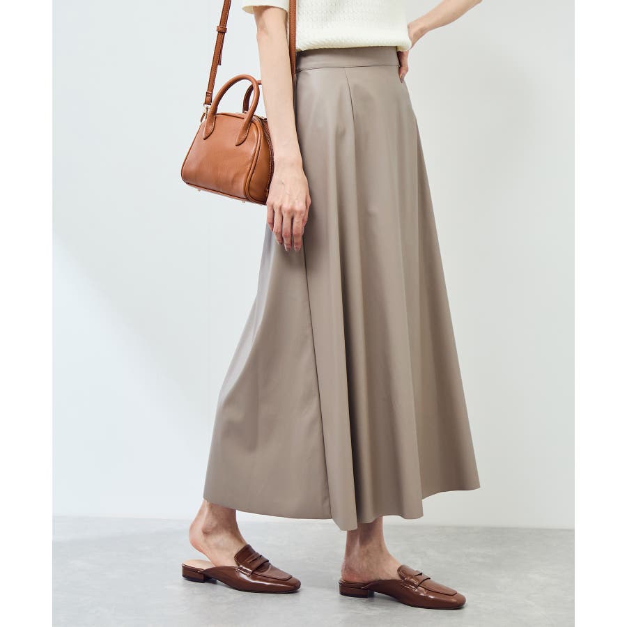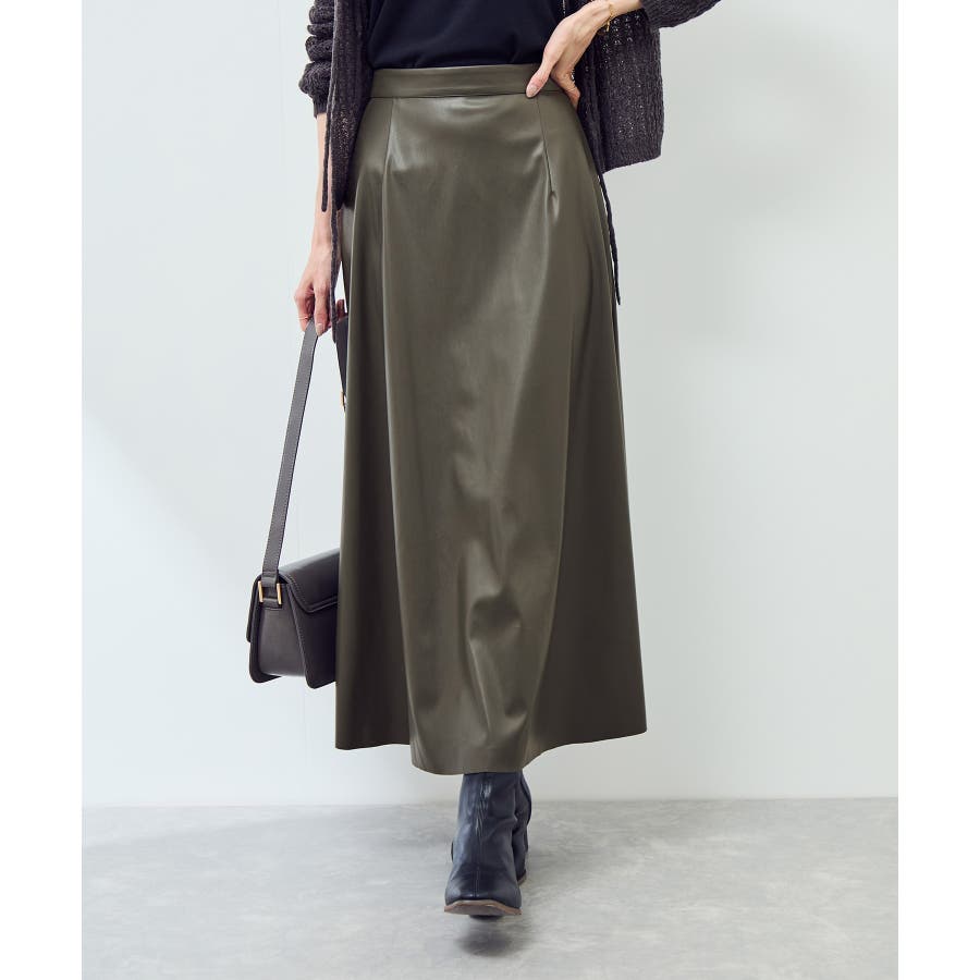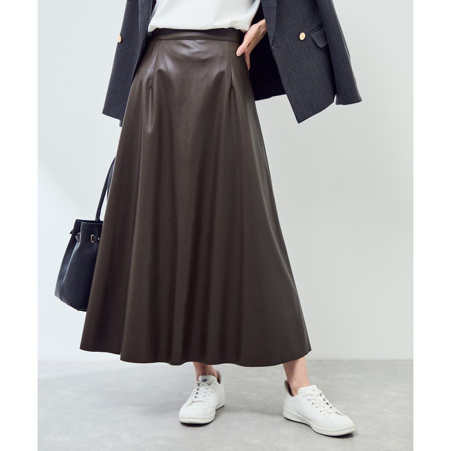 ・色合いがしっかりと出る、シンセティックレザーを用いたフレアスカート。