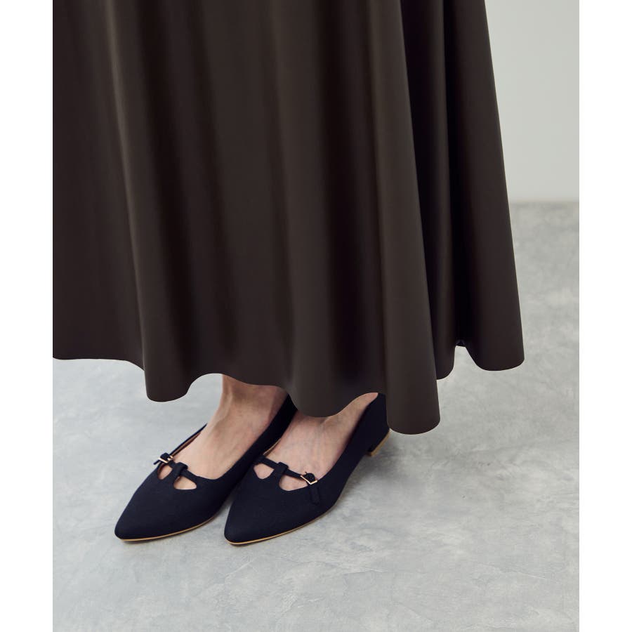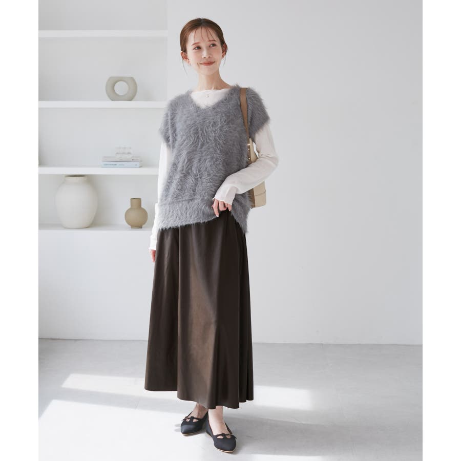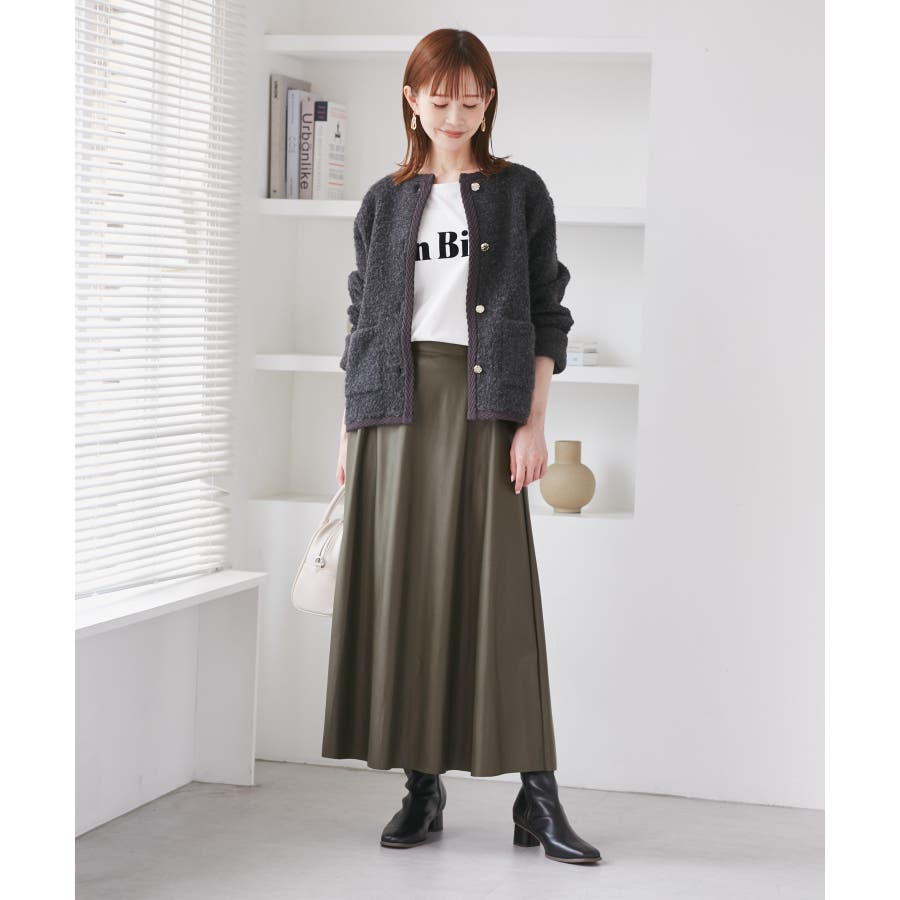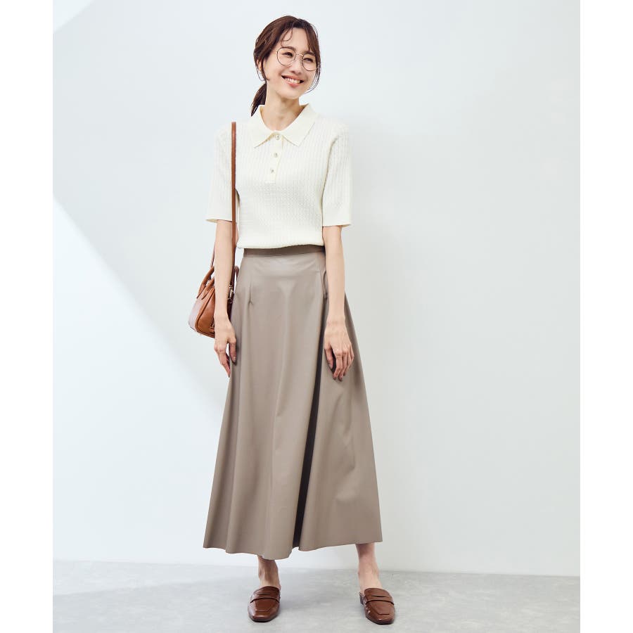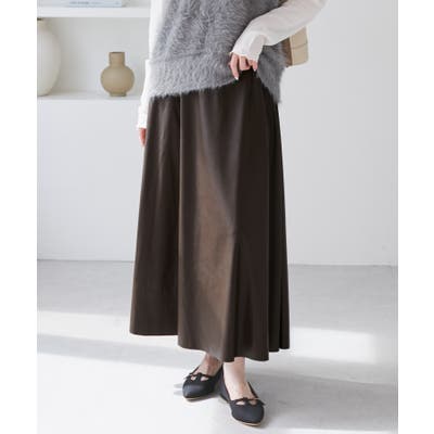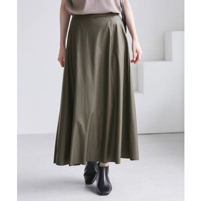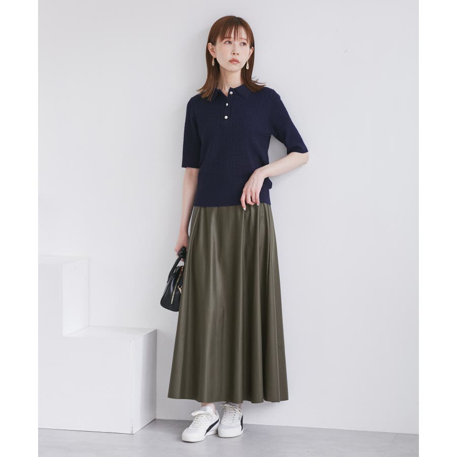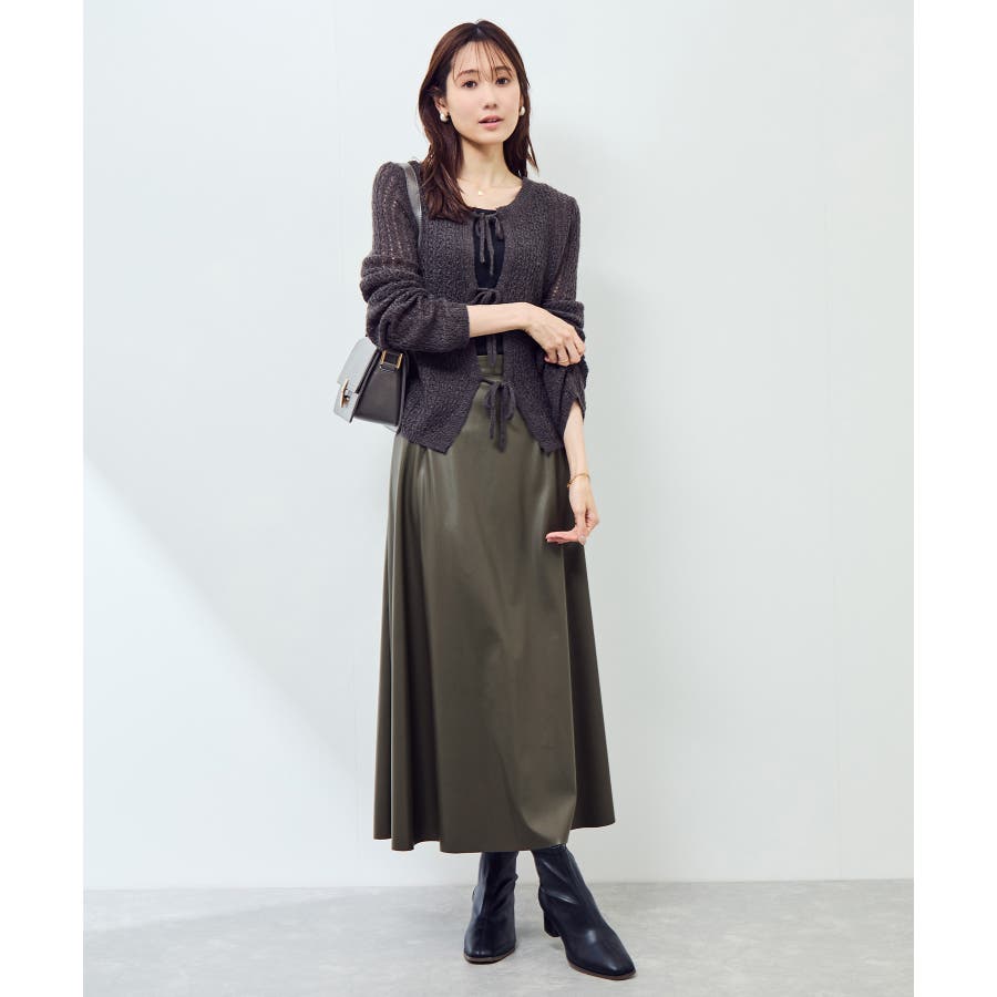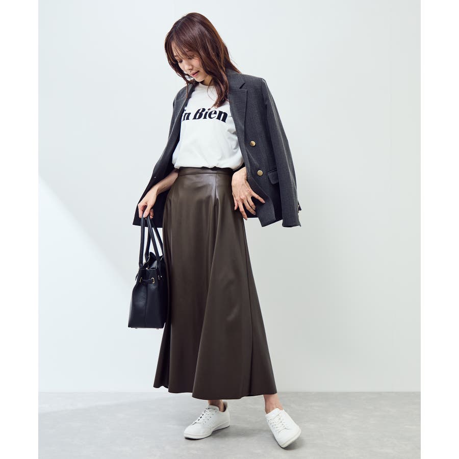 ・色合いがしっかりと出る、シンセティックレザーを用いたフレアスカート。