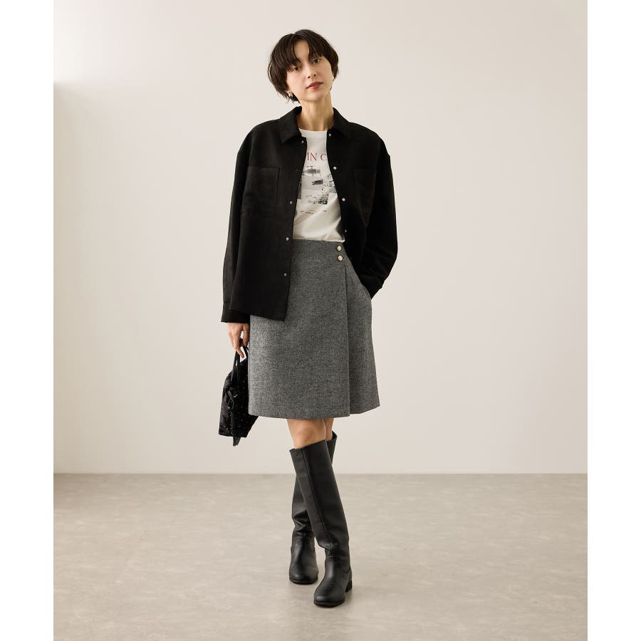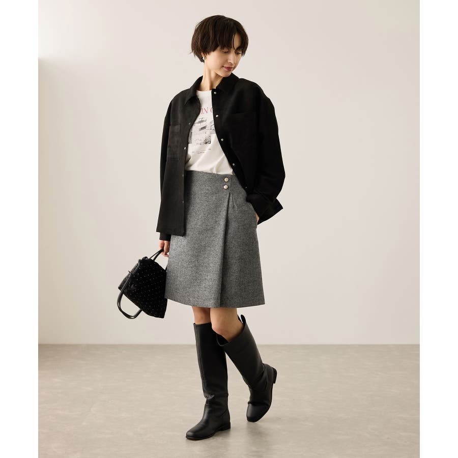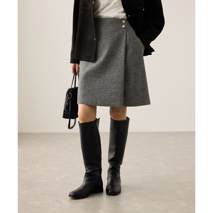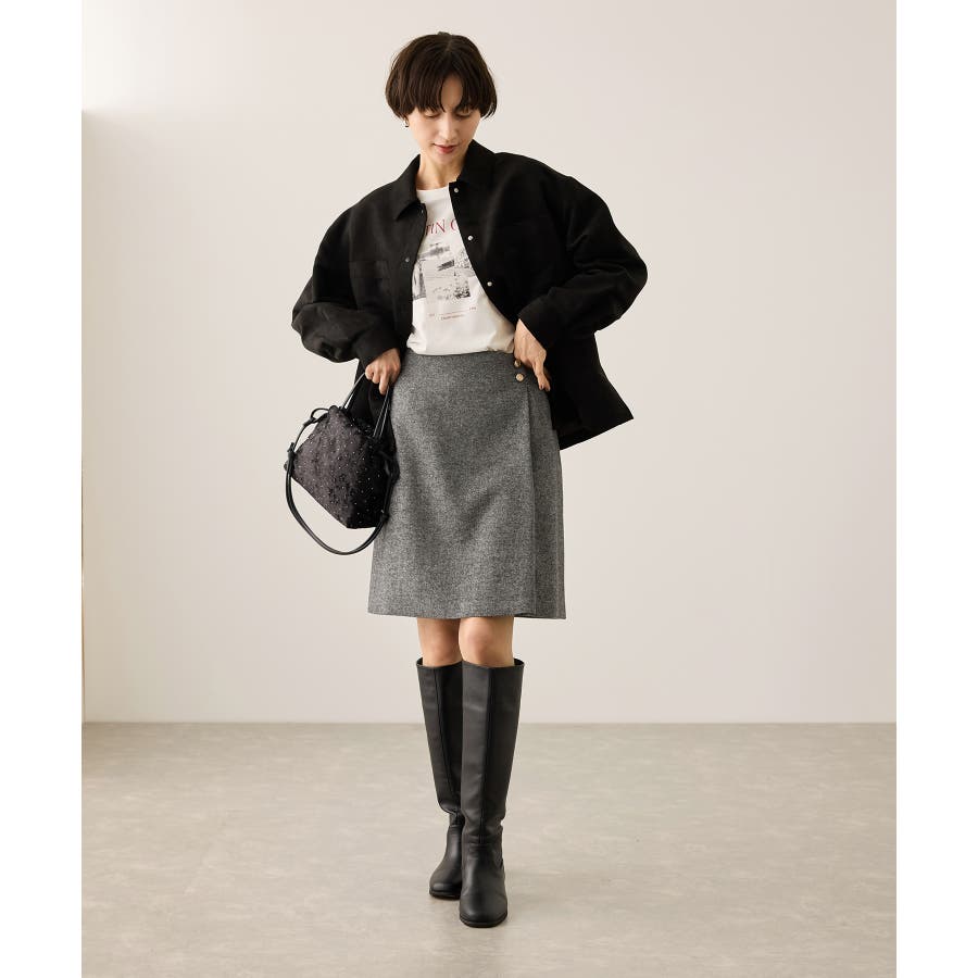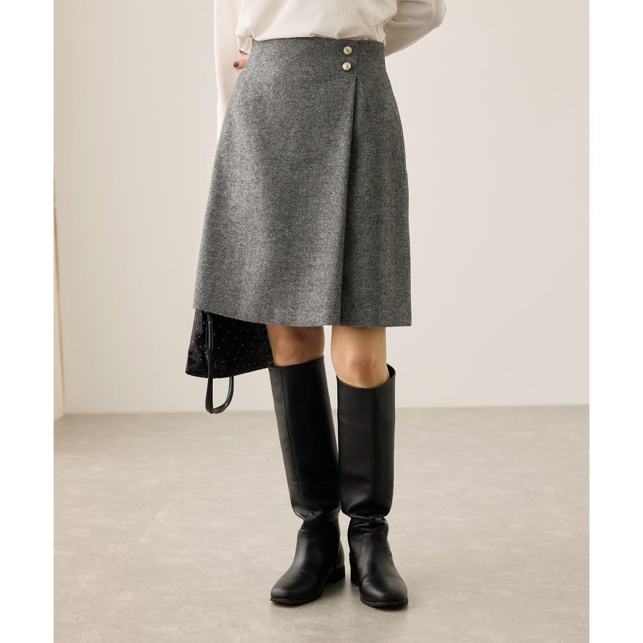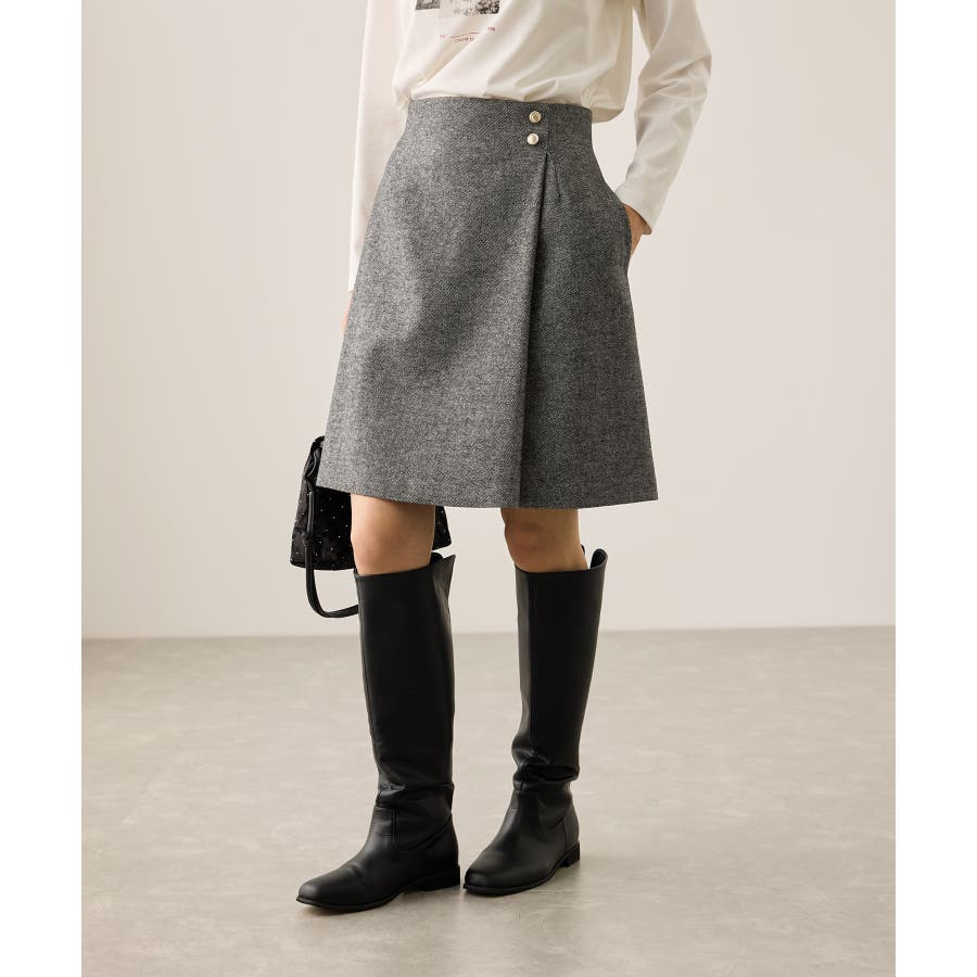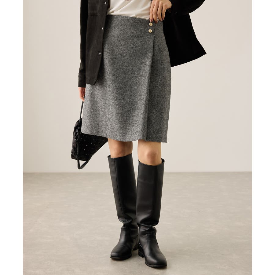 ・ハイウエストで脚長の効果もあり、ラップ風のデザインが腰まわりをすっきりと見せる。
