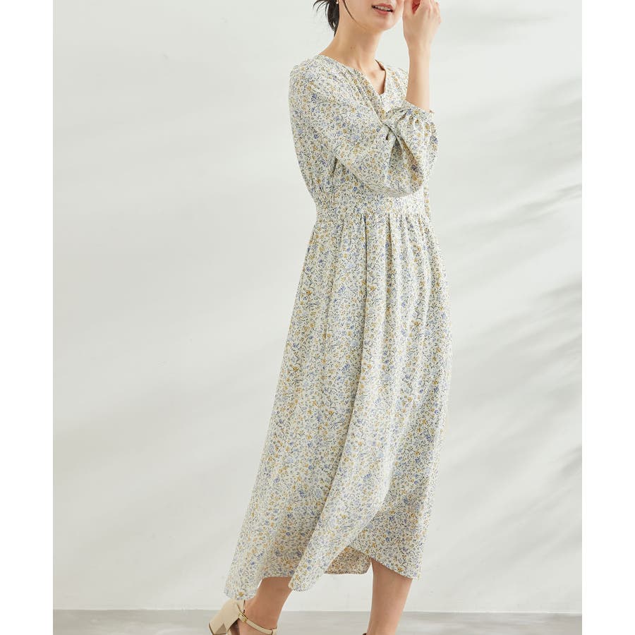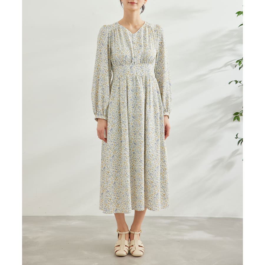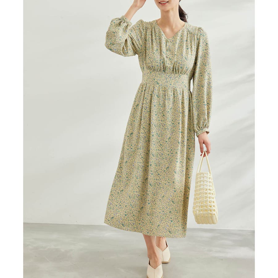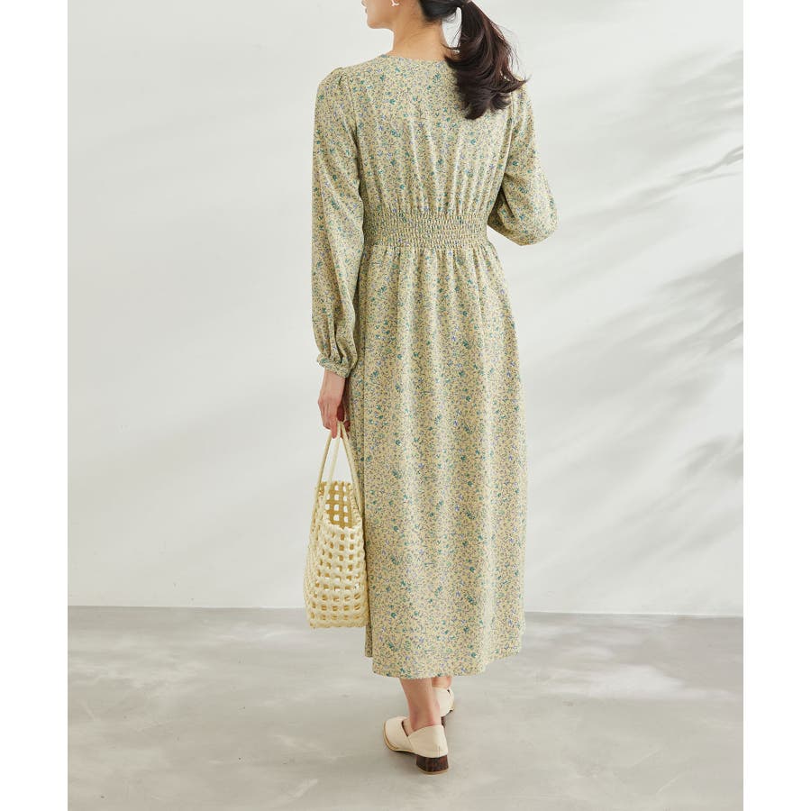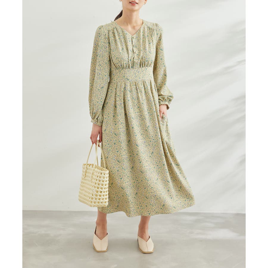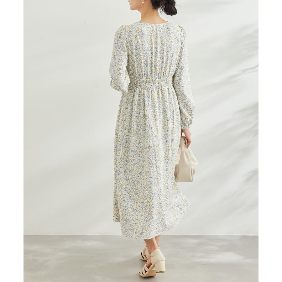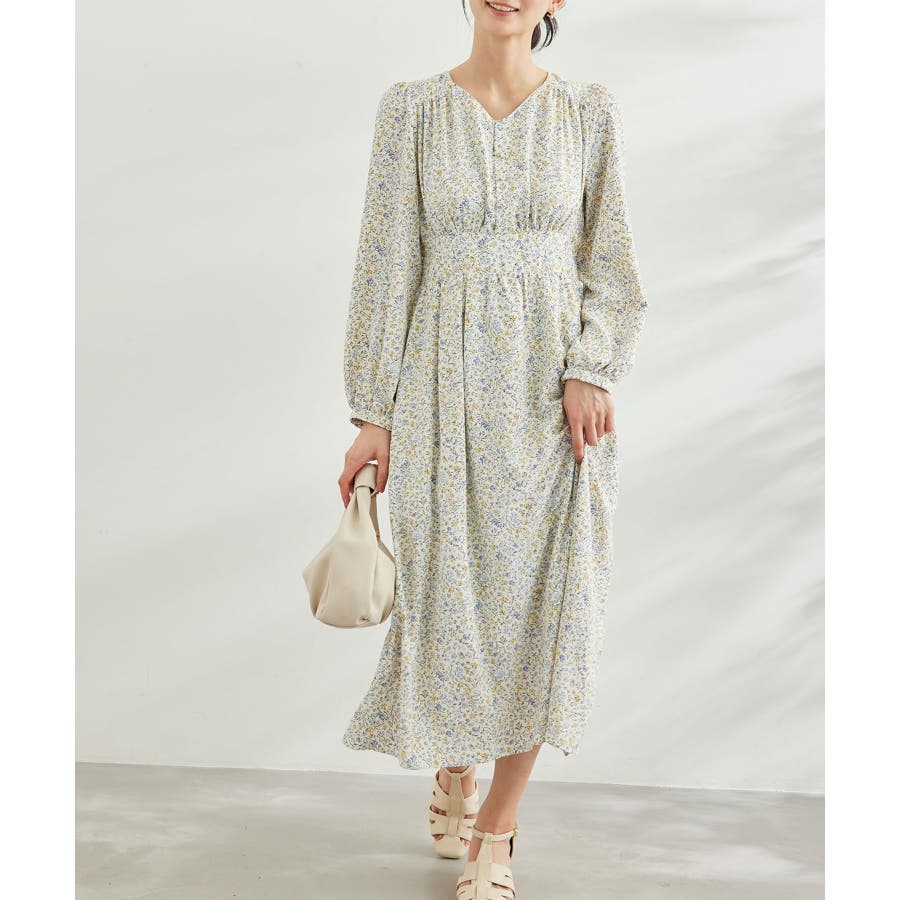 【素材感】 ・表面感のあるドビー素材を使用。 【デザイン・シルエット】 ・ハイウエストで切り替えを入れた、メリハリシルエットの長袖ワンピース。 ・取り入れやすいシックな小花プリント。 ・ウエストは後ろがギャザー使いでラクチン。 ・大人が着やすいロング丈。 【カラー】 ・オフホワイト、ベージュ、ネイビーのベーシックカラー3色展開。 ・ベージュ(27)は黄色に近い色味。 ・ネイビー(40)は濃いグレーのような色味。 【スタイリングポイント】 ・肌寒い時期には、厚手のカーディガンやブーツを合わせて。 ・春はレザージャケットやデニムジャケットを合わせると◎。 ----------------------------- 裏地:あり 透け感:なし、オフホワイト(15)は裏地が付いていないところはややあり 伸縮性:なし 生地感・厚さ:普通 ポケット:あり ウエスト:後ろゴム その他仕様:ボタンはフェイク。袖口一部ゴム 季節:春・秋 ----------------------------- ※撮影時の光、お使いのモニター環境によって色の見え方が違う場合がございます。 ※モデル身長:161cm 着用サイズ:38