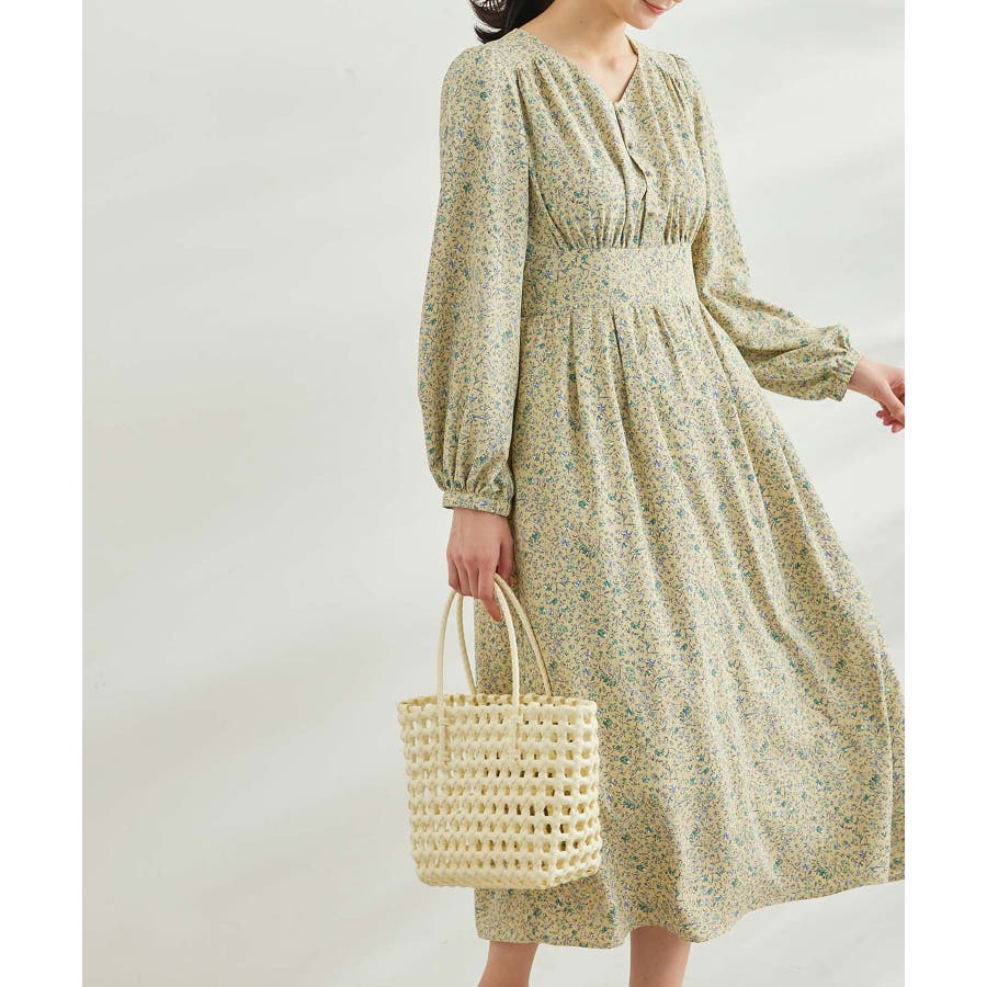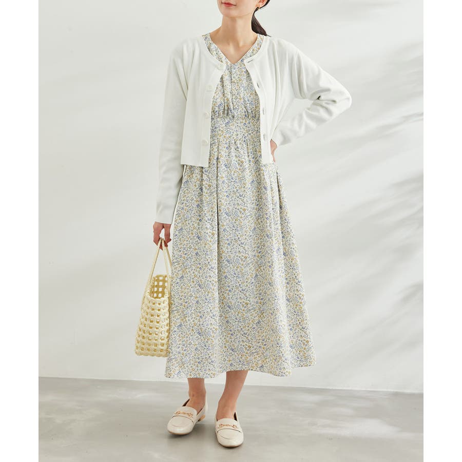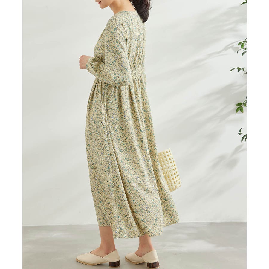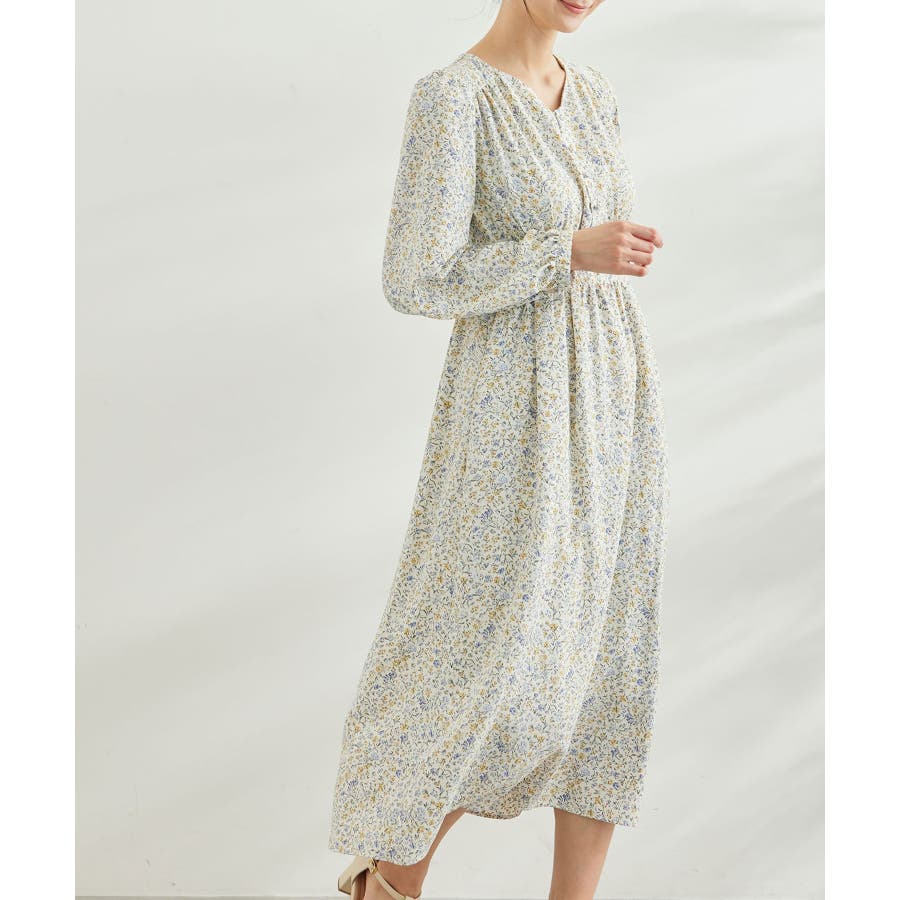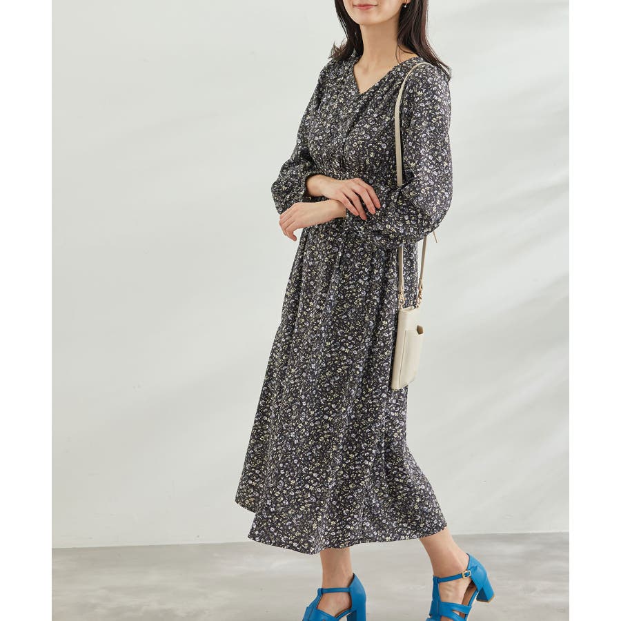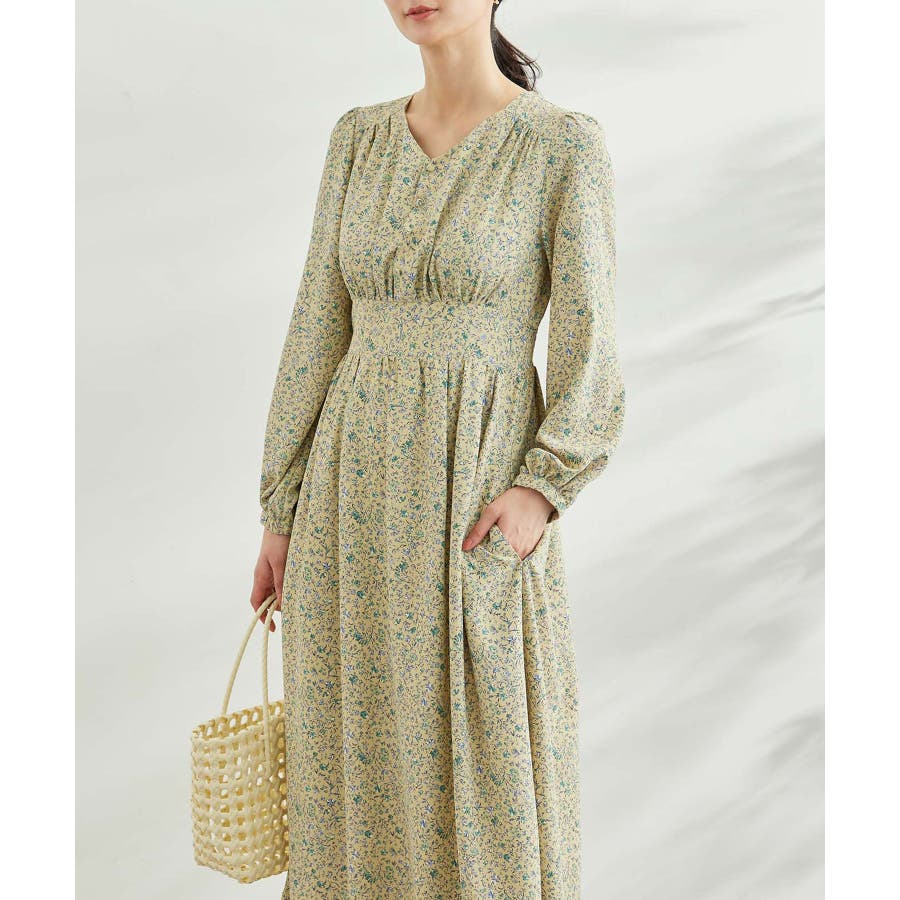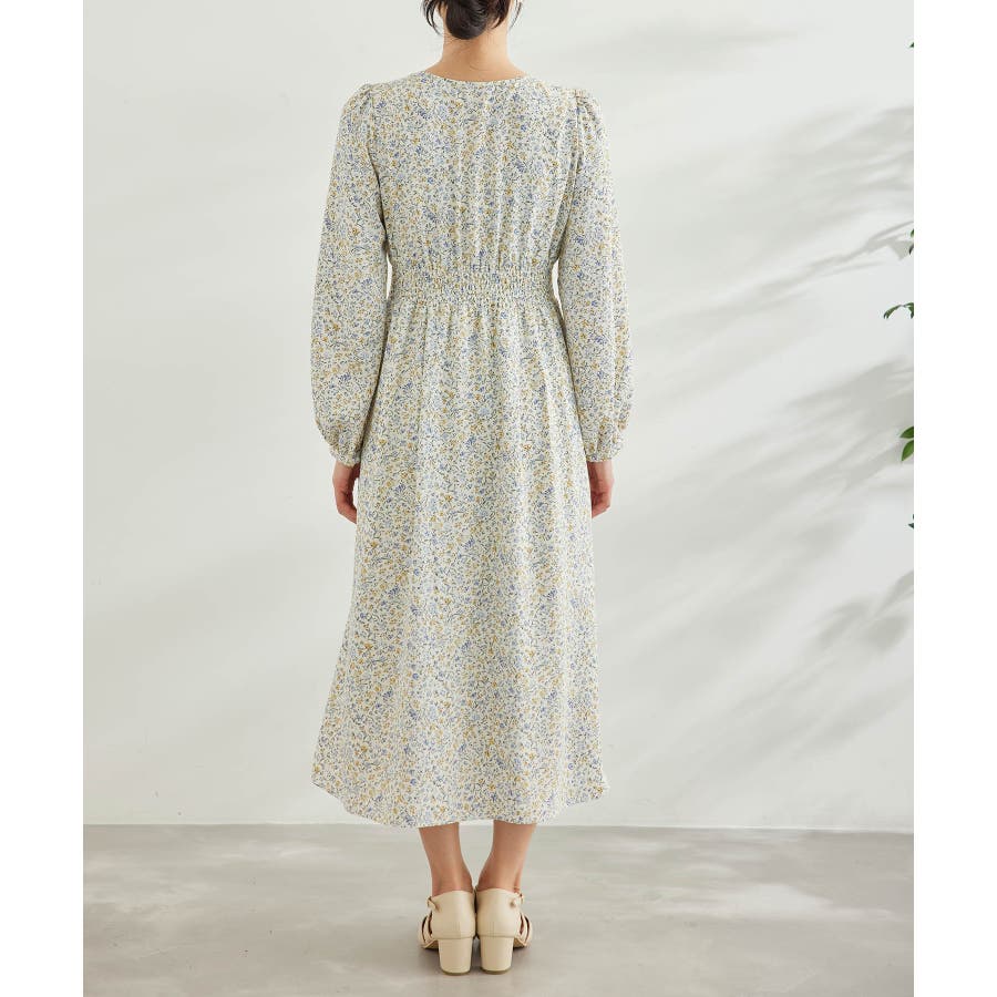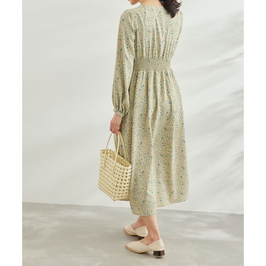 【素材感】 ・表面感のあるドビー素材を使用。 【デザイン・シルエット】 ・ハイウエストで切り替えを入れた、メリハリシルエットの長袖ワンピース。 ・取り入れやすいシックな小花プリント。 ・ウエストは後ろがギャザー使いでラクチン。 ・大人が着やすいロング丈。 【カラー】 ・オフホワイト、ベージュ、ネイビーのベーシックカラー3色展開。 ・ベージュ(27)は黄色に近い色味。 ・ネイビー(40)は濃いグレーのような色味。 【スタイリングポイント】 ・肌寒い時期には、厚手のカーディガンやブーツを合わせて。 ・春はレザージャケットやデニムジャケットを合わせると◎。 ----------------------------- 裏地:あり 透け感:なし、オフホワイト(15)は裏地が付いていないところはややあり 伸縮性:なし 生地感・厚さ:普通 ポケット:あり ウエスト:後ろゴム その他仕様:ボタンはフェイク。袖口一部ゴム 季節:春・秋 ----------------------------- ※撮影時の光、お使いのモニター環境によって色の見え方が違う場合がございます。 ※モデル身長:161cm 着用サイズ:38