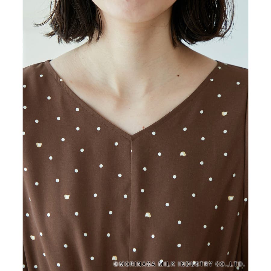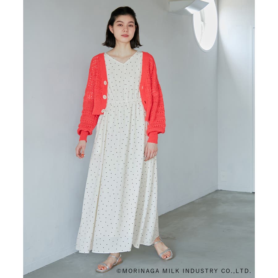 【素材感】 ・軽やかで清涼感のある素材。 ・上身頃は裏地をつけておりますが、肌離れの良い素材をチョイス。 【デザイン・シルエット】 ・森永乳業の人気アイス【Pino/ピノ】とROPE' PICNICの楽しいコラボレーションが誕生。 ・ピノをドット柄の中にランダムに散りばめたオリジナルプリント。 ・フロントはすっきりとしたVネック、バックには1cmサイズのミニPino型をオリジナル釦として落とし込み遊び心をプラス。 ・ウエストギャザーでラクチンの着心地。 【カラー】 ・ホワイト、ダークブラウン、レッドのPinoを思わせる3色を展開。 【スタイリングポイント】 ・デコルテがすっきり映えるので、繊細なペンダントを合わせると素敵。 ・肌寒い時期は、インに薄手のタートルネックカットソーを重ねるテクも一押し。 ・同シリーズでKIDS(品番:GRE24080)も展開しているので、親子お揃いもおすすめ。 ----------------------------- 裏地:あり 透け感:ホワイト系(11)は光に当てるとややあり 伸縮性:なし 生地感・厚さ:普通 ウエスト:ゴム ポケット:あり ファスナー:なし ボタン:後ろボタンあり、開閉可能 季節:春・夏 ----------------------------- ※撮影時の光、お使いのモニター環境によって色の見え方が違う場合がございます。 ※KIDSは一部店舗限定となります。 ※モデル身長:166cm 着用サイズ:38