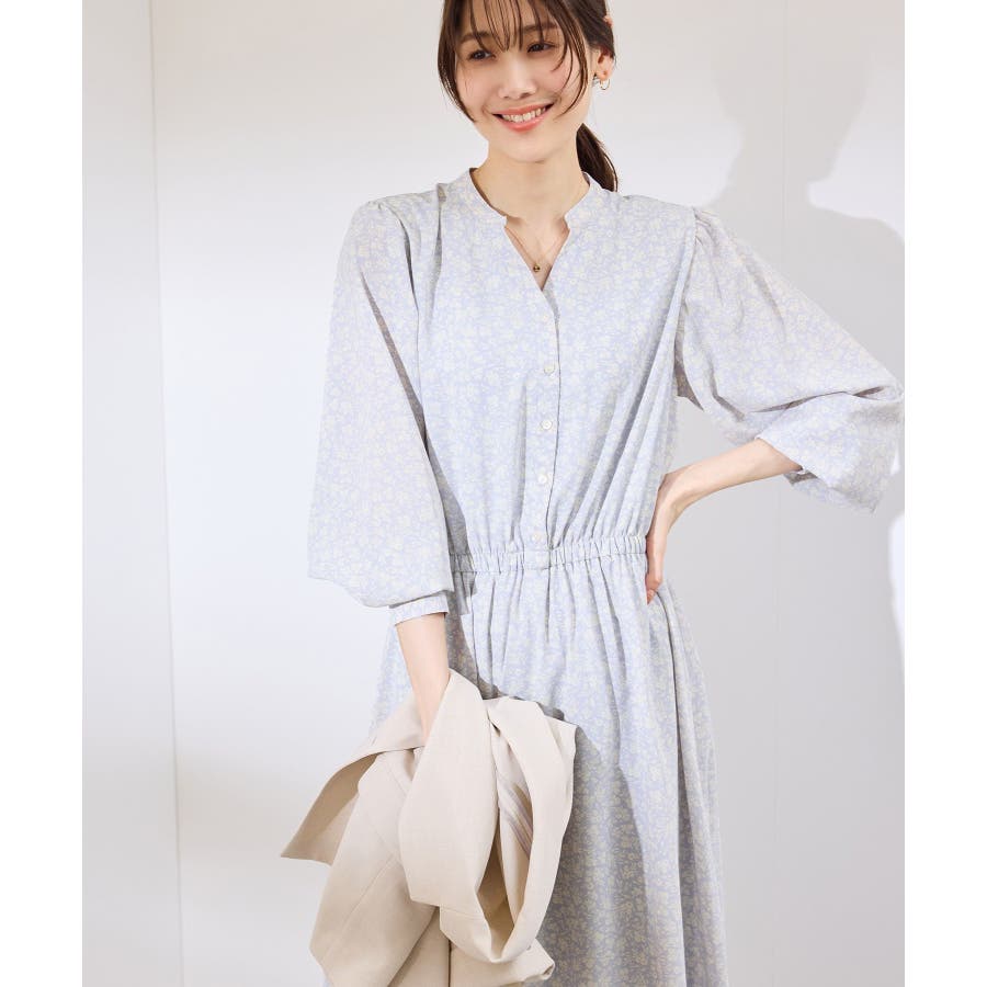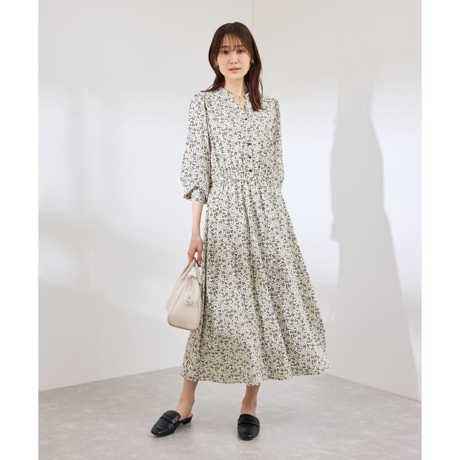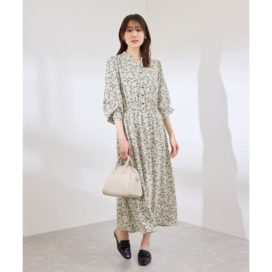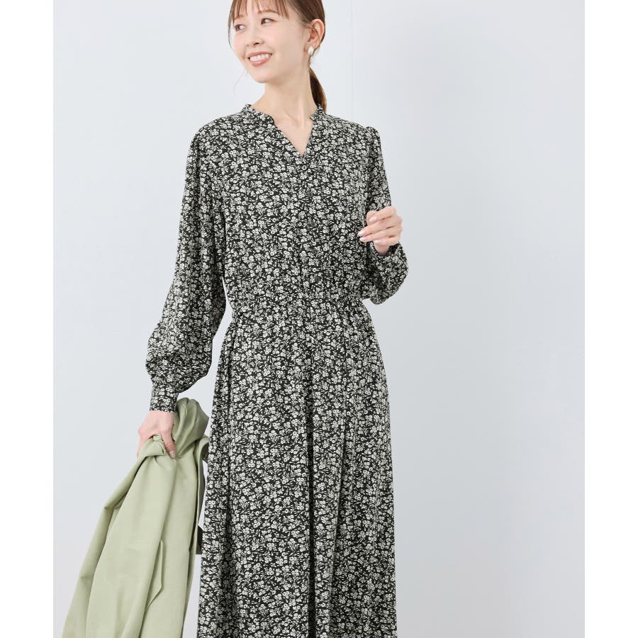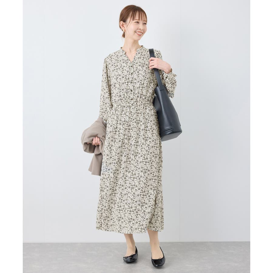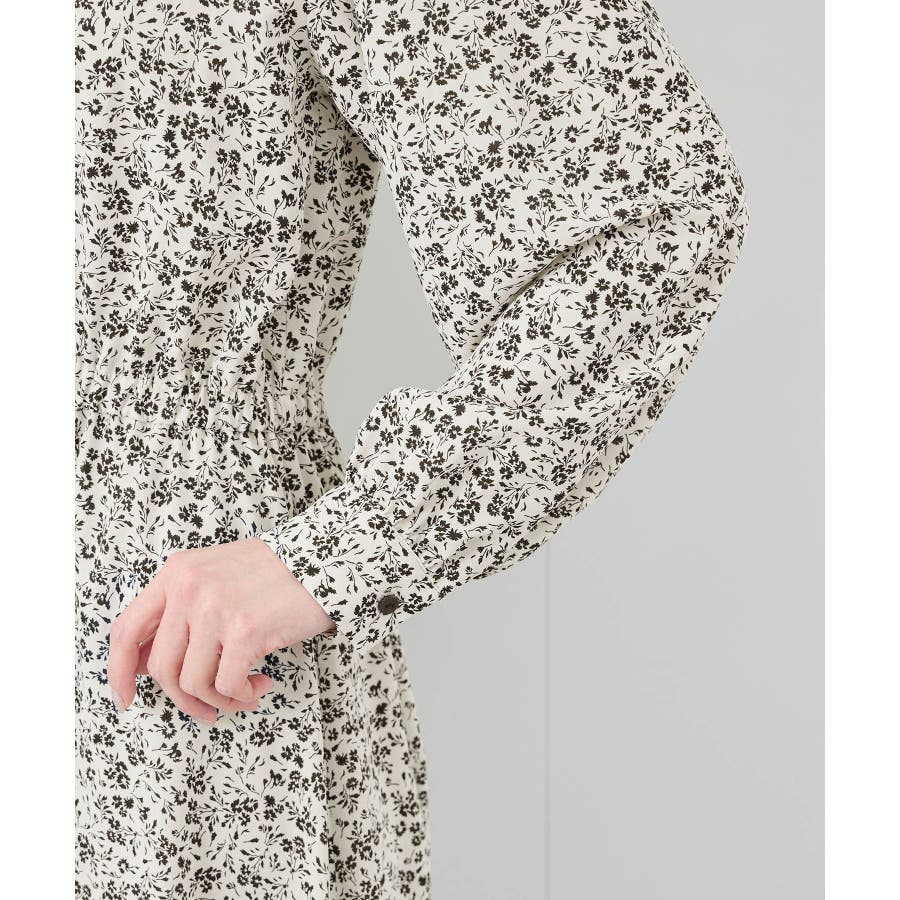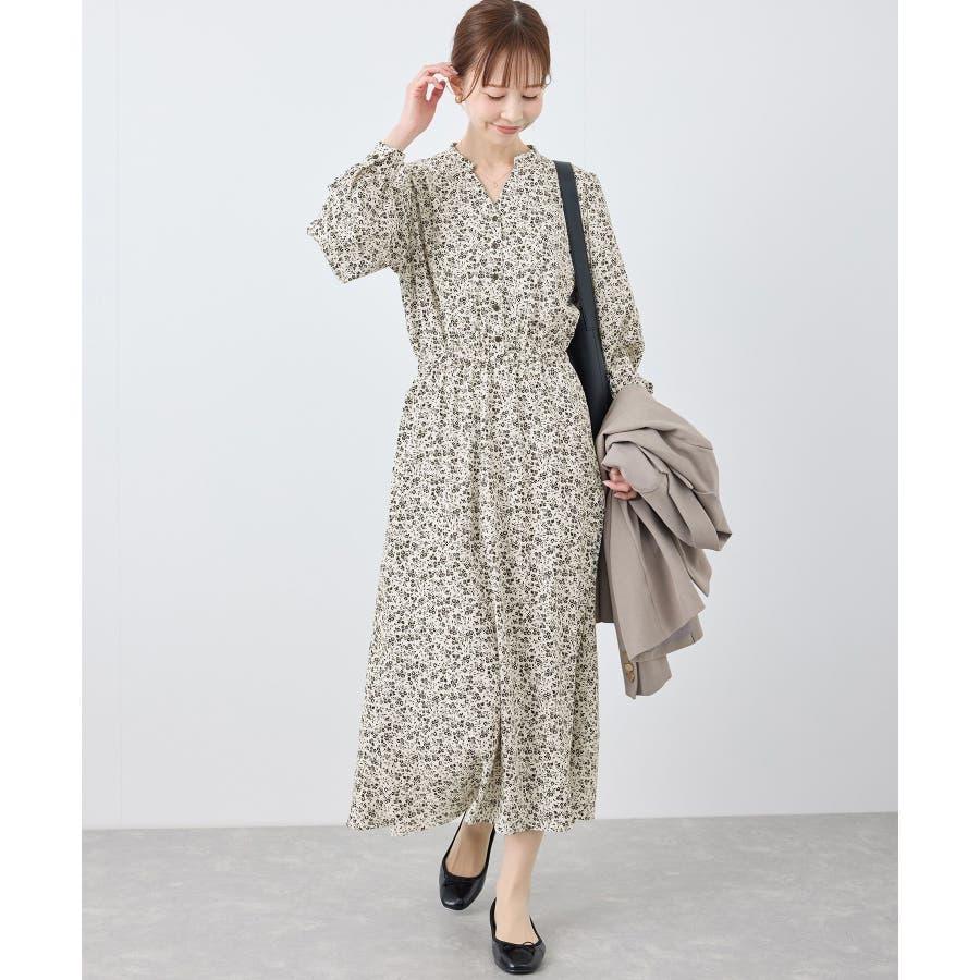 【デザイン・シルエット】 ・一枚で様になる小花プリントワンピース。 ・リラックスフォルムで着やすく、ウエストギャザーでシルエットもすっきり。 ・ボリュームスリーブが女性らしさをアップ。 ・スキッパーネックで首もとに抜け感をプラス。 【カラー】 ・ブラック、オフホワイト、ベージュ、サックスブルーの4色展開。 【スタイリングポイント】 ・春を先取りするならベージュやサックスブルーがおすすめ。 ・軽い素材なので、寒い時期は厚手のニットカーディガンやパデッドジャケットを羽織って工夫を。 ・足もとはブーツからパンプスやフラットシューズ、スニーカーに変えるだけで季節感をチェンジ。 ・寒い日は中に薄手のタートルシャツを重ねても◎。 ----------------------------- 裏地:あり 透け感:裏地がない部分はややあり 伸縮性:なし 生地感・厚さ:やや薄手 ウエスト:ゴム ポケット:なし ボタン:全て開閉可能 季節:春・秋・冬(カーディガンやジャケットを羽織れば◎) ----------------------------- ※撮影時の光、お使いのモニター環境によって色の見え方が違う場合がございます。 ※モデル身長:165cm 着用サイズ:38