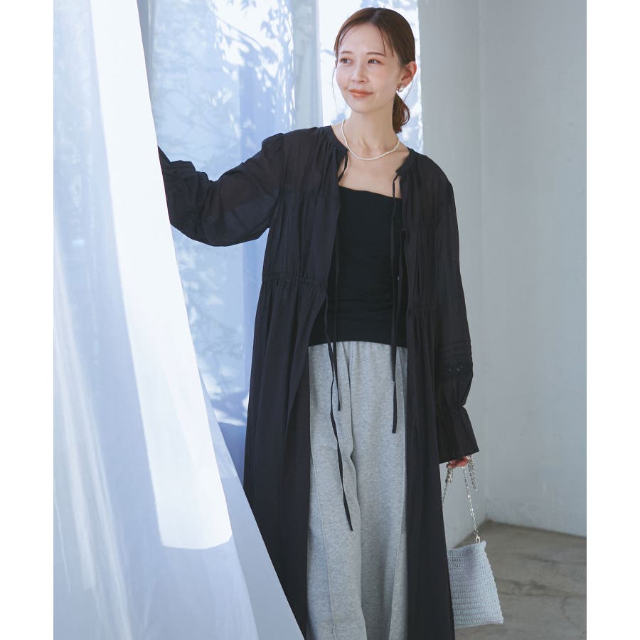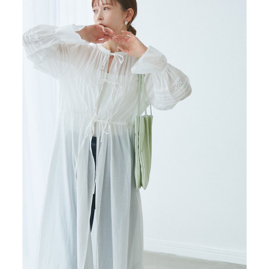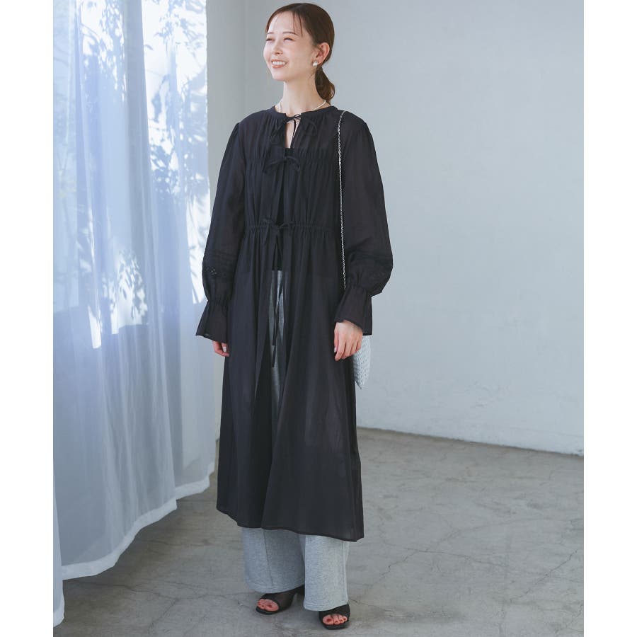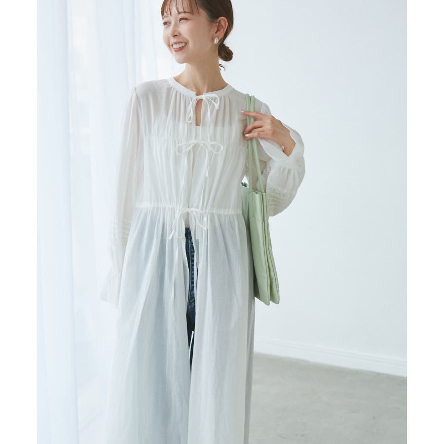 ・羽織りとしてデニムやTシャツと合わせたカジュアルスタイルから、ワンピースとしてリボンを結びフェミニンに着こなすことも可能。