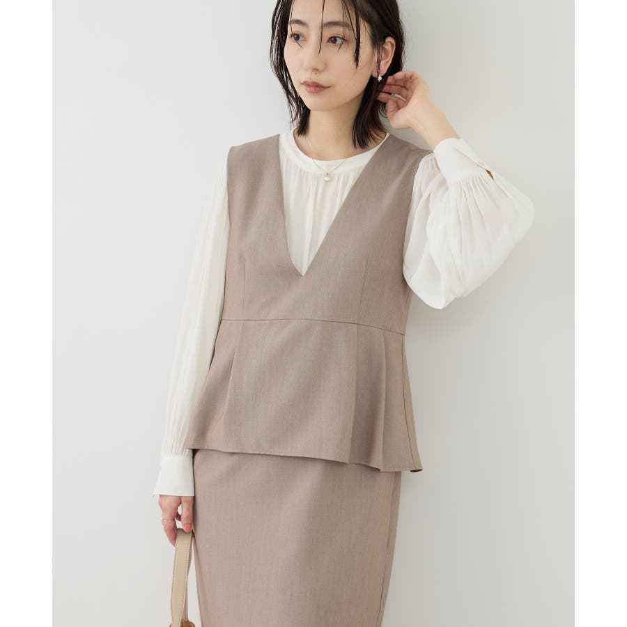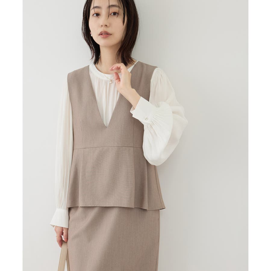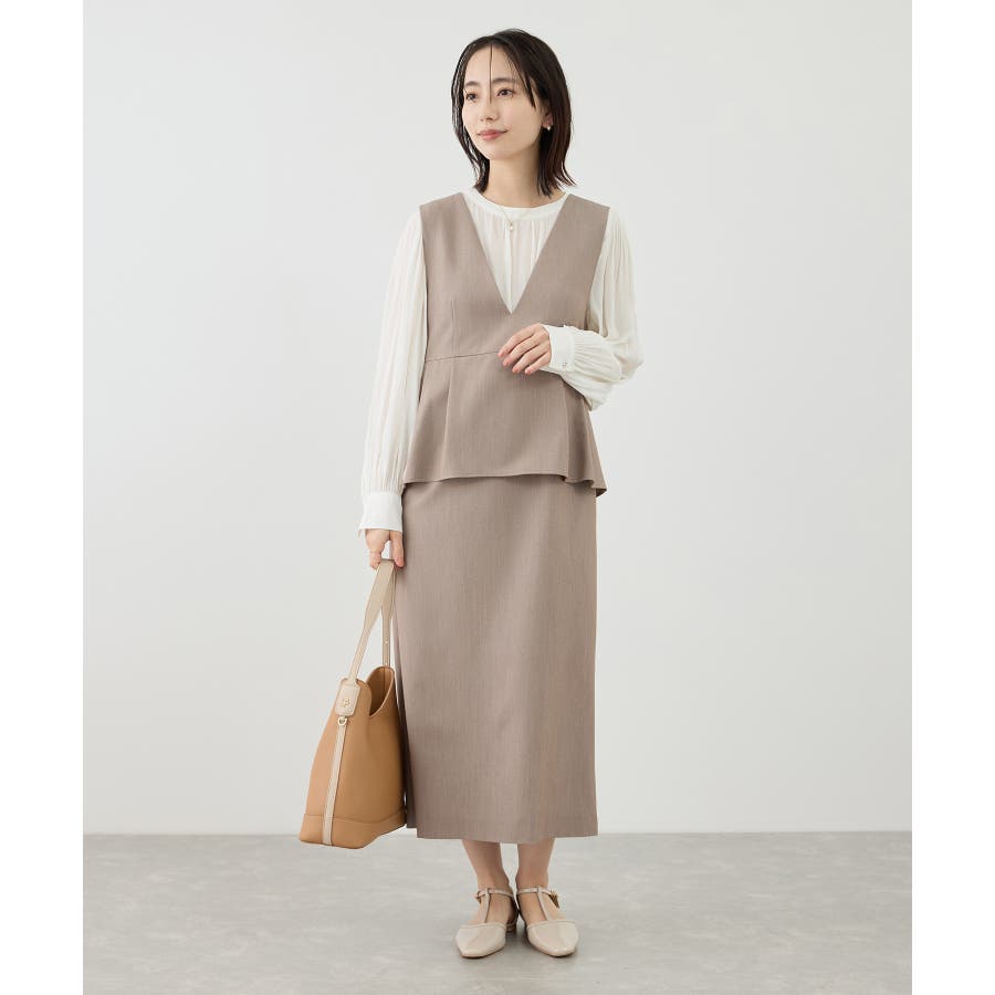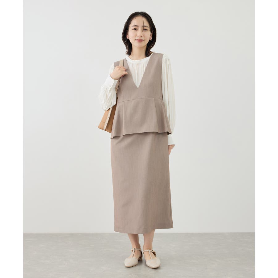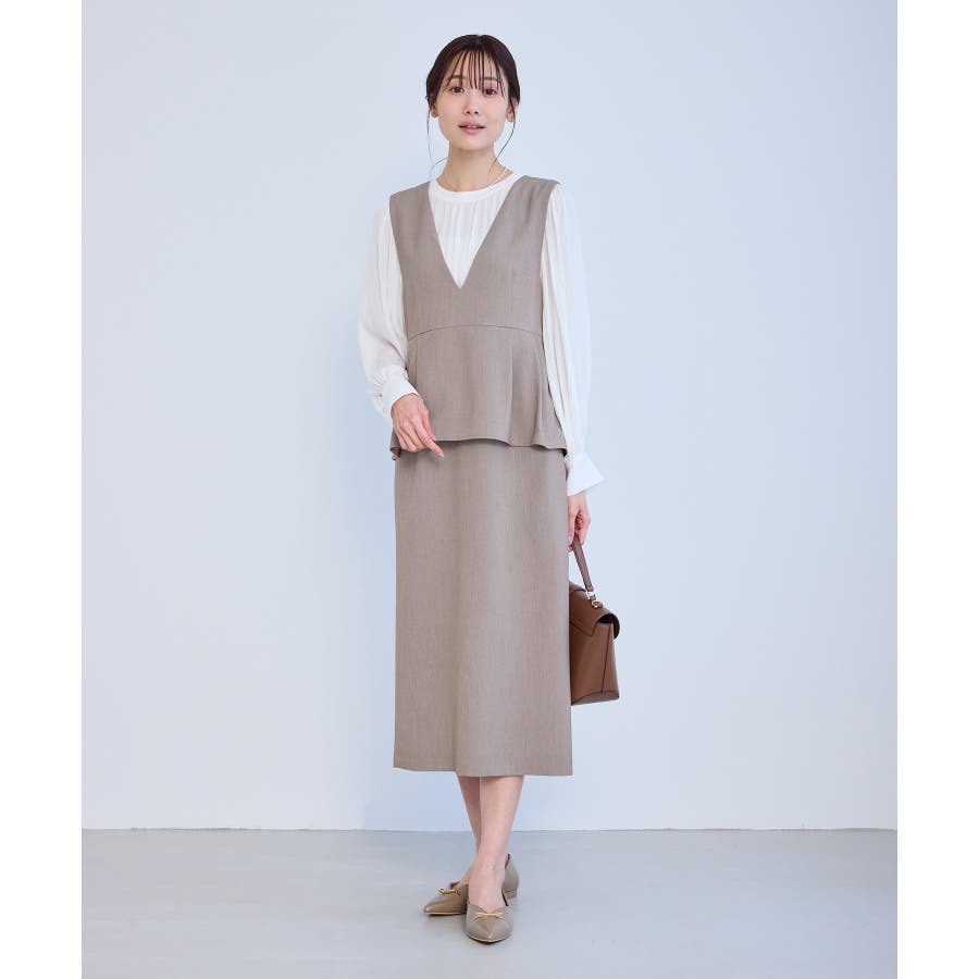 ・ボリュームスリーブブラウス(品番:GDH16100)とのコーディネートがおすすめ。ブラウスの衿ぐりは本ジャンパースカートに合わせてデザインされており、セットで着用することでジャンパースカートのすっきりとしたシルエットがより引き立つ。
