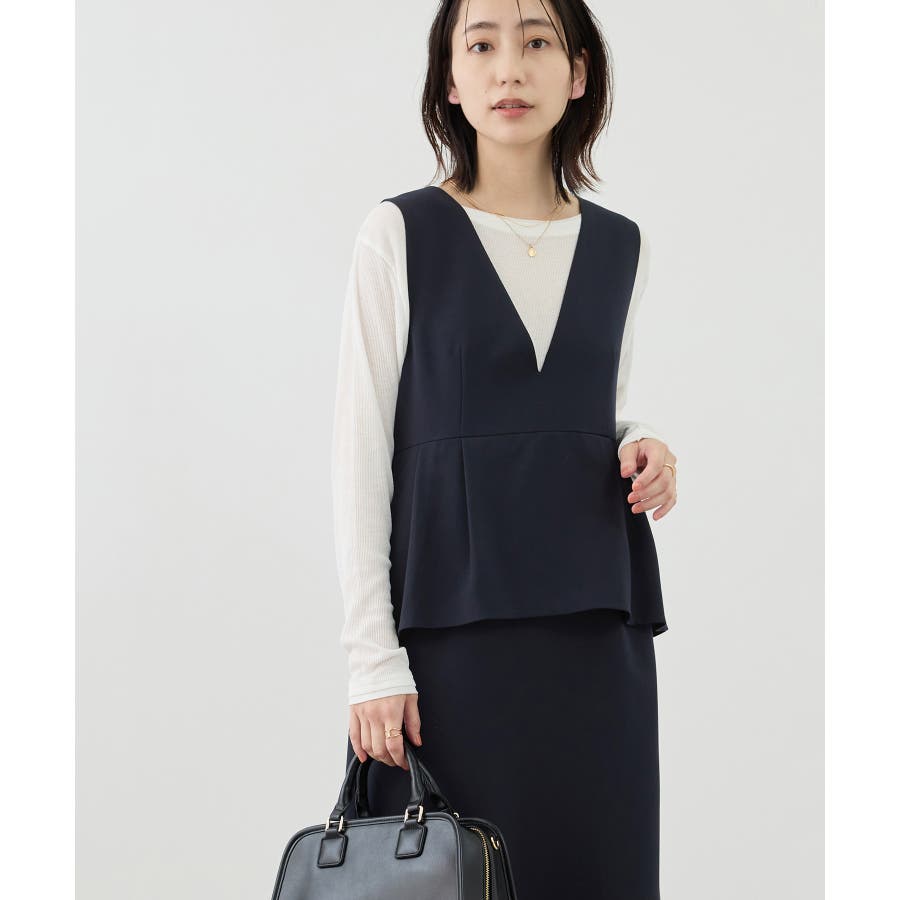 ・深めのVネックが顔まわりを女性らしく見せ、アクセサリーも映えるバランスに仕上げています。