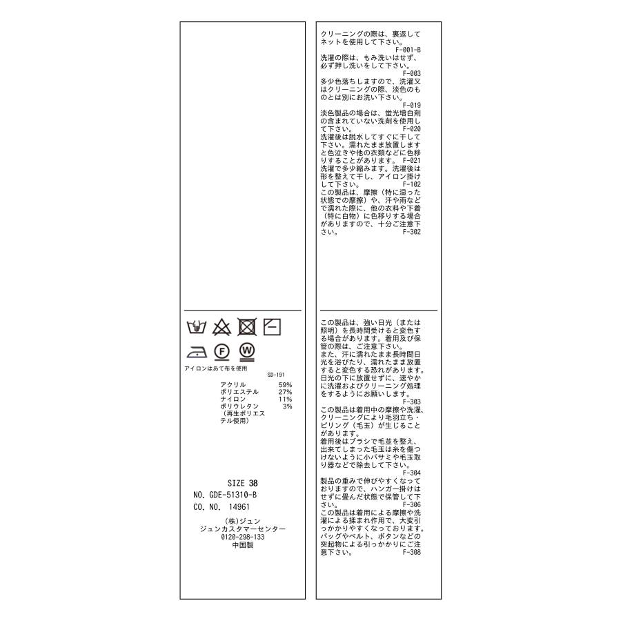 | 素材 | ブラック(01):アクリル 59% ポリエステル 27% ナイロン 11% ポリウレタン 3% (再生ポリエステル使用)|キナリ(16):アクリル 59% ポリエステル 27% ナイロン 11% ポリウレタン 3% (再生ポリエステル使用)|ブラウン(22):アクリル 59% ポリエステル 27% ナイロン 11% ポリウレタン 3% (再生ポリエステル使用) |