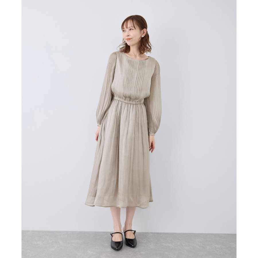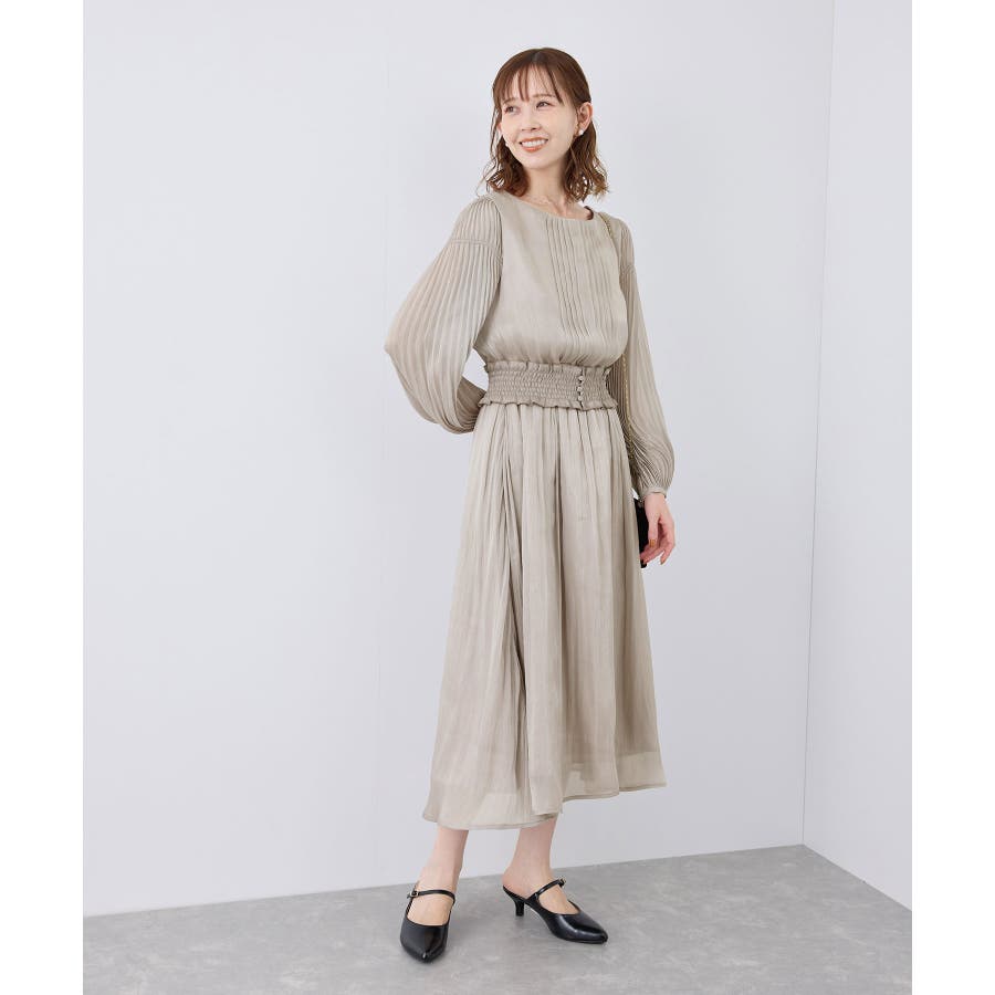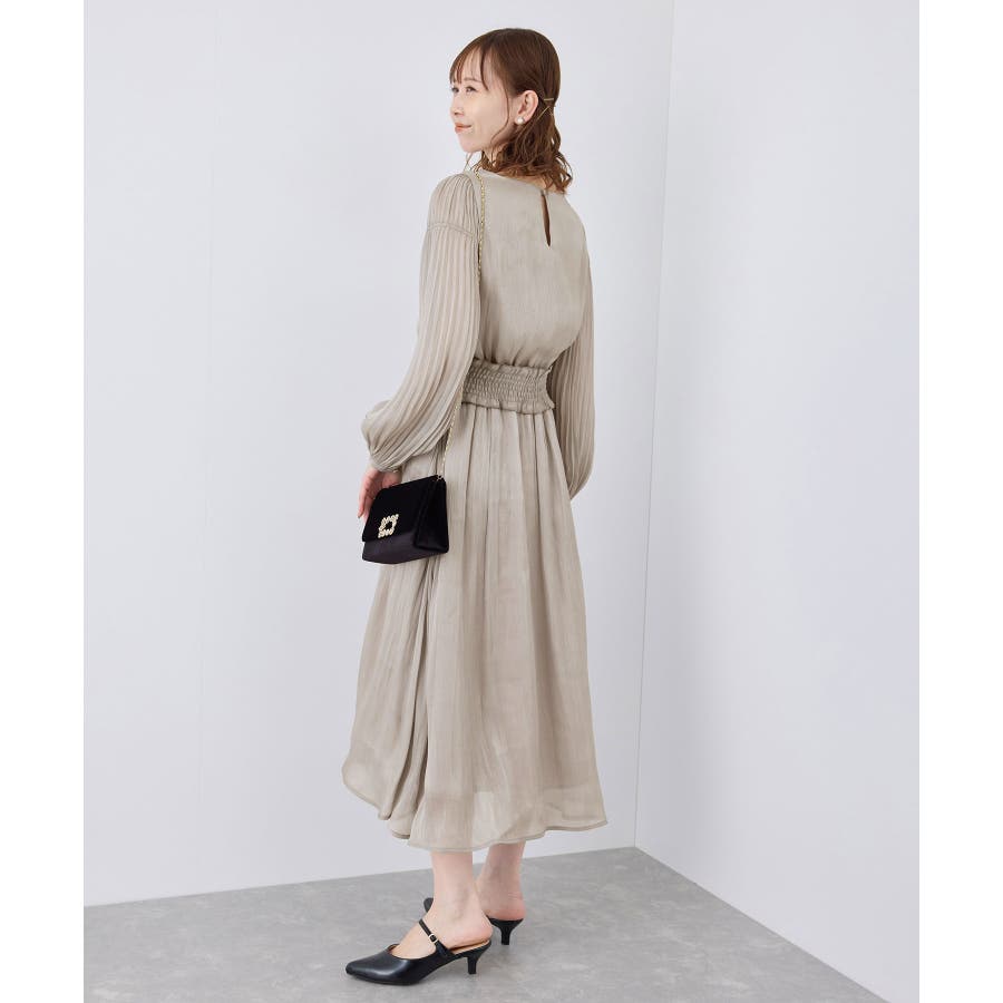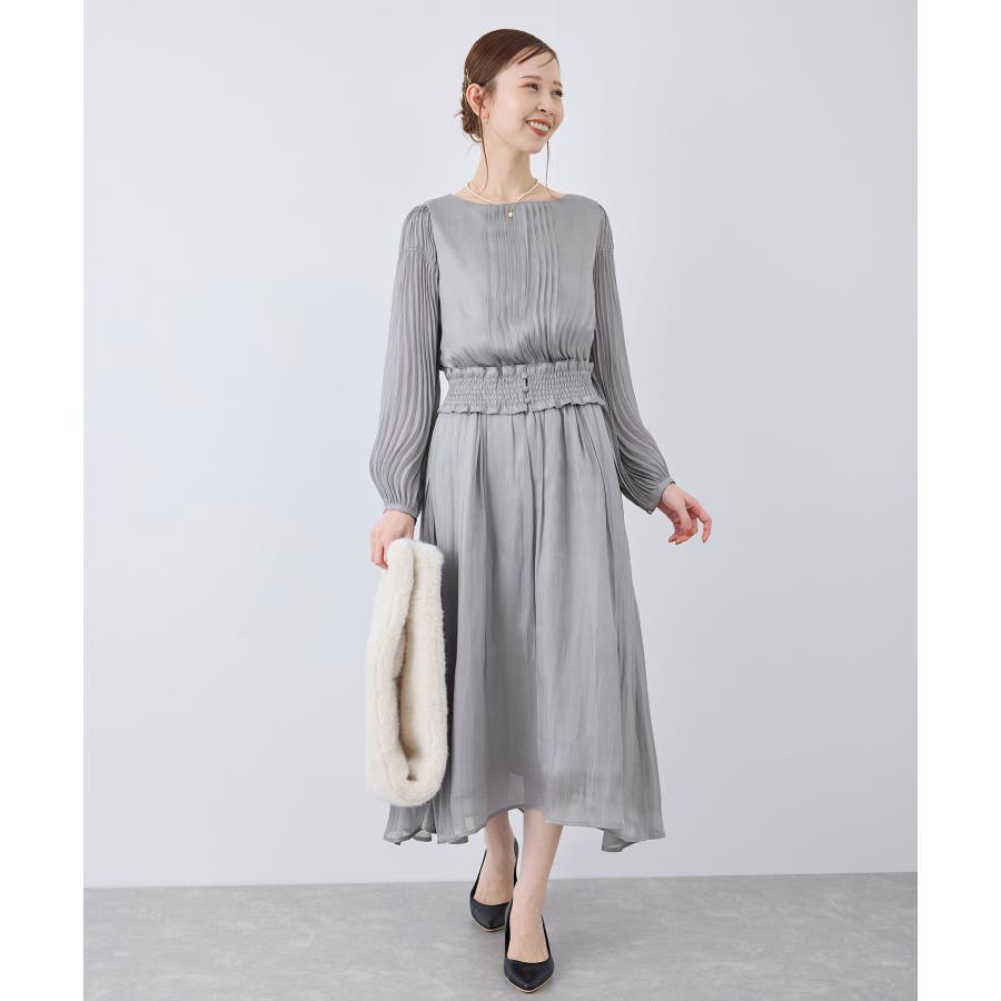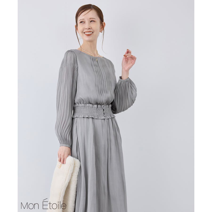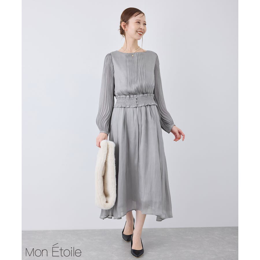 【素材感】 ・シャイニータッチの華やかな素材を使ったロングスリーブドレス。 【デザイン・シルエット】 ・タックやプリーツ使いで表情豊かにデザイン。 ・ボリュームスリーブ、バックネックのスリットが、女性らしさを引き立てるアクセント。 ・ウエストシャーリングでラクチンの着心地。 ・袖のみプリーツ加工を施し、腕を動かすたびにふわふわと揺れてエレガントな表情に。 ・イレギュラーヘムの裾で足元がきれいに見える、やや前上りデザイン。 【カラー】 ・モカ、ブルーのニュアンストーンを2色で展開。 【スタイリングポイント】 ・パールネックレスを合わせてパーティー仕様に。 ・ブーツなどを合わせて普段使いもOK。 ・ふんわりモヘアのカーディガンを羽織ると愛らしい冬スタイルが完成。 ----------------------------- 裏地:あり 透け感:裏地がない部分はややあり 伸縮性:なし 生地感・厚さ:普通 ポケット:なし ファスナー:なし ウエスト:シャーリング その他仕様:シャーリングベルト取り外し可能 季節:春・秋・冬 ----------------------------- ※撮影時の光、お使いのモニター環境によって色の見え方が違う場合がございます。 ※モデル身長:165cm 着用サイズ:38 : 【Mon E’toile】 一部店舗限定のドレスライン『Mon E’toile( モンエトワール)』 内面からも輝くスタイルを叶えるドレスで、結婚式やパーティーなどの「ハレ」の日や、いつもよりちょっと特別な日におすすめです。