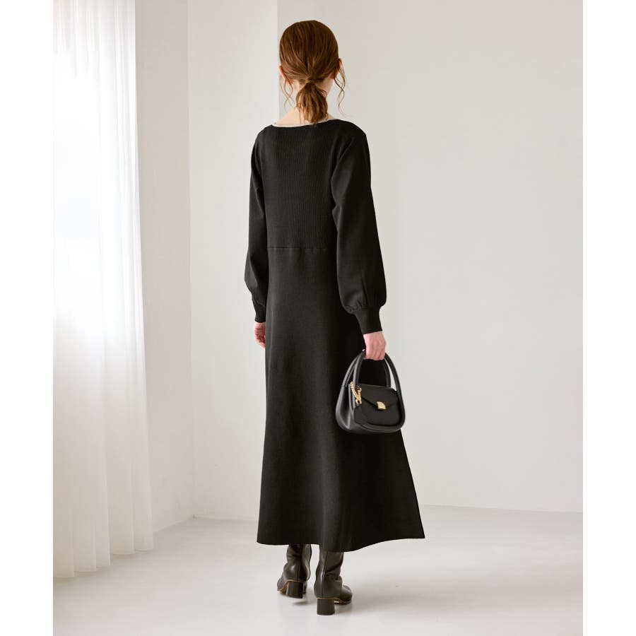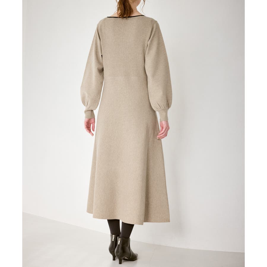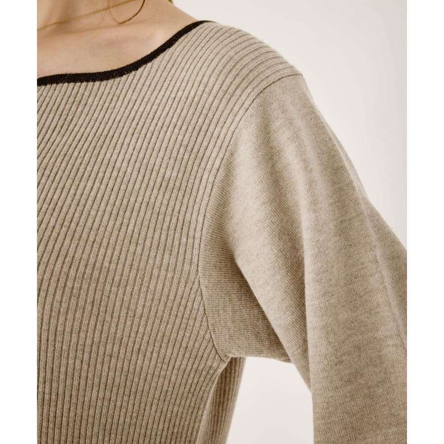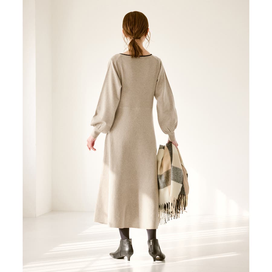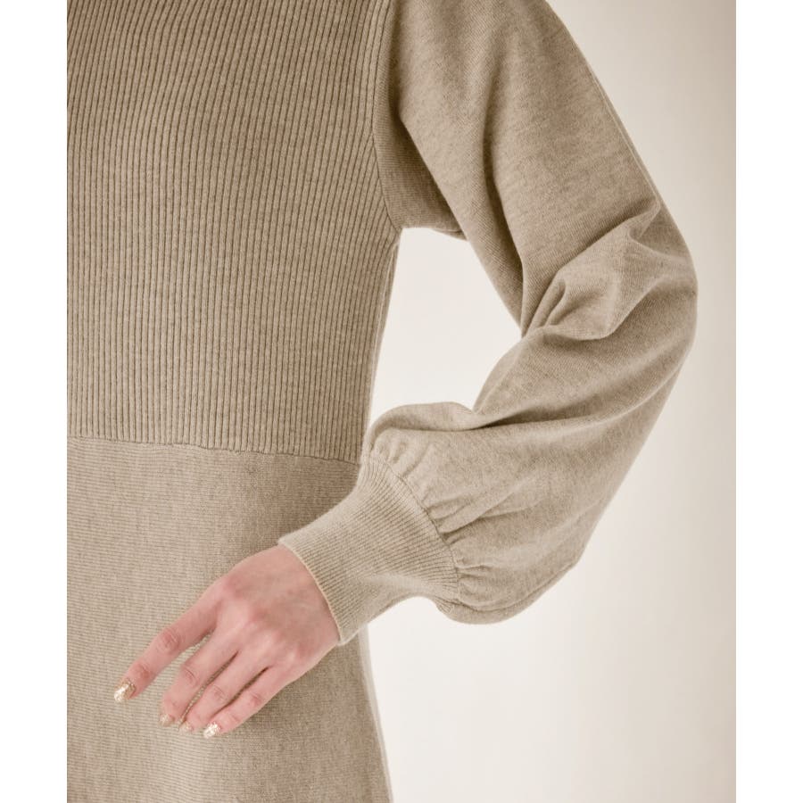 ・身頃はリブ編みで程よいフィット感、スカート部分は総針編みでフレアを出し、お袖は天竺編みでボリュームスリーブにと3種類の編み地とシルエットを楽しめるアイテム。