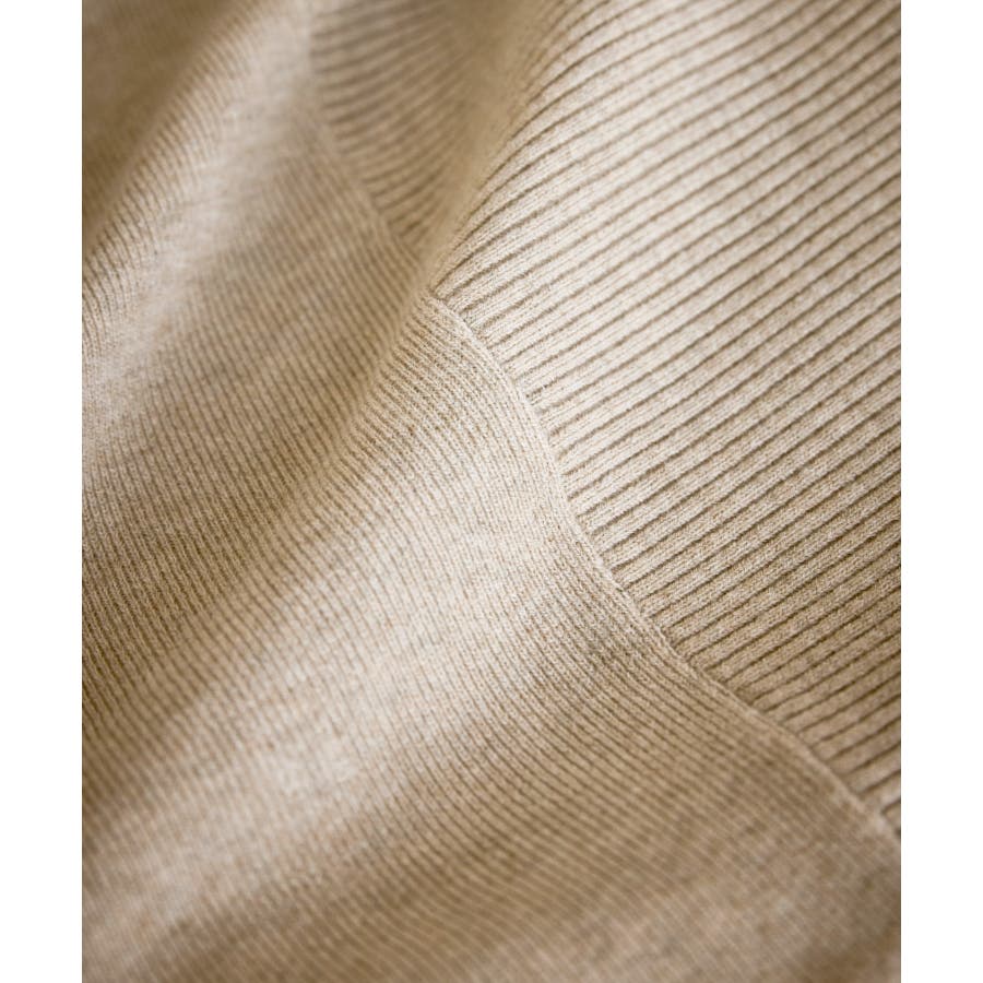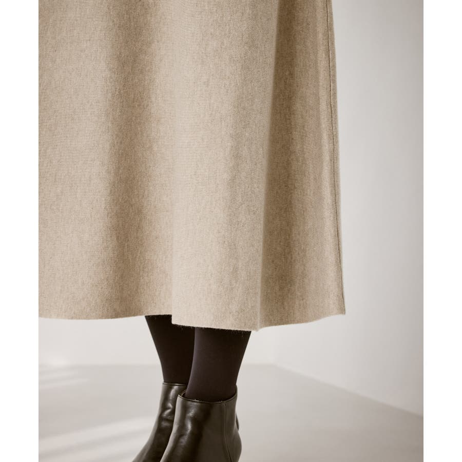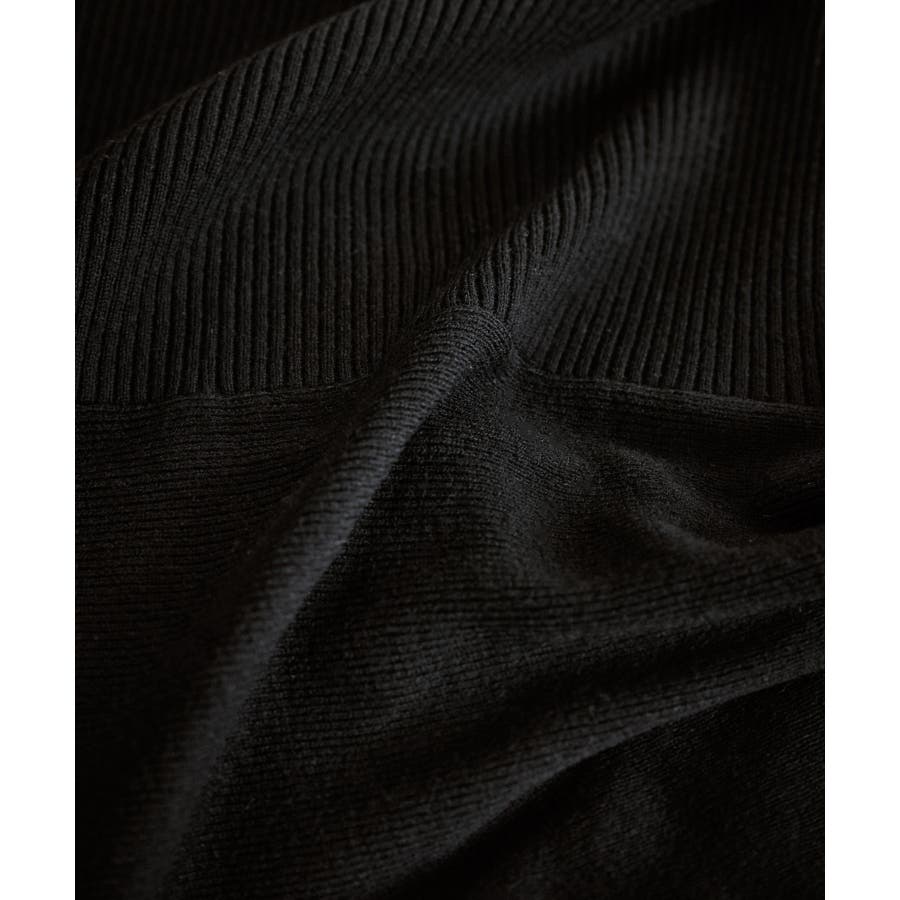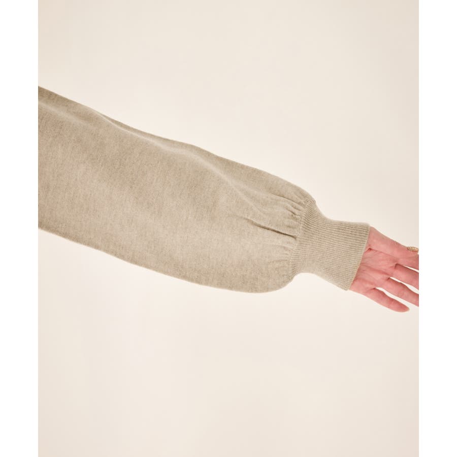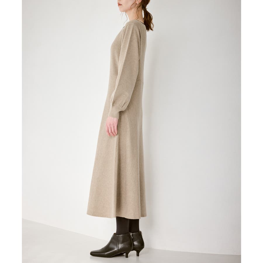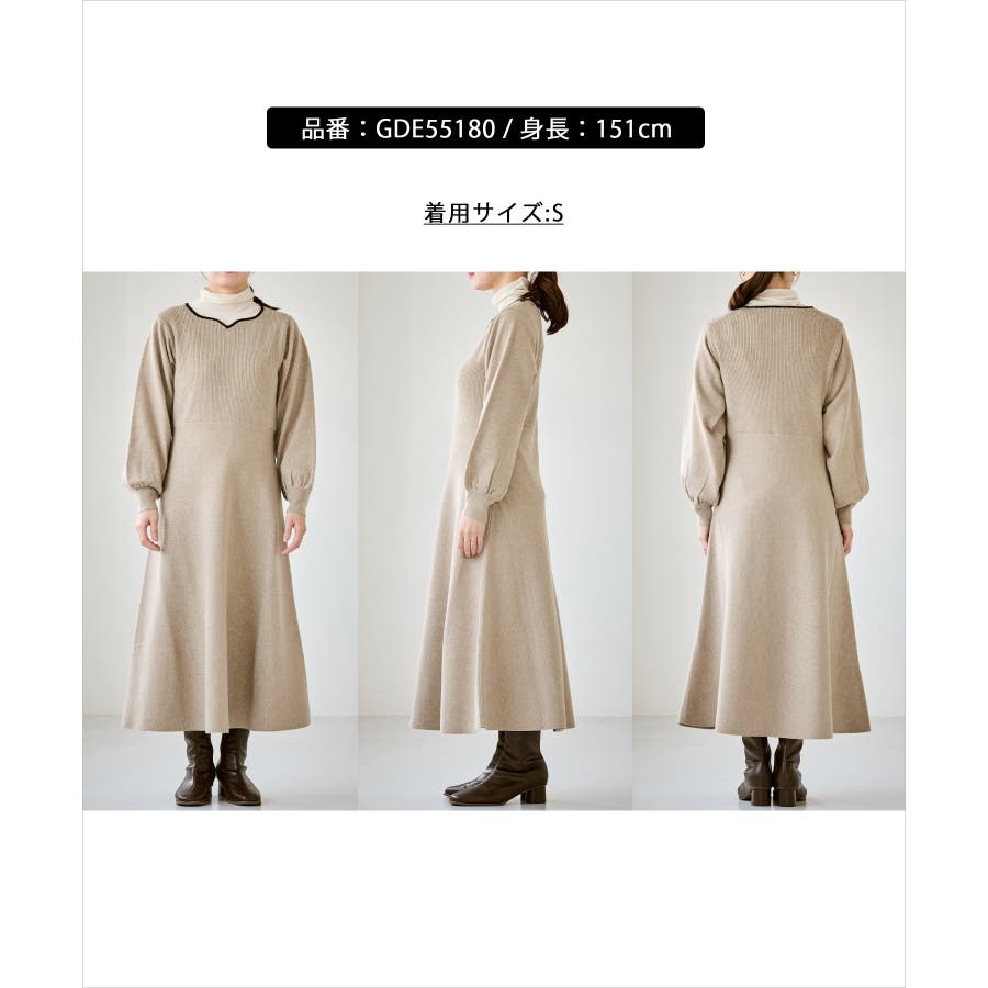 ・身頃はリブ編みで程よいフィット感、スカート部分は総針編みでフレアを出し、お袖は天竺編みでボリュームスリーブにと3種類の編み地とシルエットを楽しめるアイテム。
