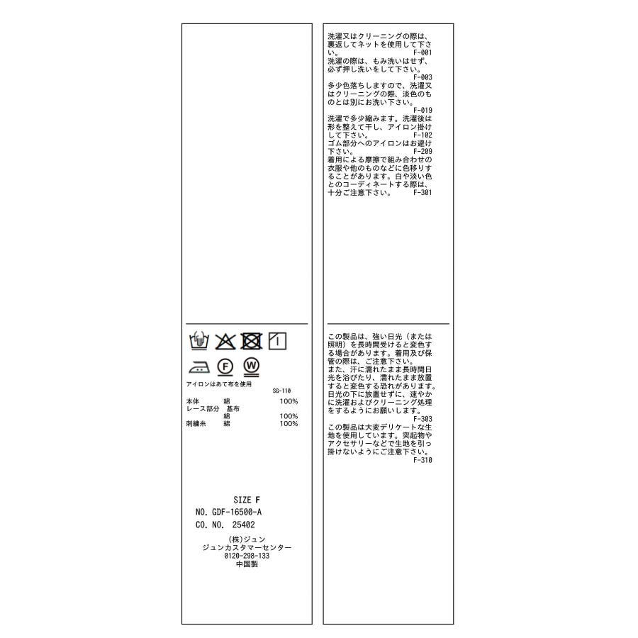 | 素材 | (本体) 綿 100% (レース部分 基布) 綿 100% (刺繍糸) 綿 100% |