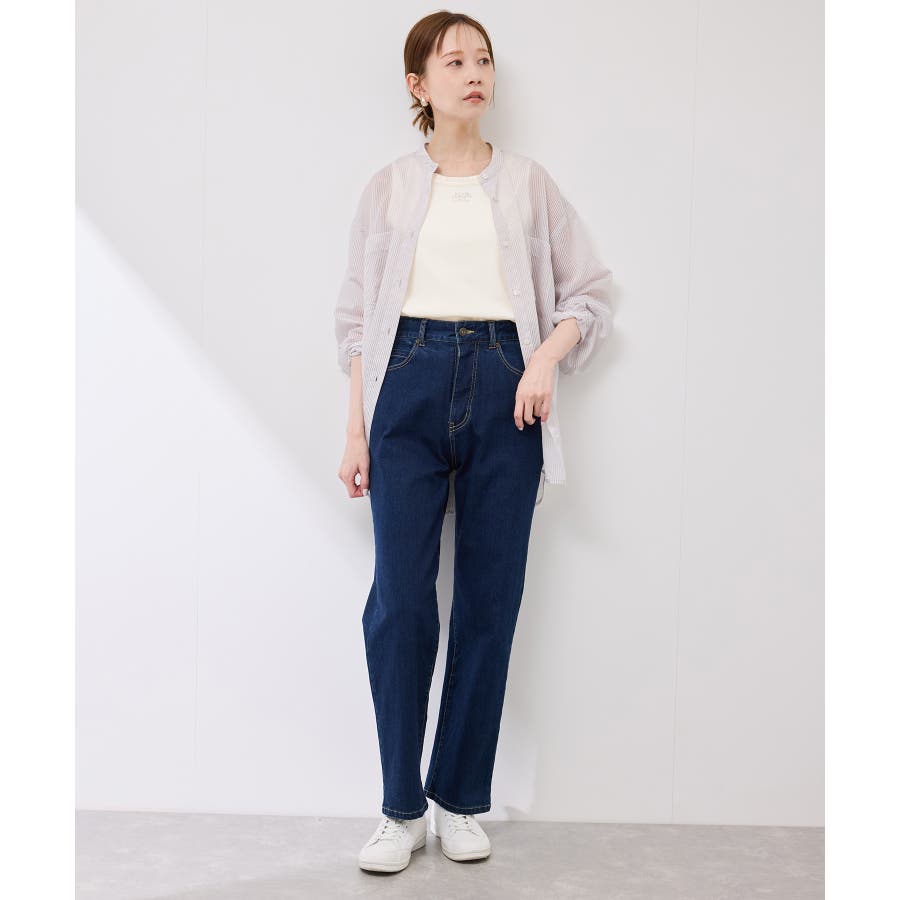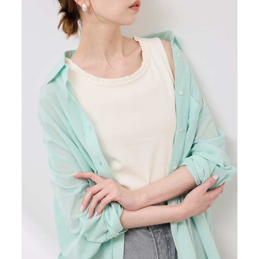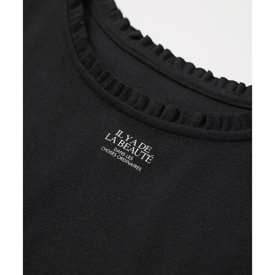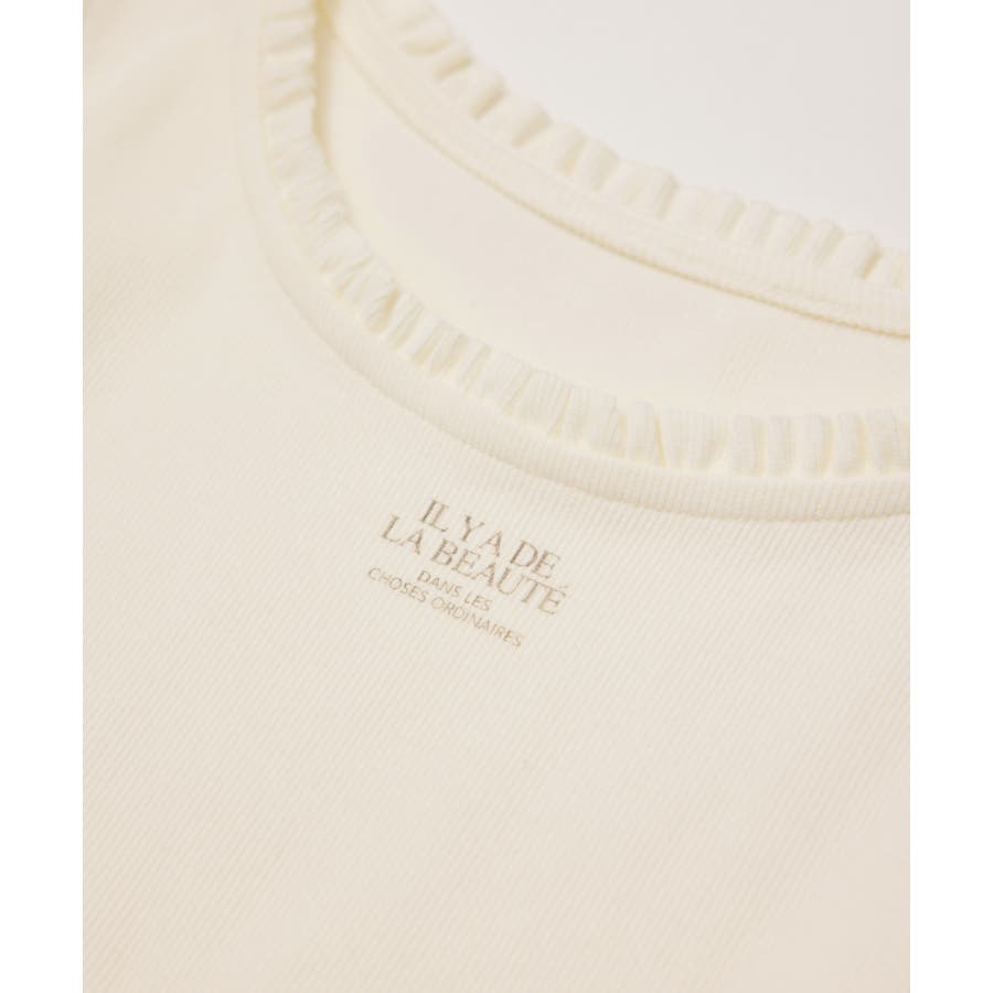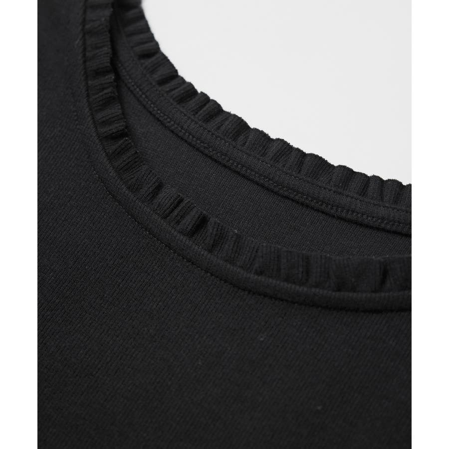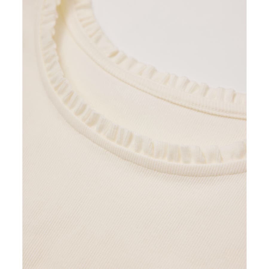 ・首元にはさりげないフリルディテールがあしらわれており、カジュアルながらもフェミニンさをプラス。