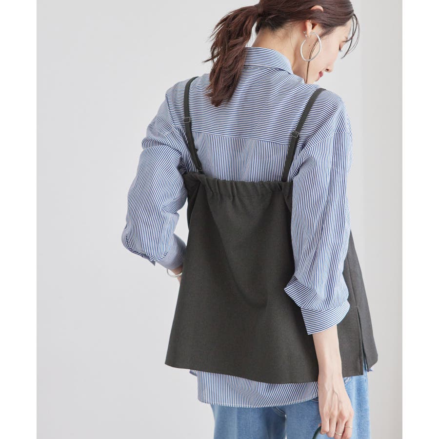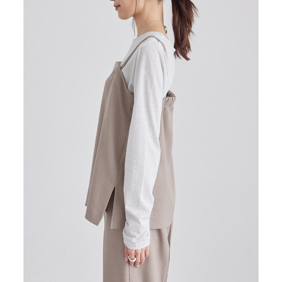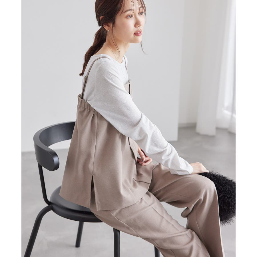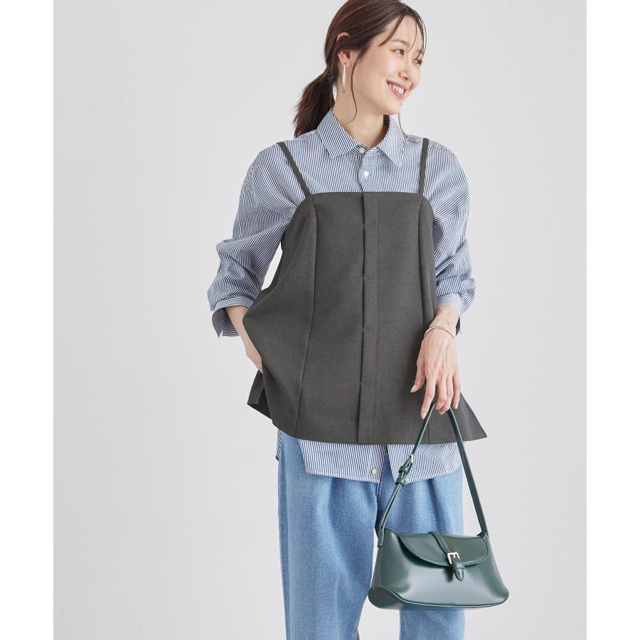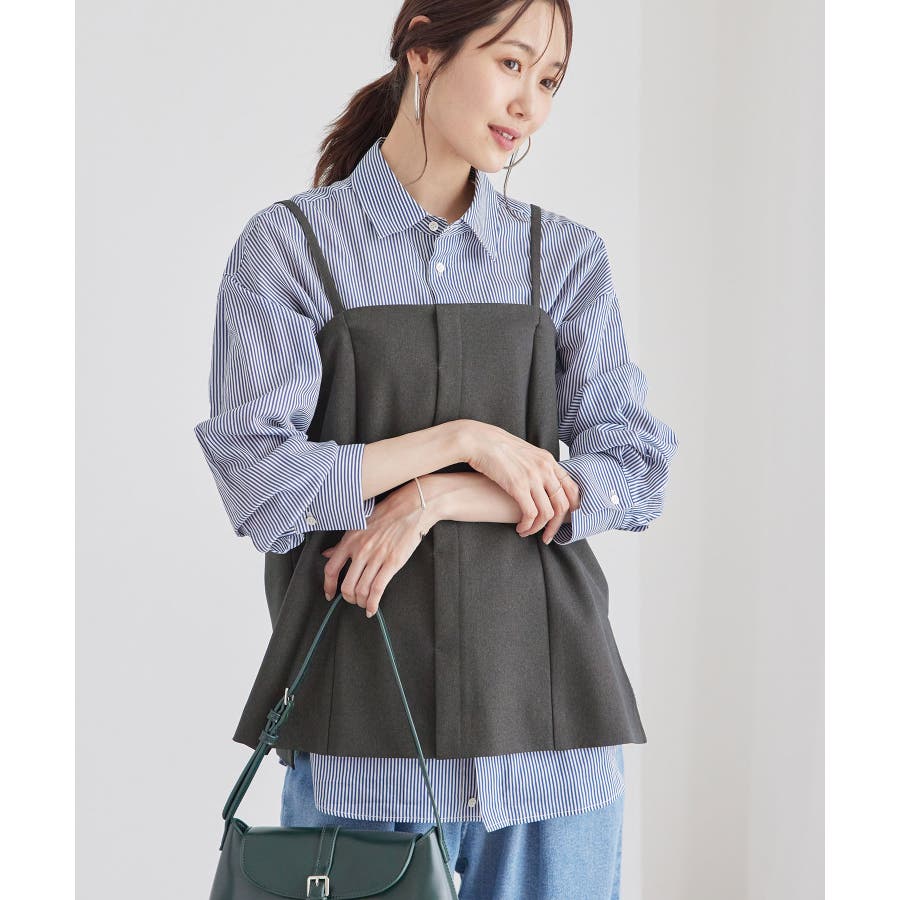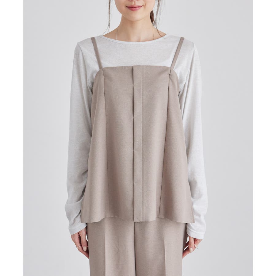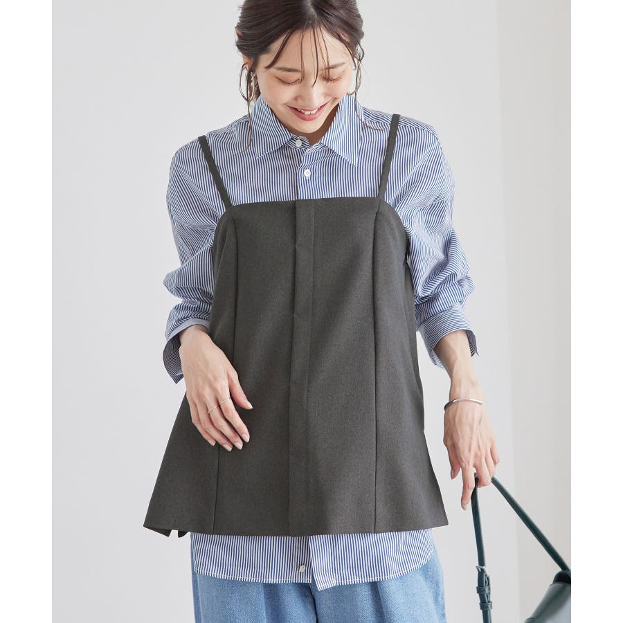 【素材感】 ・ウールライクな布帛で仕立てた、キャミソール型ビスチェ。 【デザイン・シルエット】 ・フロント開きの比翼仕立てで上品なデザイン。 ・バックスタイルのトップはシャーリングを施してフィット感をだし、ショルダーストラップを外しても着られるよう工夫。 ・裾にサイドスリット入り。 【カラー】 ・チャコールグレー、ベージュの落ち着いた2色展開。 【スタイリングポイント】 ・シンプルなTシャツからきちんと感のあるワイシャツなど、幅広いトップスの上にレイヤードができる。 ・一枚着で取り入れて、ジャケットやカーディガンを重ねてもOK。 ・ハンサムなパンツルックにマッチ。 ・同シリーズでパンツ(品番:GDS54040)、ジレ(品番:GDV54040)も展開しているので、セットアップもおすすめ。 ・同シリーズでKIDSのパンツ(品番:GRS64000)も展開しているので、親子お揃いも一押し。 ----------------------------- 裏地:なし 透け感:なし 伸縮性:なし 生地感・厚さ:やや厚手 ポケット:なし その他仕様:後ろゴム、肩紐調節・取り外し可能、フロントは開きません。 季節:秋・冬 ----------------------------- ※撮影時の光、お使いのモニター環境によって色の見え方が違う場合がございます。 ※モデル身長:165cm 着用サイズ:38