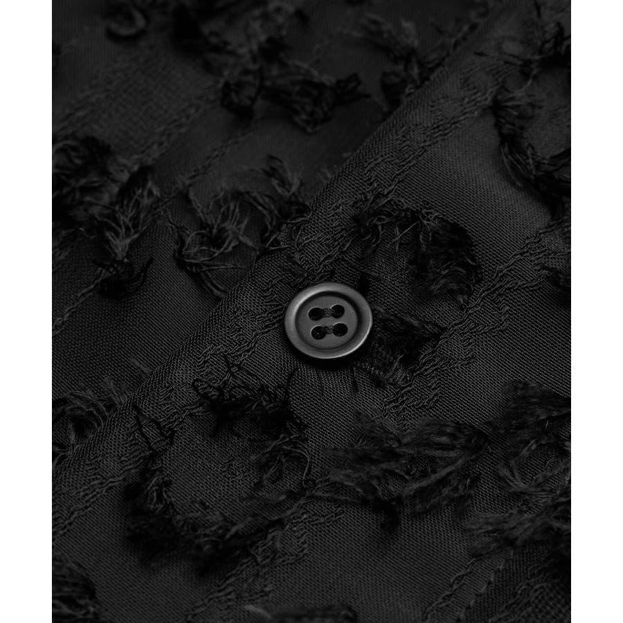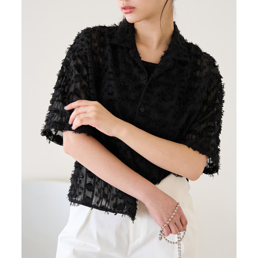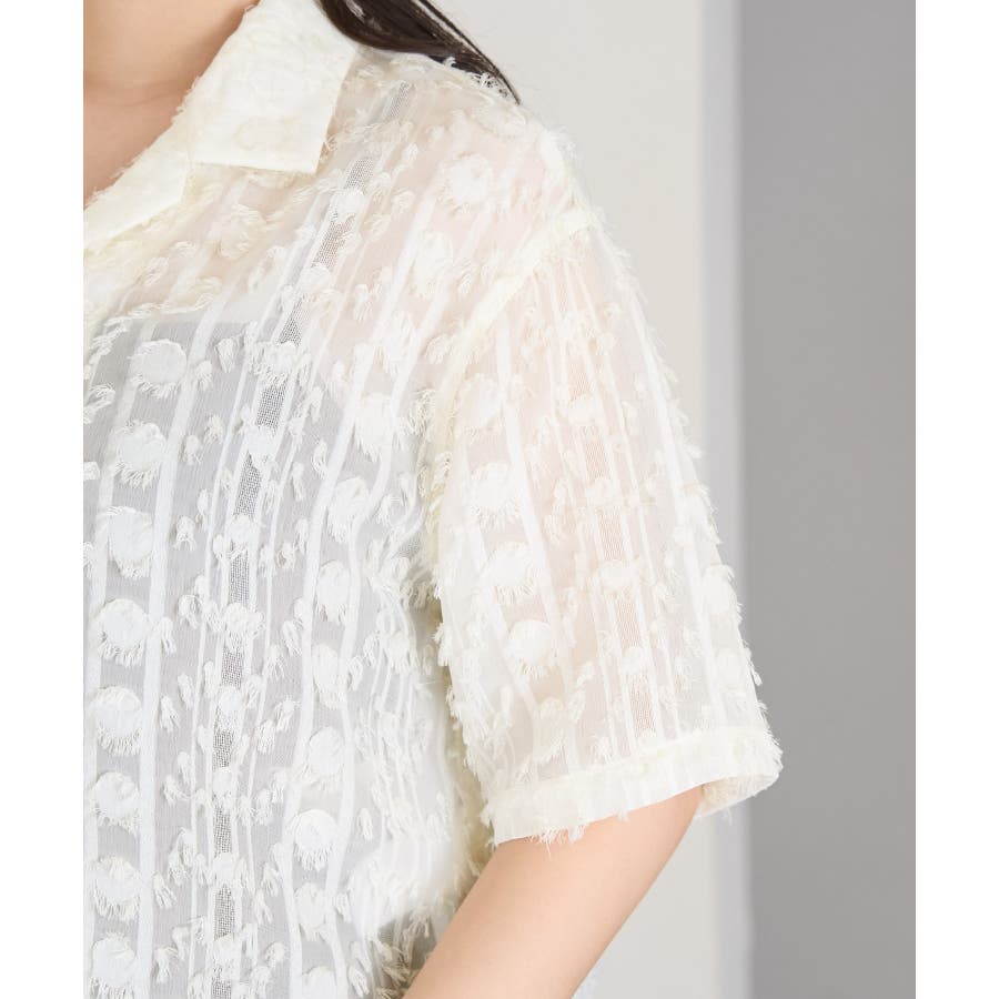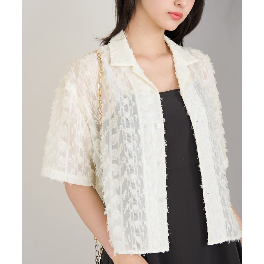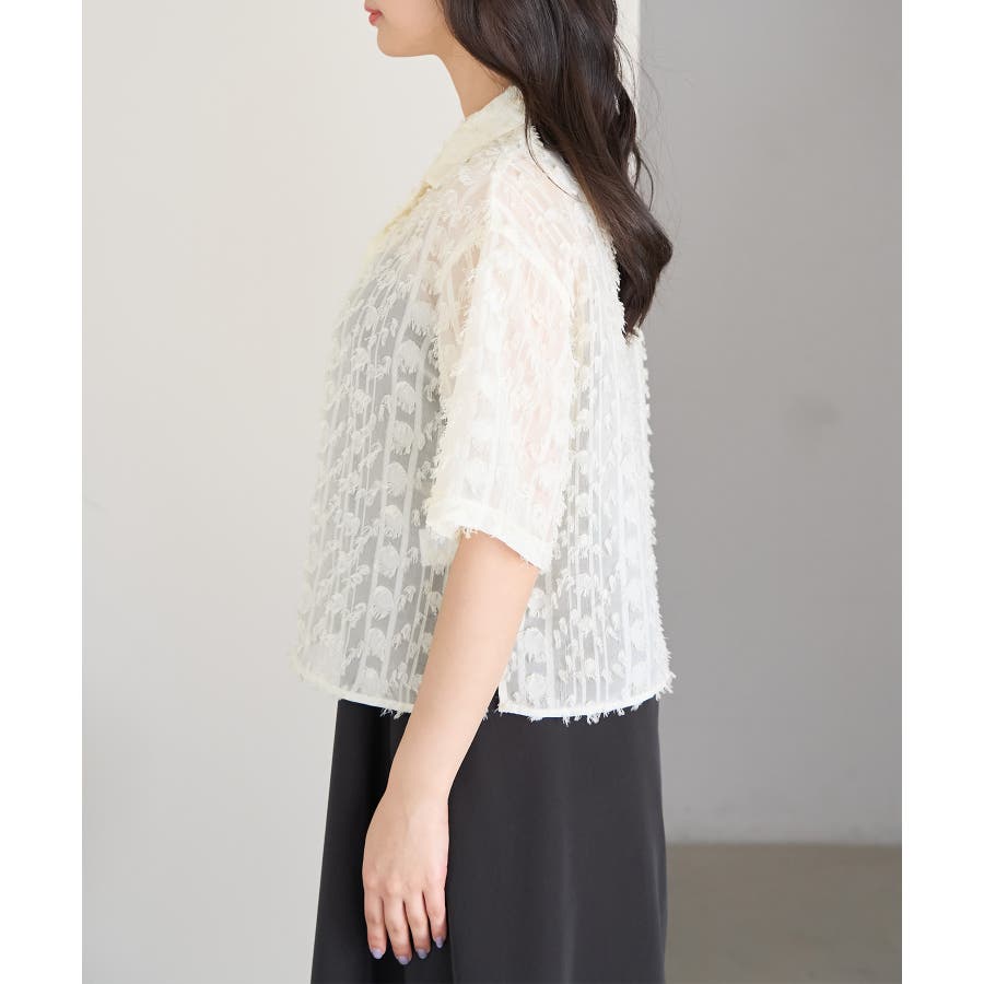 【デザイン・シルエット】 ・ラフなフリンジデザインがポイントのジャカードシャツ。 ・レトロシックなオープンカラーを採用。 ・肘ほどまでの5分袖。 ・身頃を拾わないボックスシルエット。 【カラー】 ・ブラック、アイボリーのモノトーンカラー2色展開。 【スタイリングポイント】 ・ショートパンツに合わせてリラクシーなスタイルに。 ・カットソーやワンピースなどの羽織にしてもOK。 ----------------------------- 裏地:なし 透け感:あり 伸縮性:なし 生地感・厚さ:やや薄手 ポケット:なし ボタン:全て開閉可能 季節:春・夏 ----------------------------- ※撮影時の光、お使いのモニター環境によって色の見え方が違う場合がございます。 ※モデル身長:165cm 着用サイズ:38