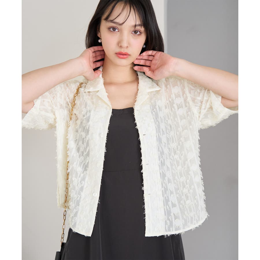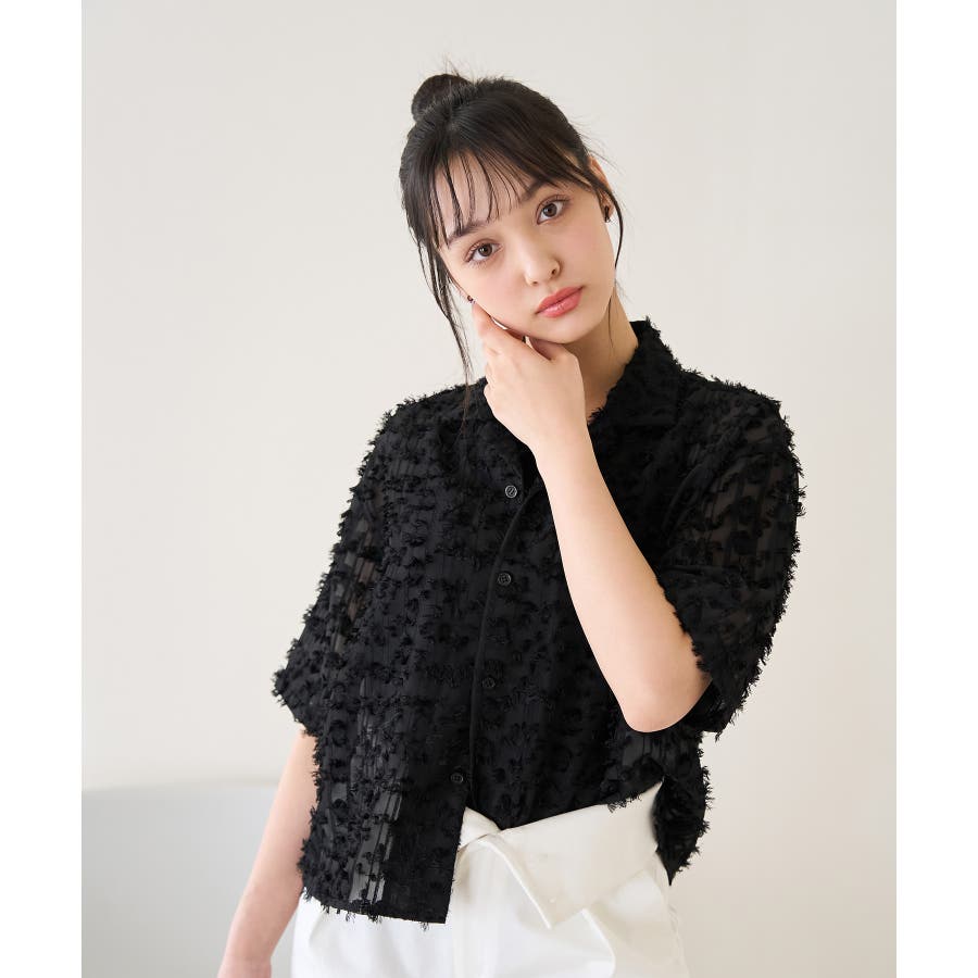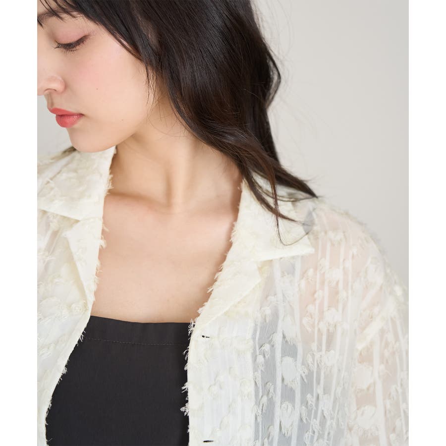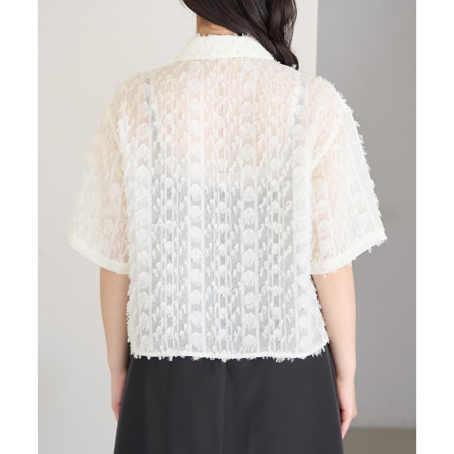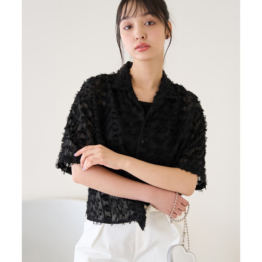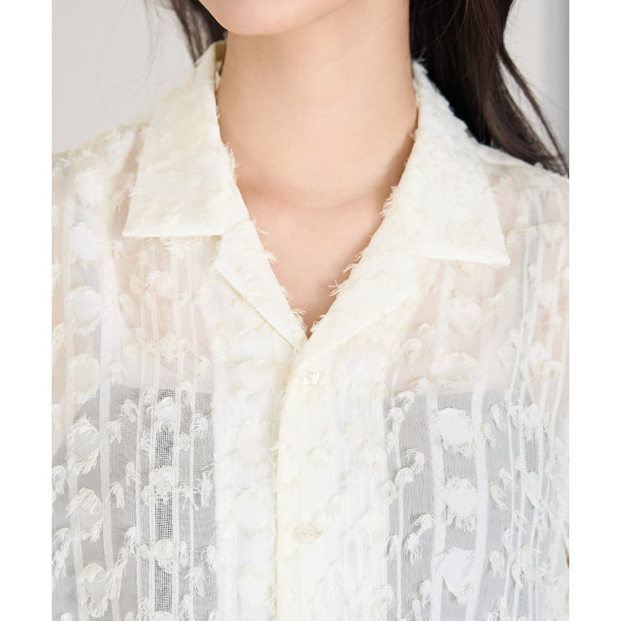 【デザイン・シルエット】 ・ラフなフリンジデザインがポイントのジャカードシャツ。 ・レトロシックなオープンカラーを採用。 ・肘ほどまでの5分袖。 ・身頃を拾わないボックスシルエット。 【カラー】 ・ブラック、アイボリーのモノトーンカラー2色展開。 【スタイリングポイント】 ・ショートパンツに合わせてリラクシーなスタイルに。 ・カットソーやワンピースなどの羽織にしてもOK。 ----------------------------- 裏地:なし 透け感:あり 伸縮性:なし 生地感・厚さ:やや薄手 ポケット:なし ボタン:全て開閉可能 季節:春・夏 ----------------------------- ※撮影時の光、お使いのモニター環境によって色の見え方が違う場合がございます。 ※モデル身長:165cm 着用サイズ:38