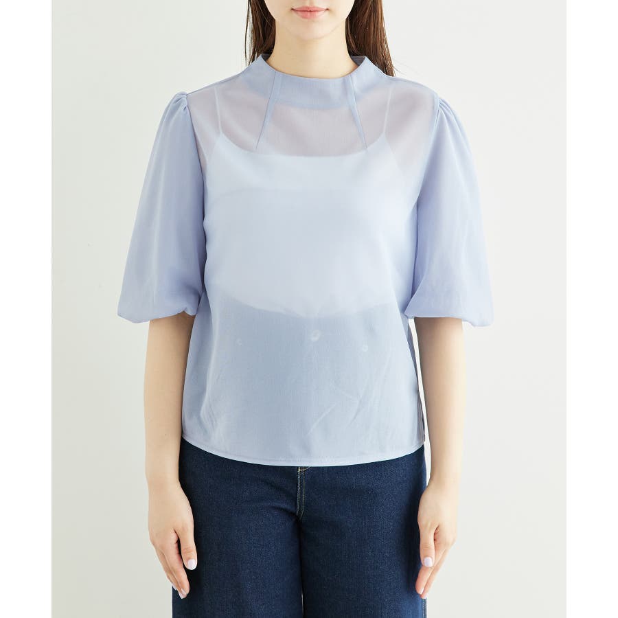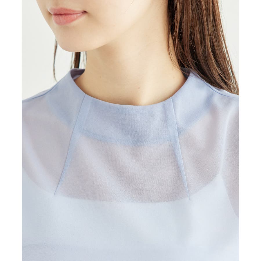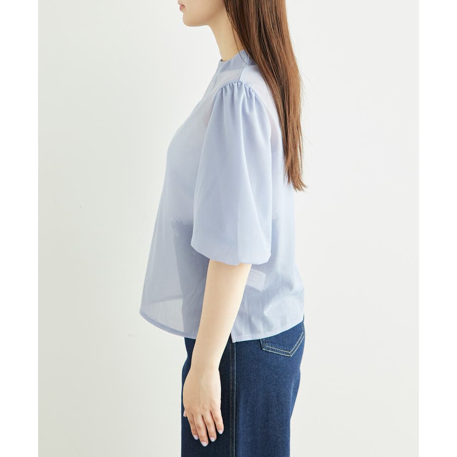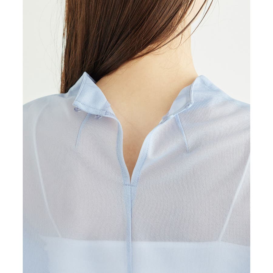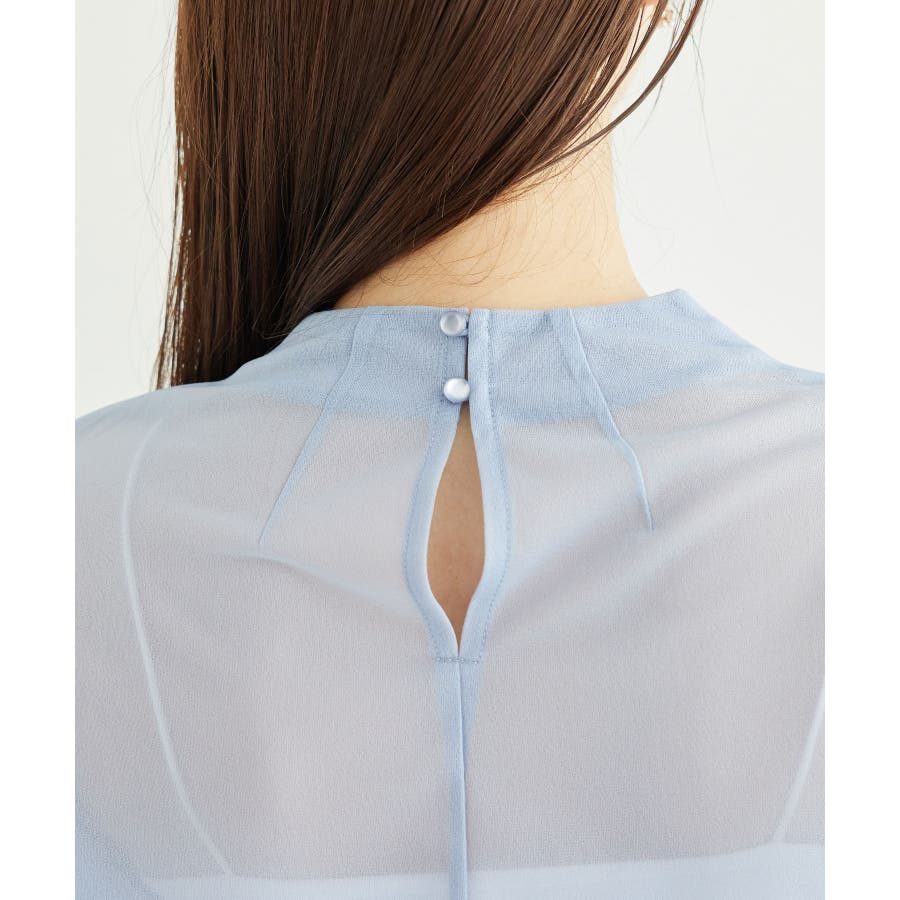 【素材感】 ・日本の繊細な素材を使用した、シアーブラウス。 ・やや光沢感のある上品な素材。 【デザイン・シルエット】 ・タックを入れた特徴的なボトルネックや、エレガントなボリュームスリーブがポイントのデザイン。 ・身頃はすっきりとシンプルにフィニッシュ。 【カラー】 ・ブラック、オフホワイト、サックスブルーの3色展開。 【スタイリングポイント】 ・キャミソールを重ねて大人なレイヤードコーデを楽しんで。 ・きれいめなテーパードパンツやアイラインスカートに合わせてお仕事やお出かけ着に。 ・総柄のスカートを合わせて華やかにするのも素敵。 ----------------------------- 裏地:なし 透け感:あり 伸縮性:なし 生地感・厚さ:やや薄手 ボタン:後ろボタン開閉可能 季節:春・夏 ----------------------------- ※撮影時の光、お使いのモニター環境によって色の見え方が違う場合がございます。 ※モデル身長:163cm 着用サイズ:38