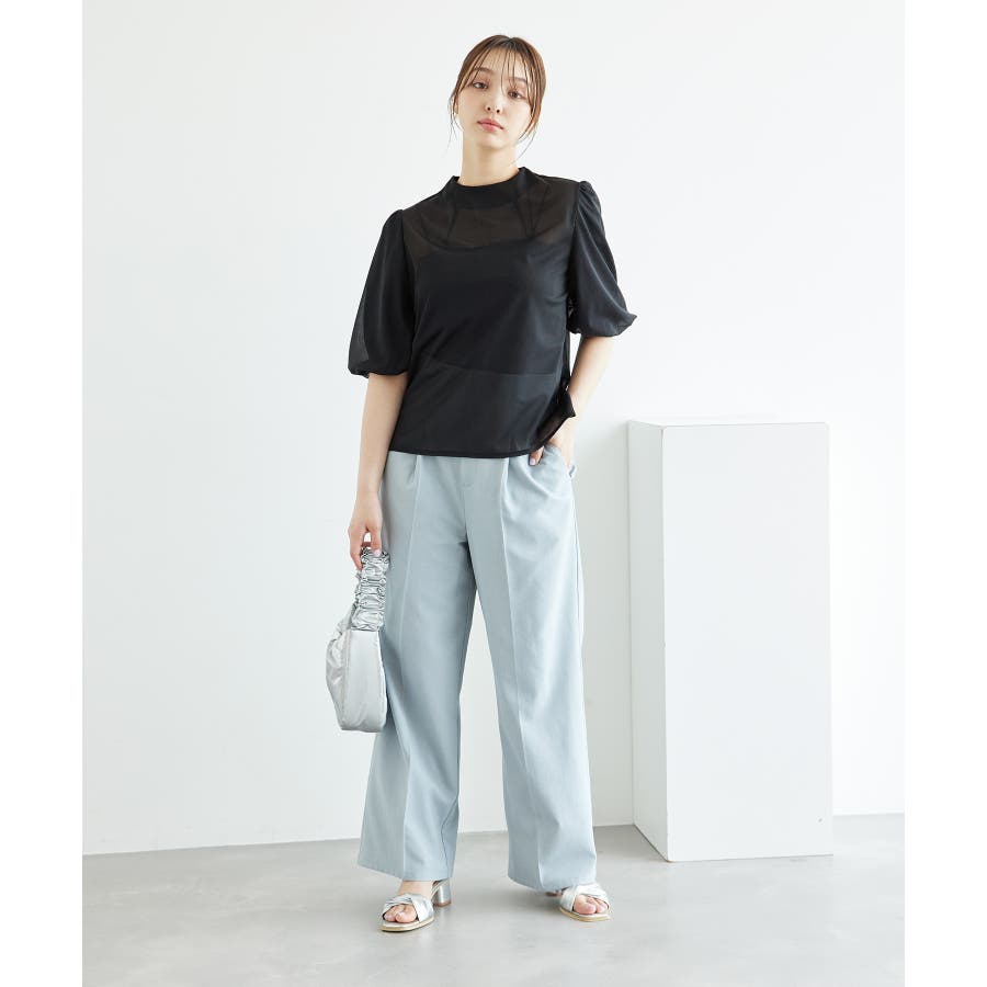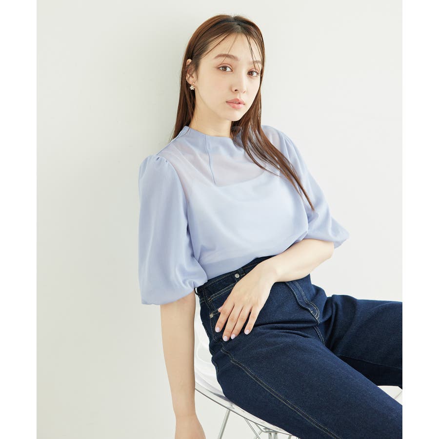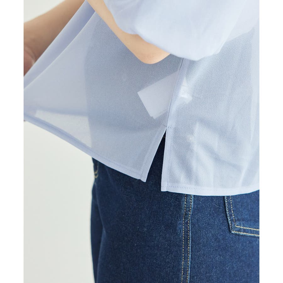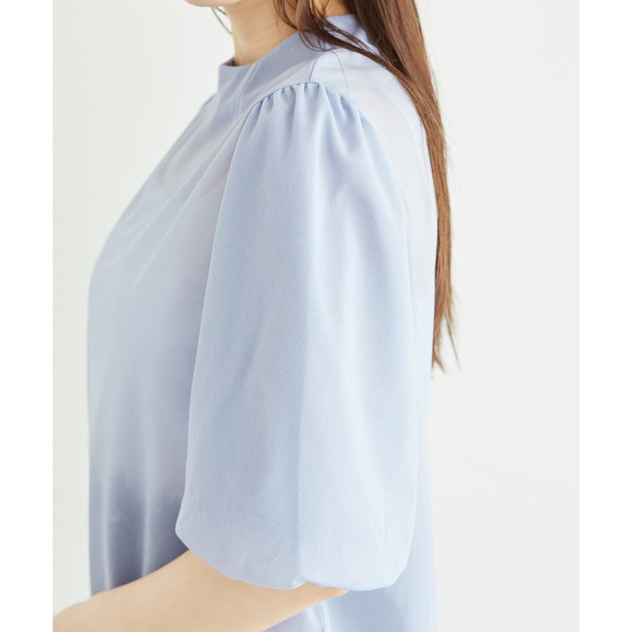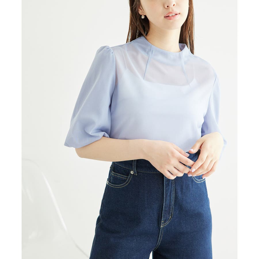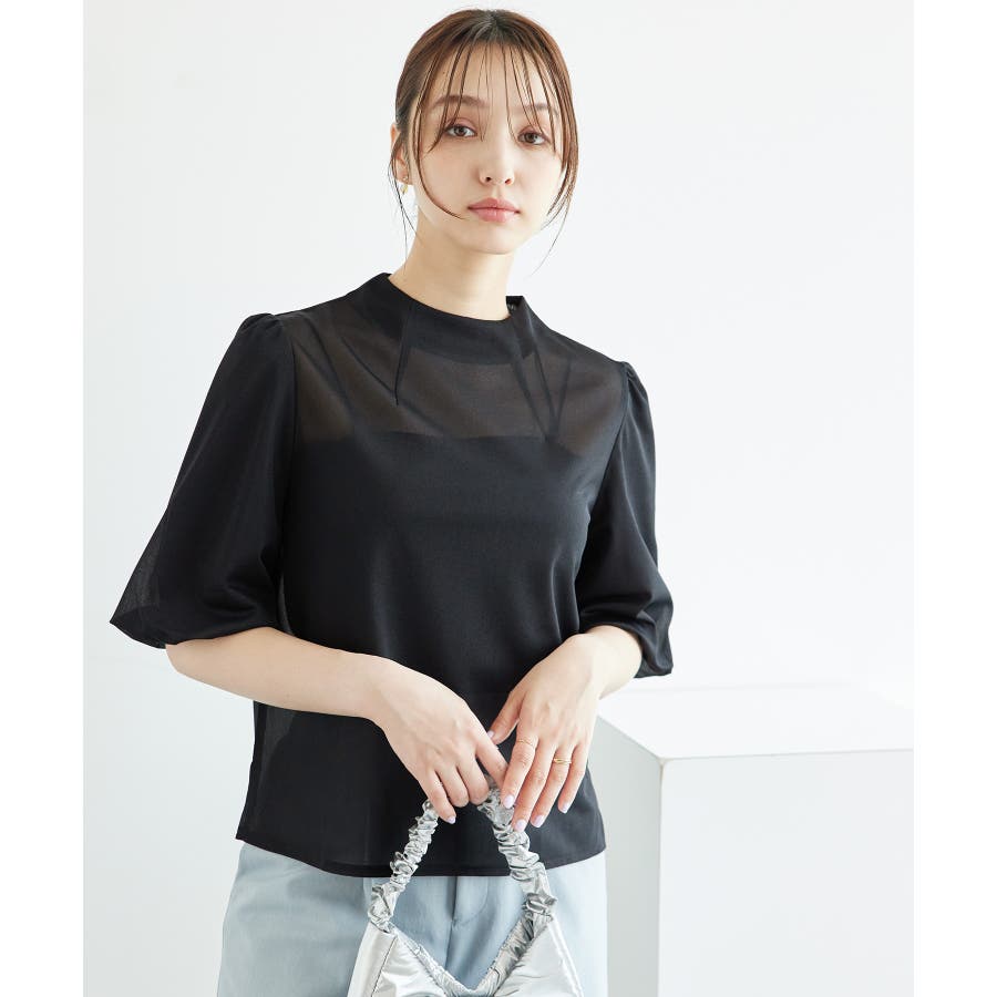 【素材感】 ・日本の繊細な素材を使用した、シアーブラウス。 ・やや光沢感のある上品な素材。 【デザイン・シルエット】 ・タックを入れた特徴的なボトルネックや、エレガントなボリュームスリーブがポイントのデザイン。 ・身頃はすっきりとシンプルにフィニッシュ。 【カラー】 ・ブラック、オフホワイト、サックスブルーの3色展開。 【スタイリングポイント】 ・キャミソールを重ねて大人なレイヤードコーデを楽しんで。 ・きれいめなテーパードパンツやアイラインスカートに合わせてお仕事やお出かけ着に。 ・総柄のスカートを合わせて華やかにするのも素敵。 ----------------------------- 裏地:なし 透け感:あり 伸縮性:なし 生地感・厚さ:やや薄手 ボタン:後ろボタン開閉可能 季節:春・夏 ----------------------------- ※撮影時の光、お使いのモニター環境によって色の見え方が違う場合がございます。 ※モデル身長:163cm 着用サイズ:38
