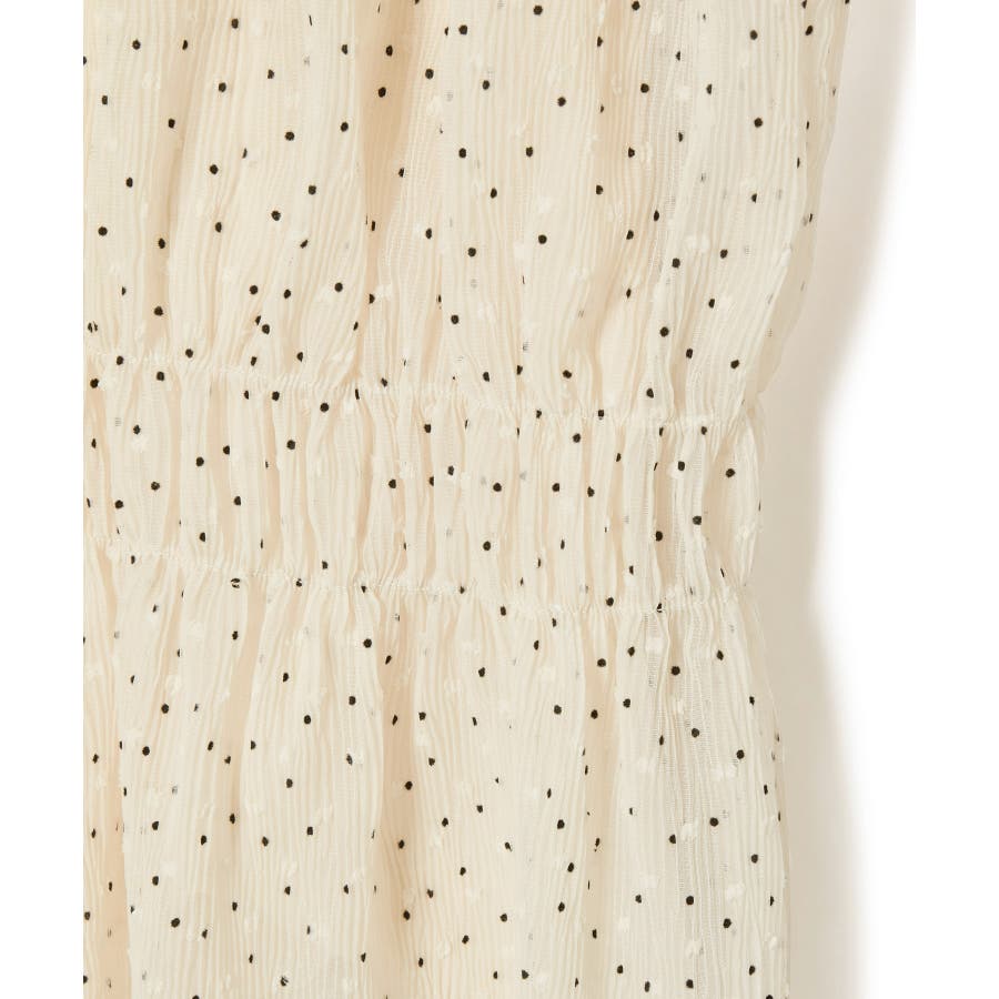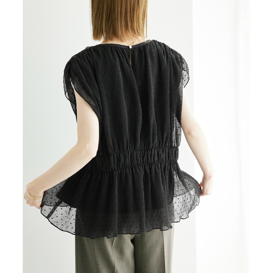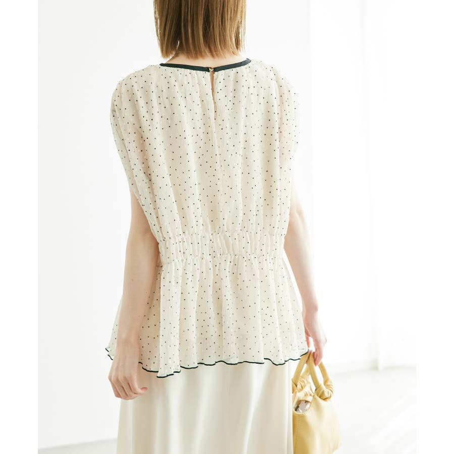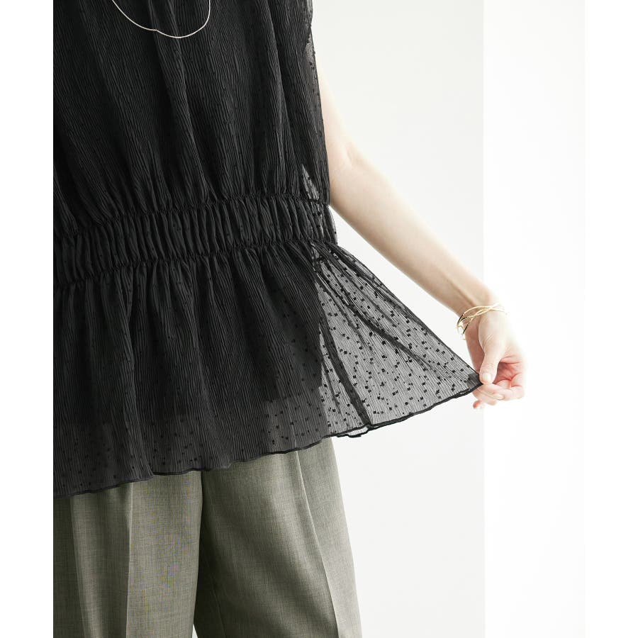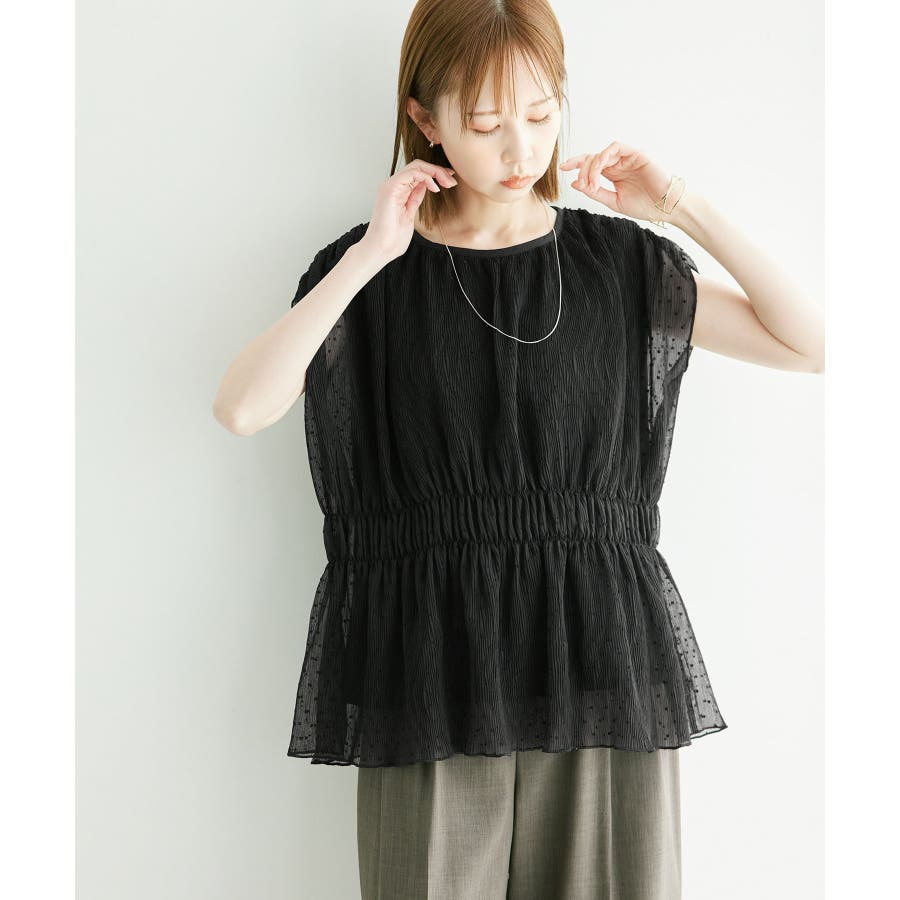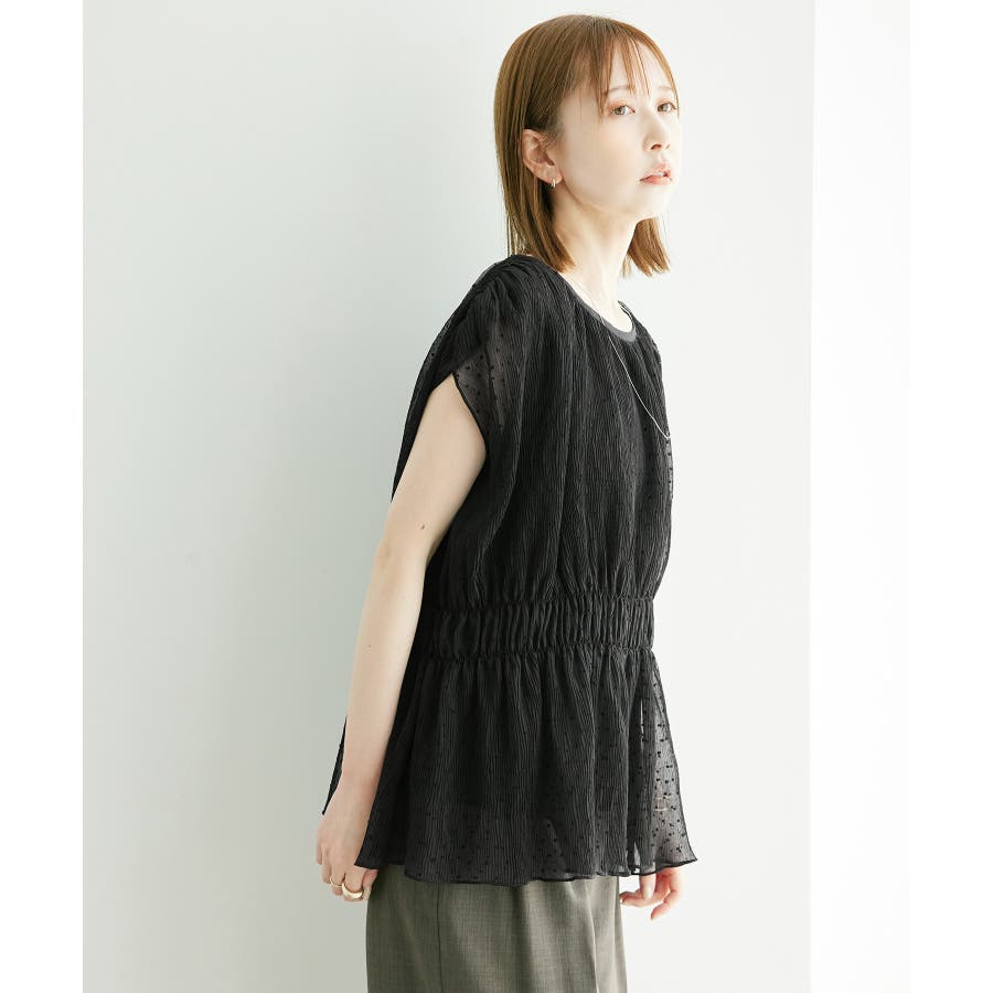 【素材感】 ・楊柳調の素材にジャガードとフロッキードットを施したアイテム。 【デザイン・シルエット】 ・ハイウエスト位置でギュッとギャザーを入れた、プルオーバー型のシャーリングブラウス。 ・着丈がやや長めのチュニックタイプ。 ・肩のラインが自然なフレンチスリーブデザイン。 【カラー】 ・ブラック、ホワイトのモノトーン2色展開。 【スタイリングポイント】 ・フレアジーンズやニットパンツに合わせて、70年代のヒッピーな着こなしに。 ・シンプルなスティックパンツにIラインスカートで、きれいめなお出かけ着にも。 ----------------------------- 裏地:あり 透け感:裏地がない部分はややあり 伸縮性:なし 生地感・厚さ:やや薄手 ボタン:開閉可能 ウエスト:シャーリング 季節:夏 ----------------------------- ※撮影時の光、お使いのモニター環境によって色の見え方が違う場合がございます。 ※モデル身長:165cm 着用サイズ:38