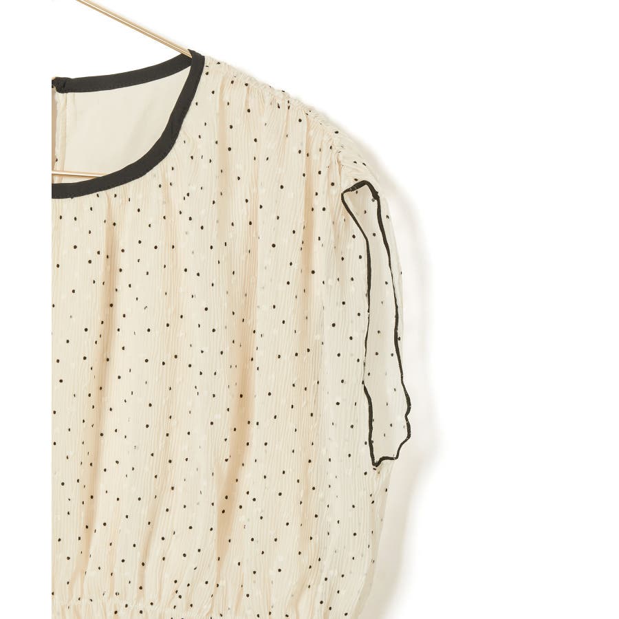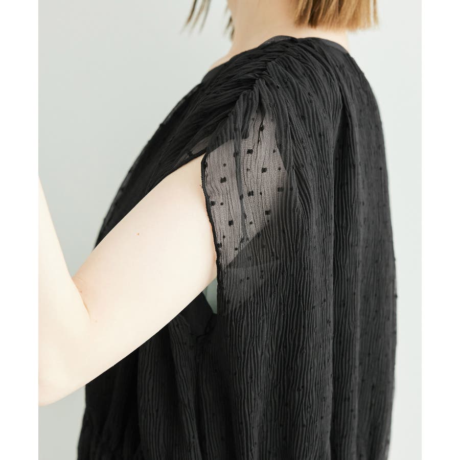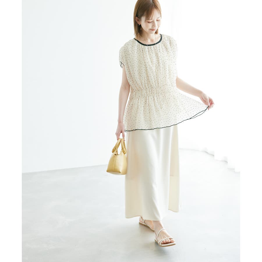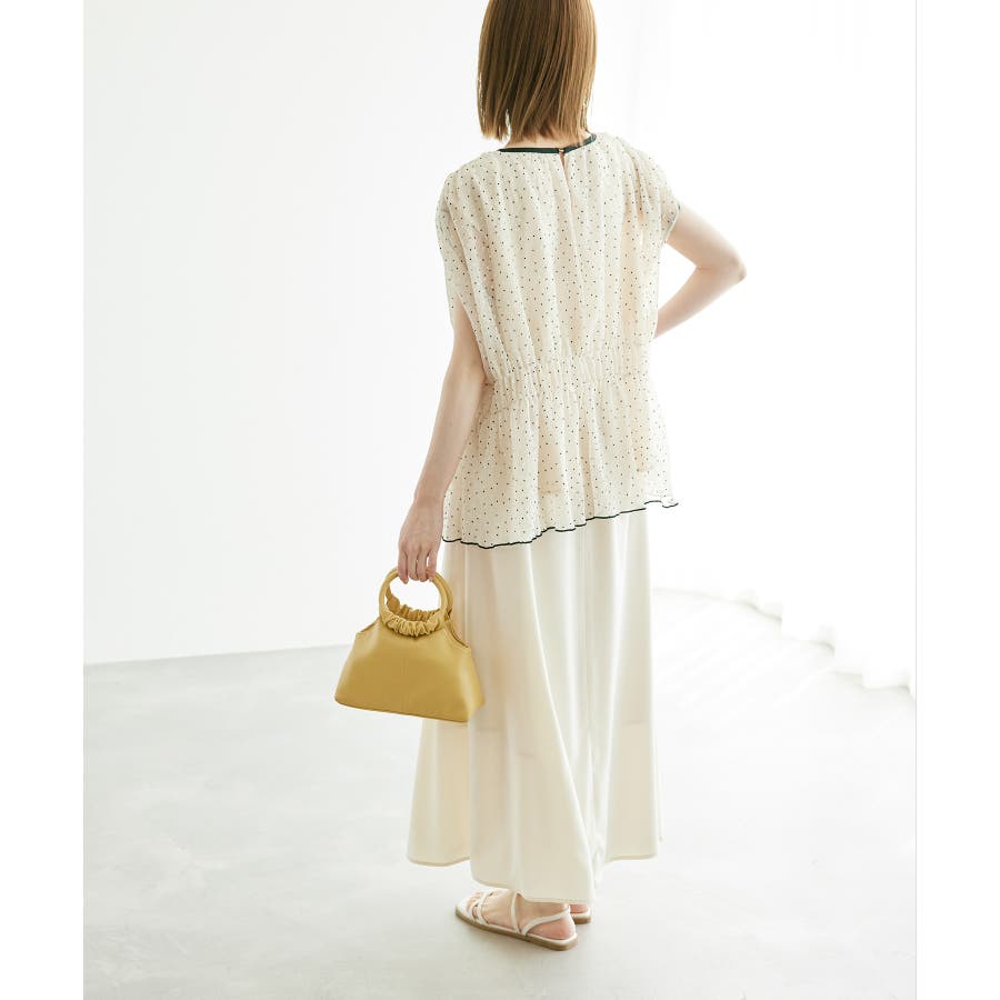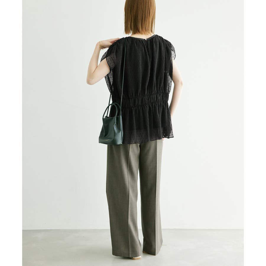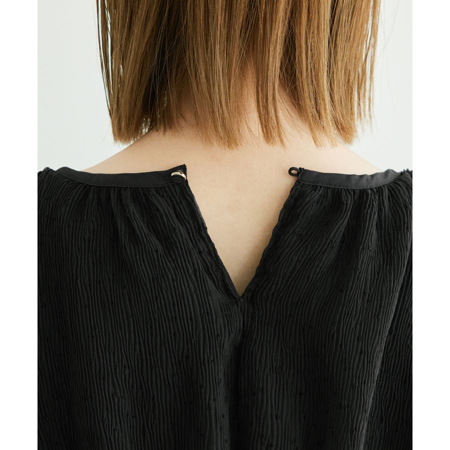 【素材感】 ・楊柳調の素材にジャガードとフロッキードットを施したアイテム。 【デザイン・シルエット】 ・ハイウエスト位置でギュッとギャザーを入れた、プルオーバー型のシャーリングブラウス。 ・着丈がやや長めのチュニックタイプ。 ・肩のラインが自然なフレンチスリーブデザイン。 【カラー】 ・ブラック、ホワイトのモノトーン2色展開。 【スタイリングポイント】 ・フレアジーンズやニットパンツに合わせて、70年代のヒッピーな着こなしに。 ・シンプルなスティックパンツにIラインスカートで、きれいめなお出かけ着にも。 ----------------------------- 裏地:あり 透け感:裏地がない部分はややあり 伸縮性:なし 生地感・厚さ:やや薄手 ボタン:開閉可能 ウエスト:シャーリング 季節:夏 ----------------------------- ※撮影時の光、お使いのモニター環境によって色の見え方が違う場合がございます。 ※モデル身長:165cm 着用サイズ:38