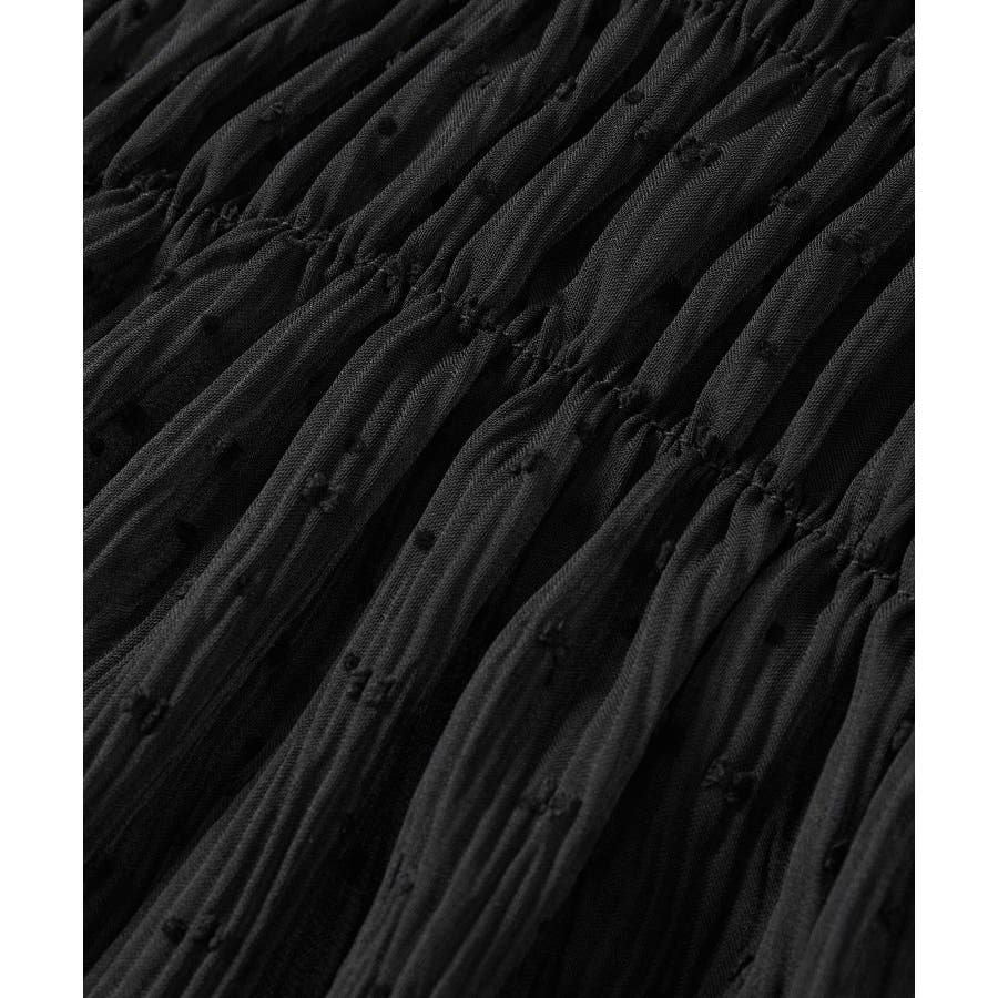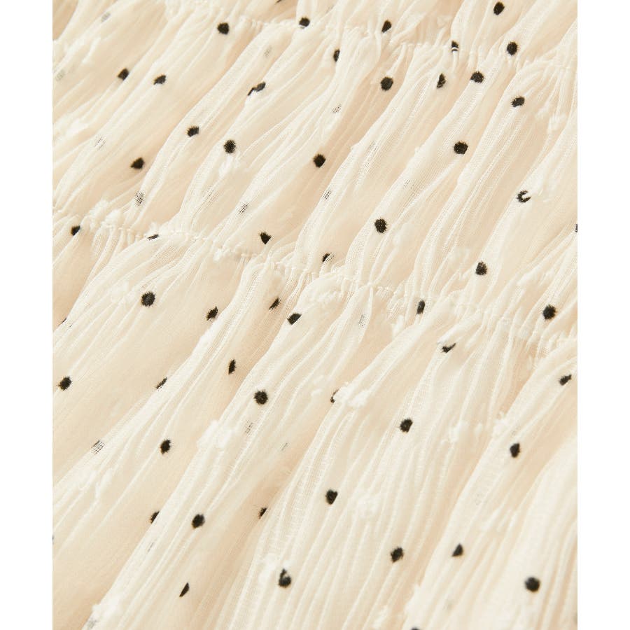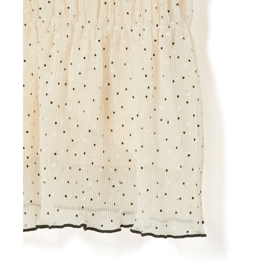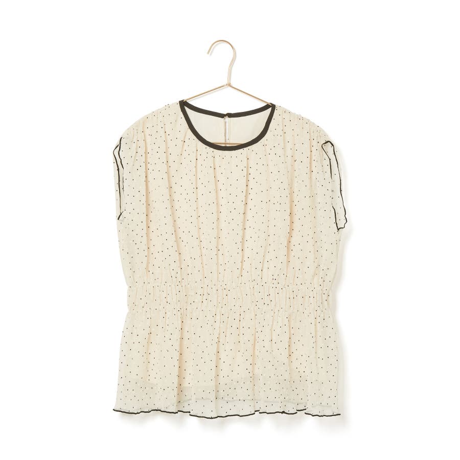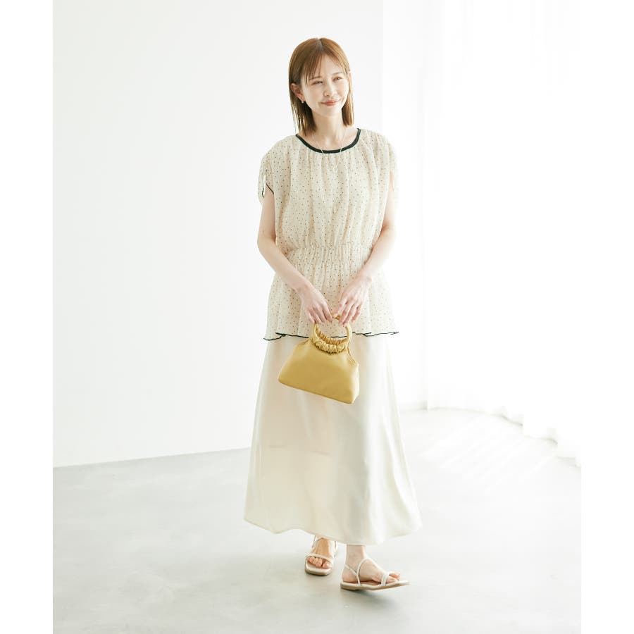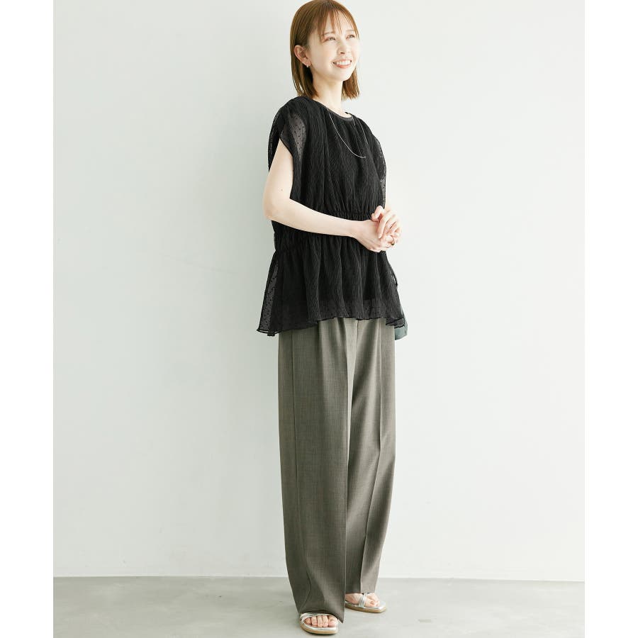 【素材感】 ・楊柳調の素材にジャガードとフロッキードットを施したアイテム。 【デザイン・シルエット】 ・ハイウエスト位置でギュッとギャザーを入れた、プルオーバー型のシャーリングブラウス。 ・着丈がやや長めのチュニックタイプ。 ・肩のラインが自然なフレンチスリーブデザイン。 【カラー】 ・ブラック、ホワイトのモノトーン2色展開。 【スタイリングポイント】 ・フレアジーンズやニットパンツに合わせて、70年代のヒッピーな着こなしに。 ・シンプルなスティックパンツにIラインスカートで、きれいめなお出かけ着にも。 ----------------------------- 裏地:あり 透け感:裏地がない部分はややあり 伸縮性:なし 生地感・厚さ:やや薄手 ボタン:開閉可能 ウエスト:シャーリング 季節:夏 ----------------------------- ※撮影時の光、お使いのモニター環境によって色の見え方が違う場合がございます。 ※モデル身長:165cm 着用サイズ:38