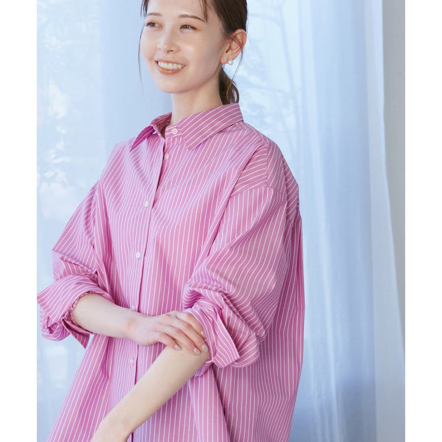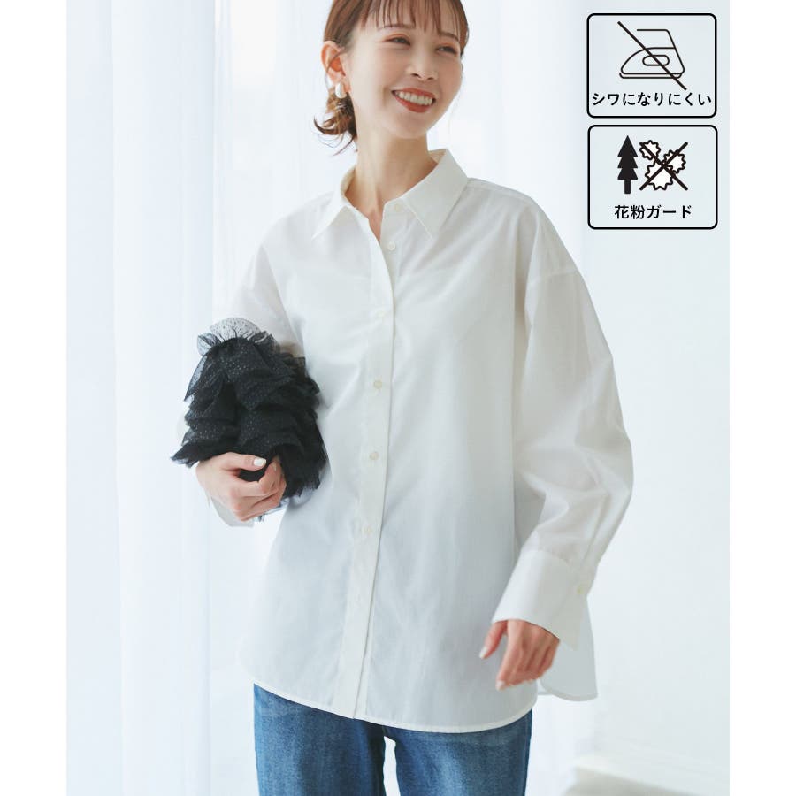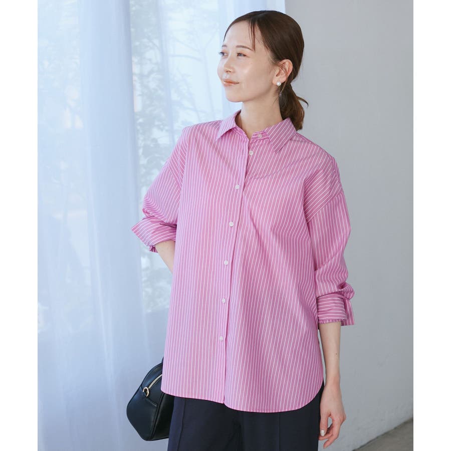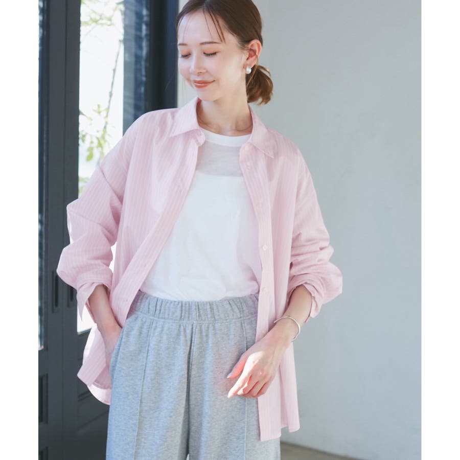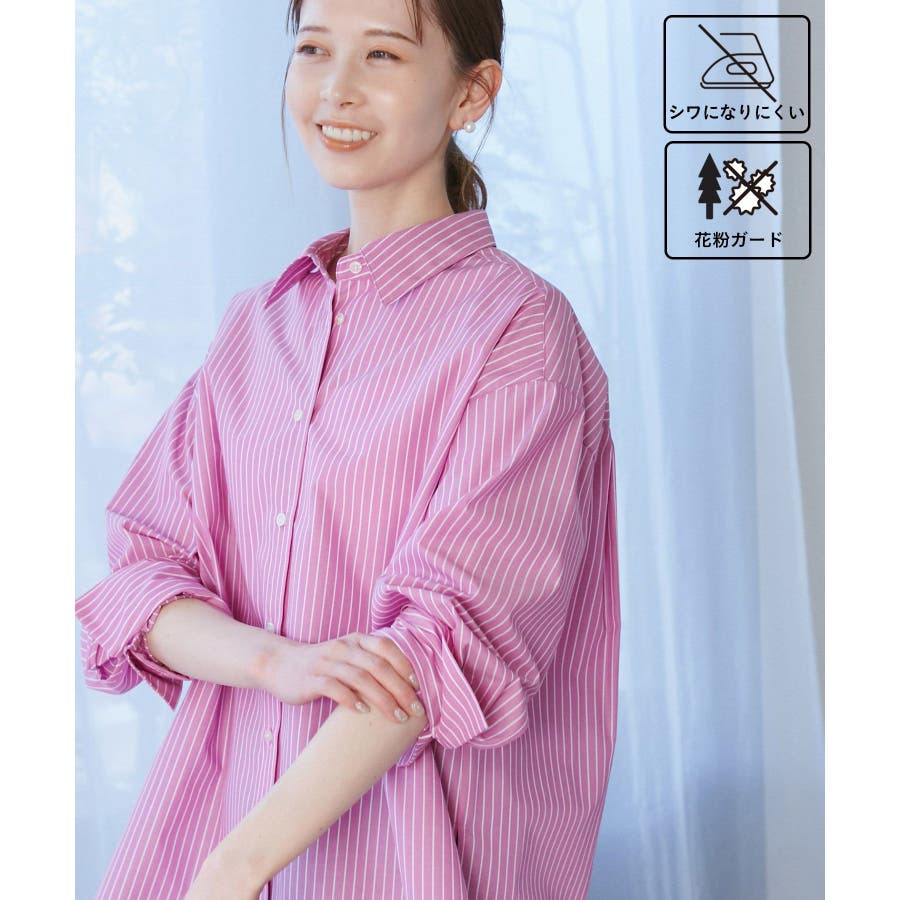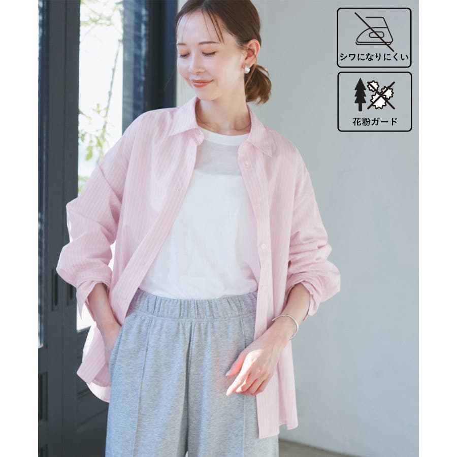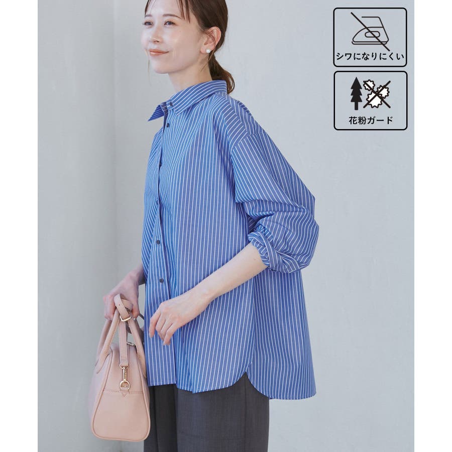 【素材感】 ・花粉が付着しにくく、落としやすい素材。 ・変形後の回復性に優れたシワになりにくい素材。 【デザイン・シルエット】 ・ルーズフィットのメンズライクな長袖レギュラータイプ。 ・ドロップした方の切り替えや、ラウンドヘムでリラックス感を演出。 ・裾は前後差あり。 ・同シリーズでクロップドタイプ(品番:GDH15050)も展開。 【カラー】 ・カラーによって柄が異なります。 オフホワイト(15)ピンク(63):無地 ブルー(44)ローズピンク(64):ストライプ 【スタイリングポイント】 ・春は一枚着に、暖かくなったらTシャツやタンクトップの羽織にも活躍。 ・ハイウエストボトムにインすると、今っぽいシルエットバランスに。 ----------------------------- 裏地:なし 透け感:オフホワイト(15)はややあり 伸縮性:なし 生地感・厚さ:普通 季節:春・秋・冬(インナーとしても◎) ----------------------------- ※撮影時の光、お使いのモニター環境によって色の見え方が違う場合がございます。 ※モデル身長:165cm 着用サイズ:38